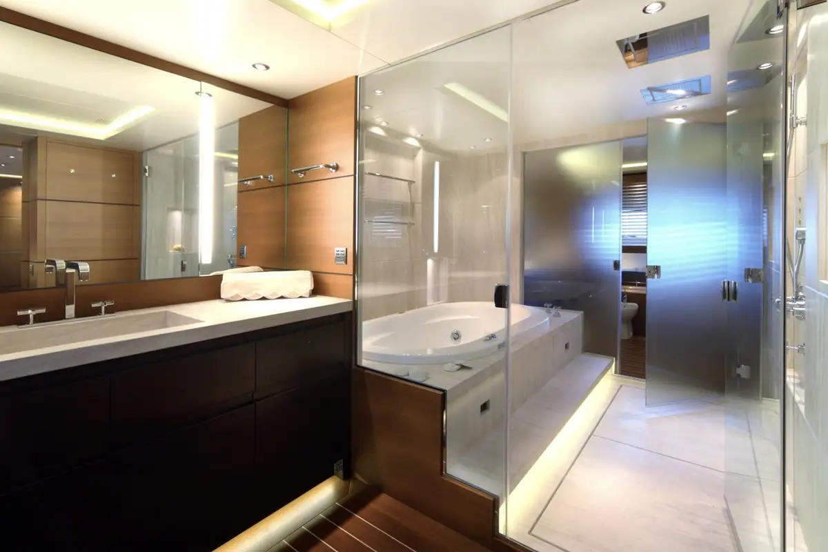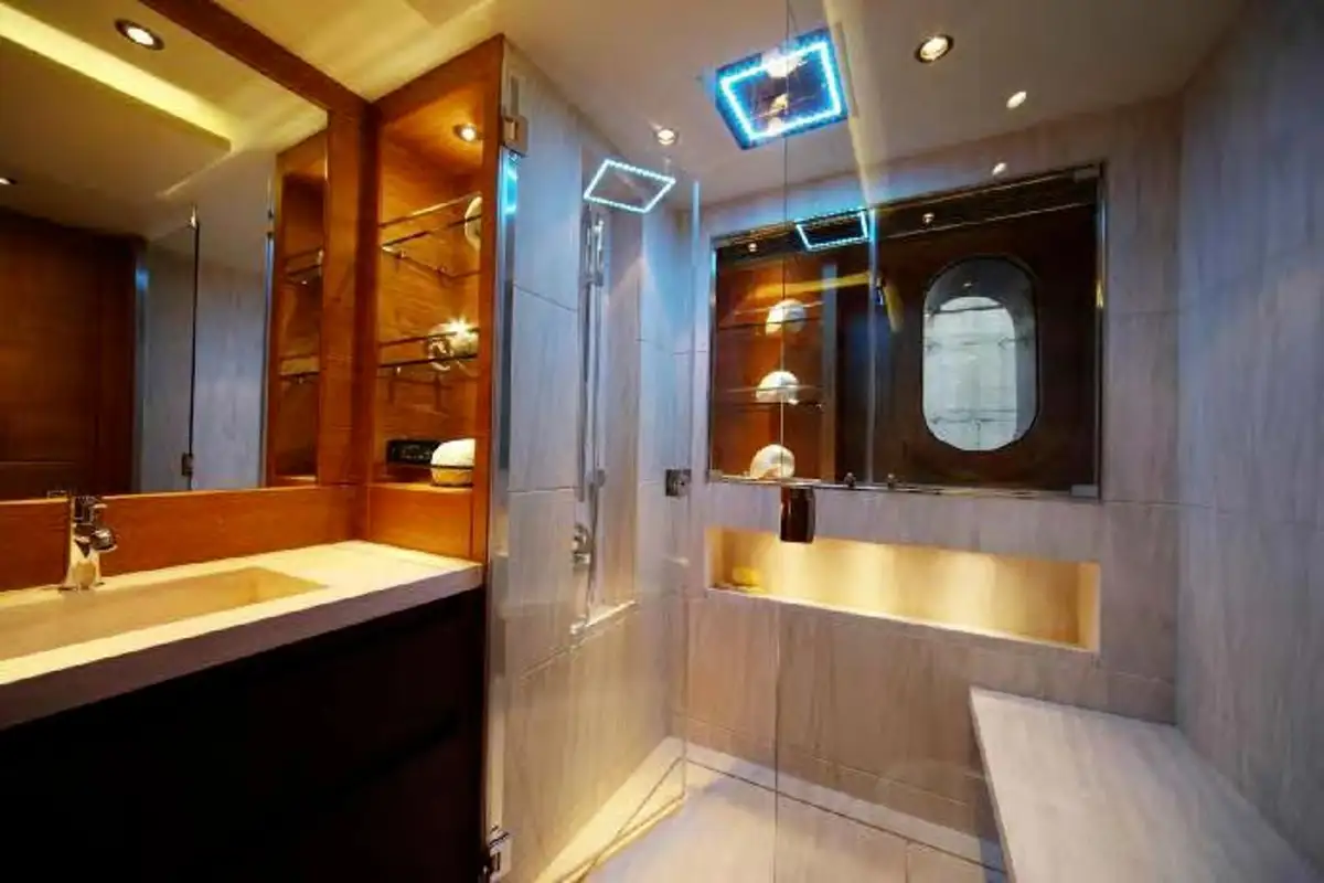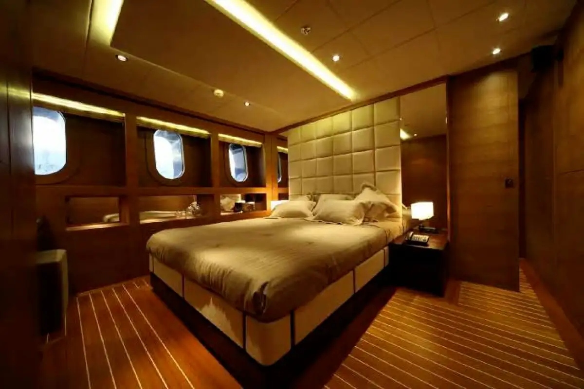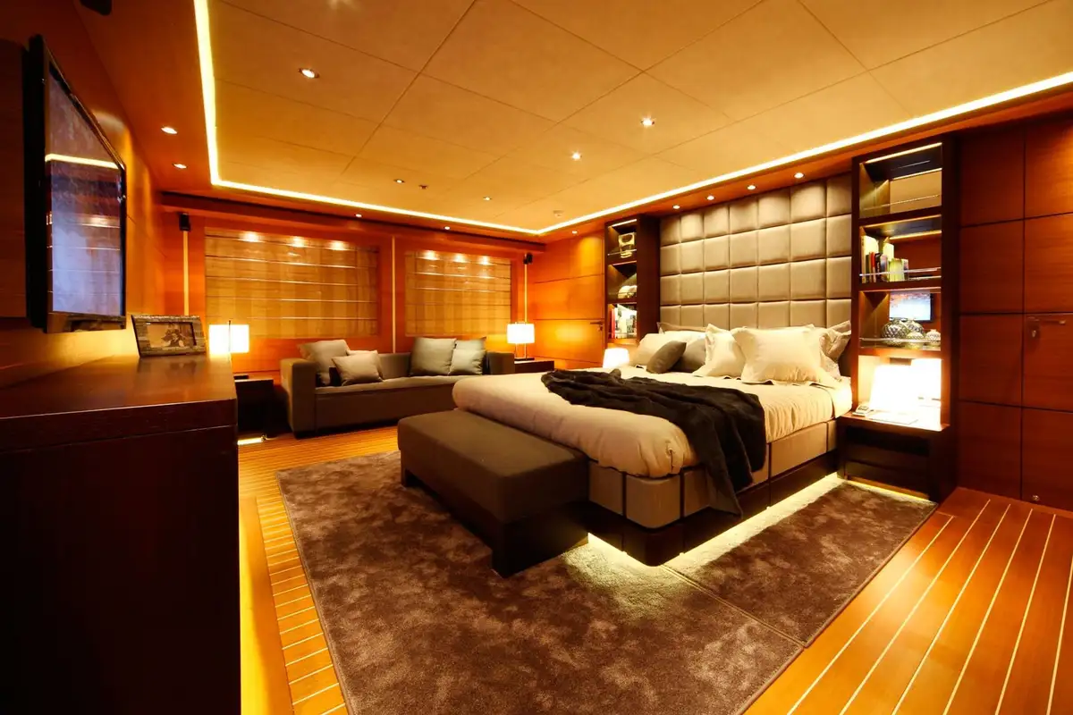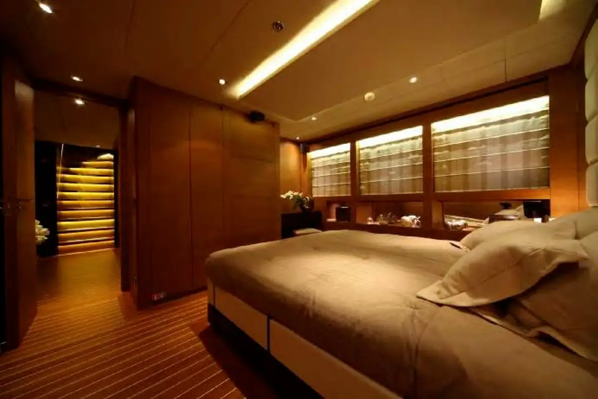 ZALIV III features a dark blue hull with a white superstructure. She offers superb accommodation to 12 guests in six comfortable, Luca Dini designed cabins. Her layout comprises two full beam master staterooms of identical size. One of the master suites is located on the main deck forward, whereas the other can be found on the upper bridge deck. A latter features direct access to the exterior deck. The remaining accommodation includes two double cabins and two twin cabins, all of which are located on the lower deck.