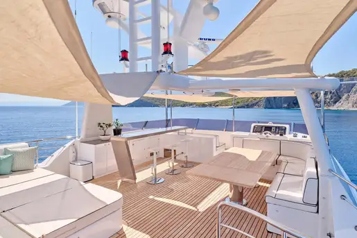She offers spacious accommodation for up to 10 guests in 4 staterooms, with 6 crew to attend to the guests. Her interiors are contemporary and chic, whilst also feeling homely, with a 2.1 m ceiling height creating space and amazing volume on every deck. Her sizeable garage stores a large array of water sports toys, including underwater scooters, several towable toys and an inflatable netted pool. Her 50 square metre sundeck and ample sunbathing area on the foredeck make 3D fit for both the explorers’ soul as well as those just looking for relaxation. So, whether you are embarking on a journey of underwater discovery, indulging in a fishing excursion, enjoying the multitude of other water sports toys, or simply just soaking up the sun and breath-taking scenery of Greece and Croatia, 3D is the perfect yacht offering fantastic seakeeping and luxury combined.