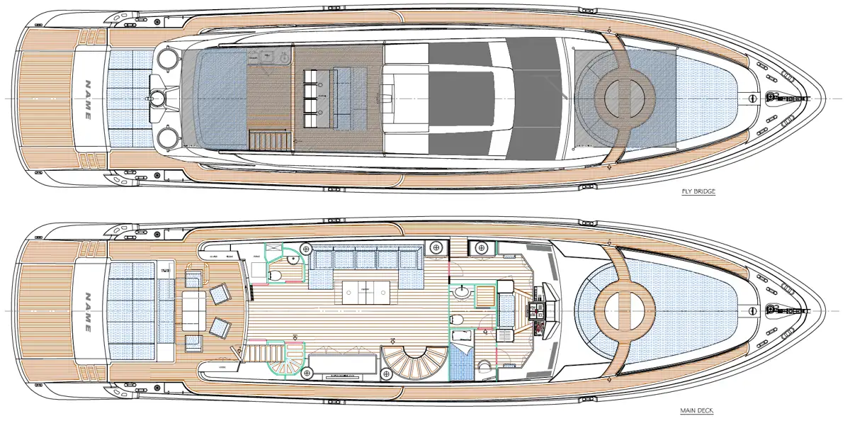 The spacious main deck lounge features a large sofa with a light-shade fabric and an internal dining table. The flexible flybridge has an outdoor table and a large sunbathing area, with a Bimini hardtop provided throughout the flybridge so that guests can relax and enjoy the shade or the sun. On the main deck aft, there is a dining and seating area with a folding television, a barbecue, a fridge and a large sunbathing area. On the foredeck, there is a large sunbathing area with a wide round sofa that can comfortably seat up to 14 people.