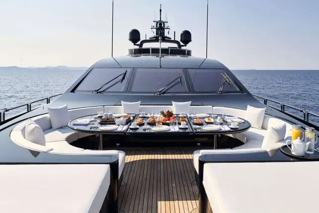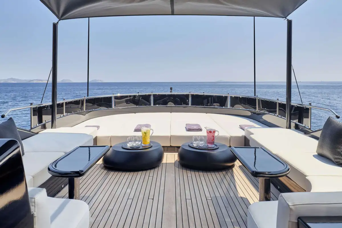Ascending to the sundeck and you’ll be greeted by a space designed for relaxation and enjoyment of the sun. A vast sunpad forward provides the perfect spot for soaking up rays, while the seating next to it offers a comfortable retreat.
