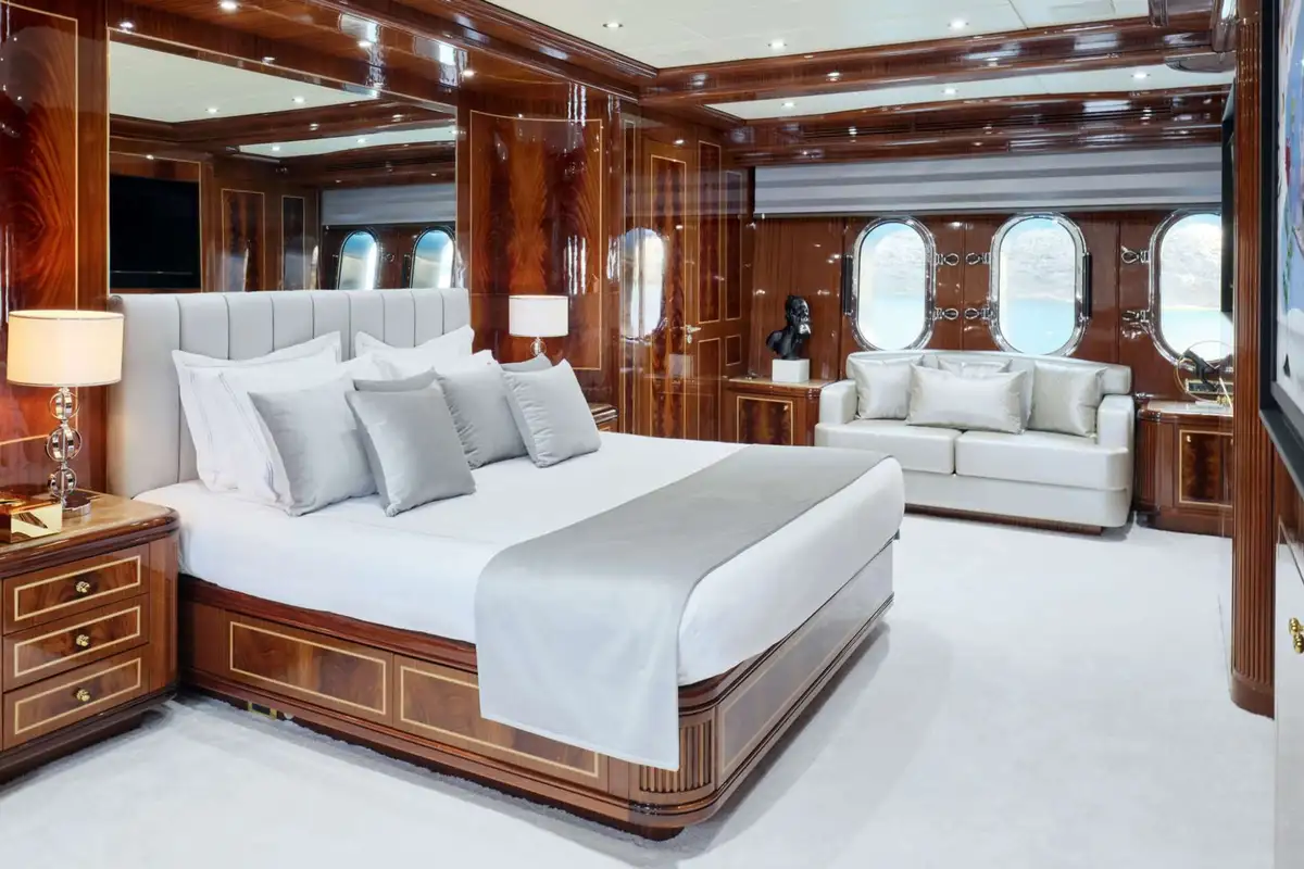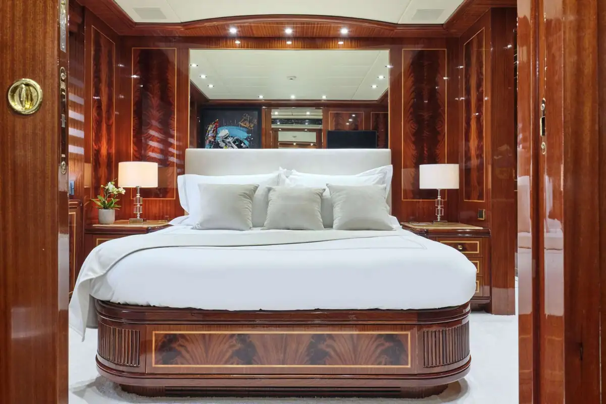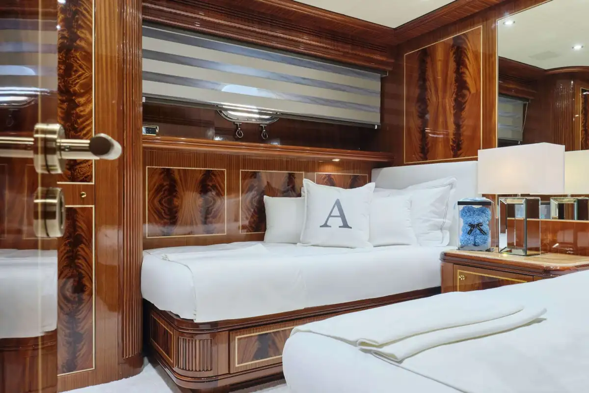 ABILITY's guest suites continue the theme of classic luxury, with finely patterned veneers and high-quality finishes throughout. Each suite is a showcase of craftsmanship, offering a serene retreat for guests. The full-beam master suite, located on the lower deck, is a haven of comfort and sophistication. With a king-sized berth, a sumptuous seating area, and private office space, it’s a stunning sanctuary.