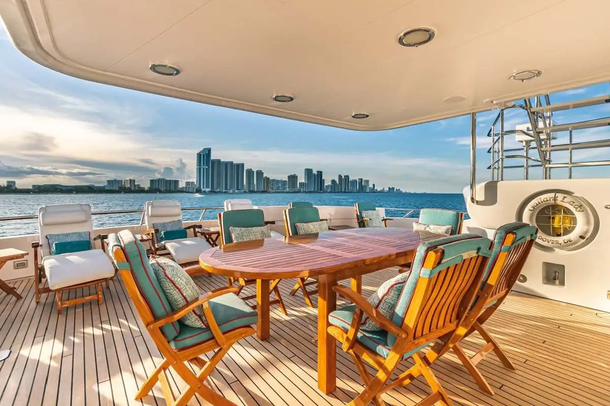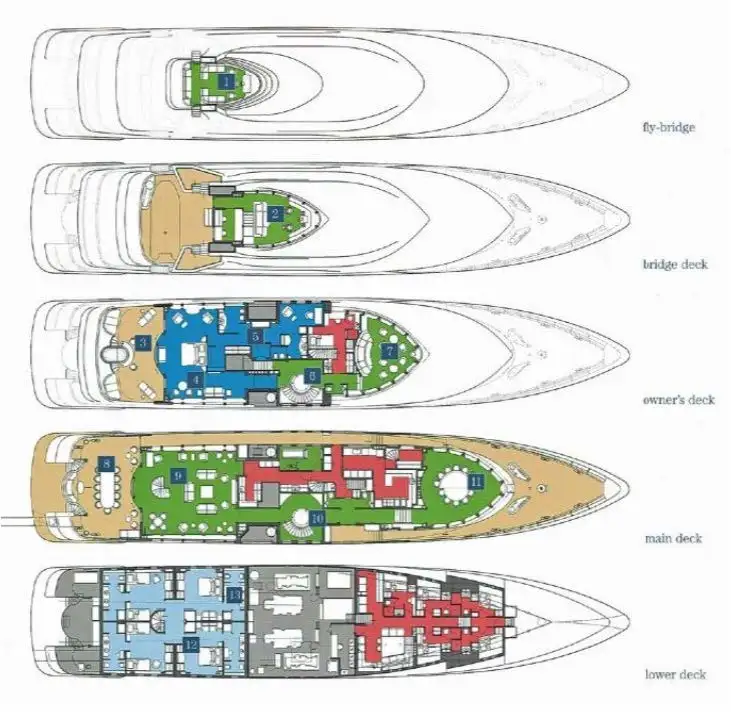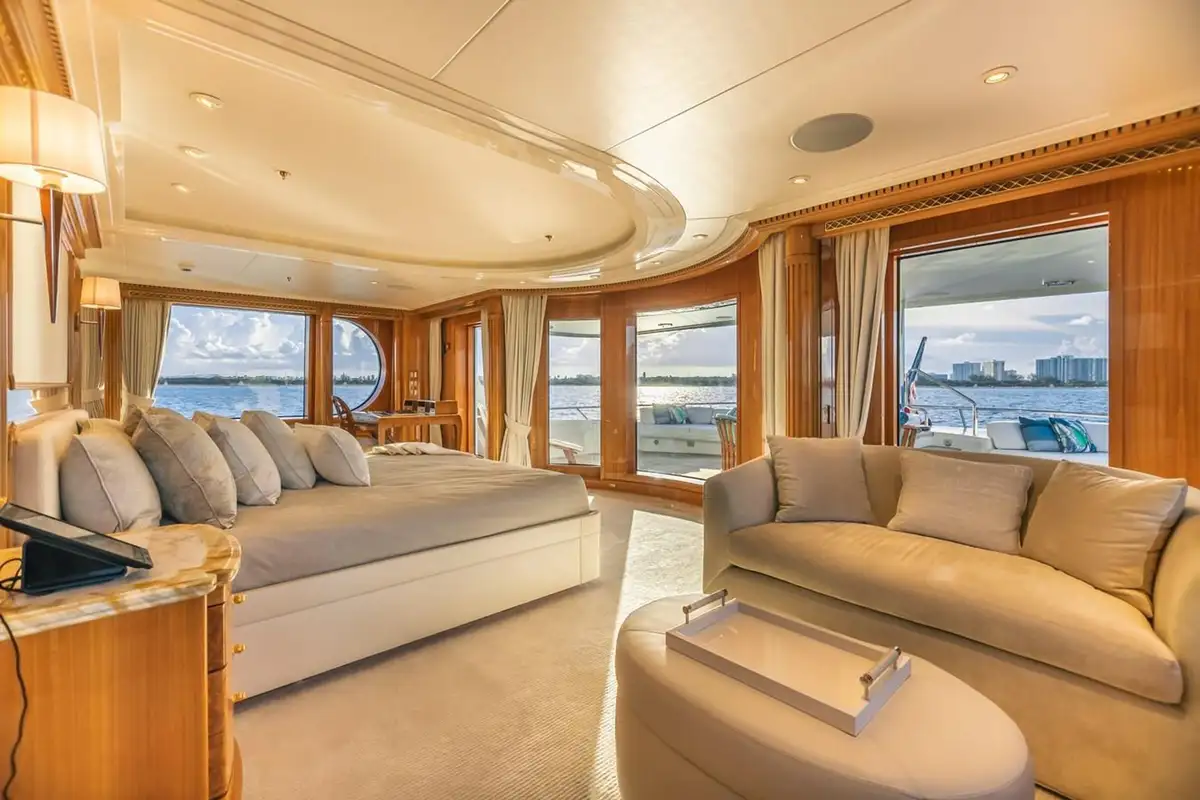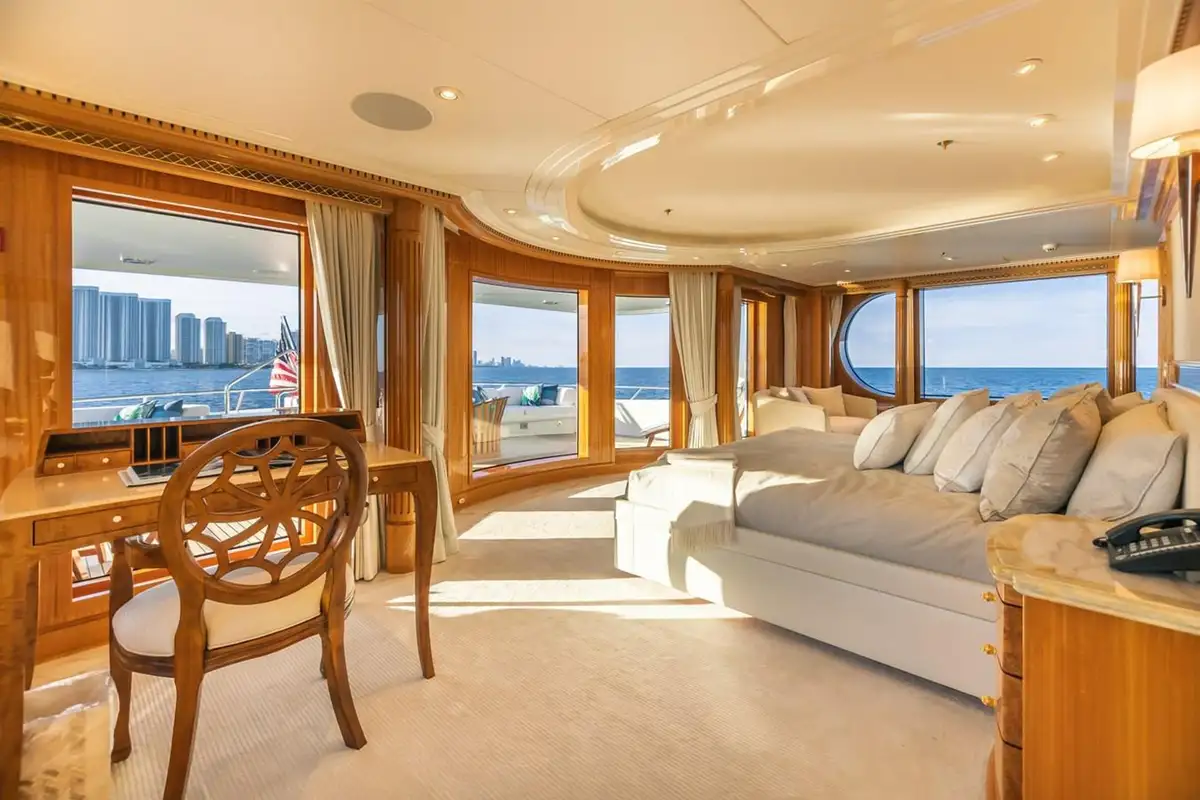 - A glass elevator serving the main deck, the owner's deck, the pantry, and the aft deck dining area