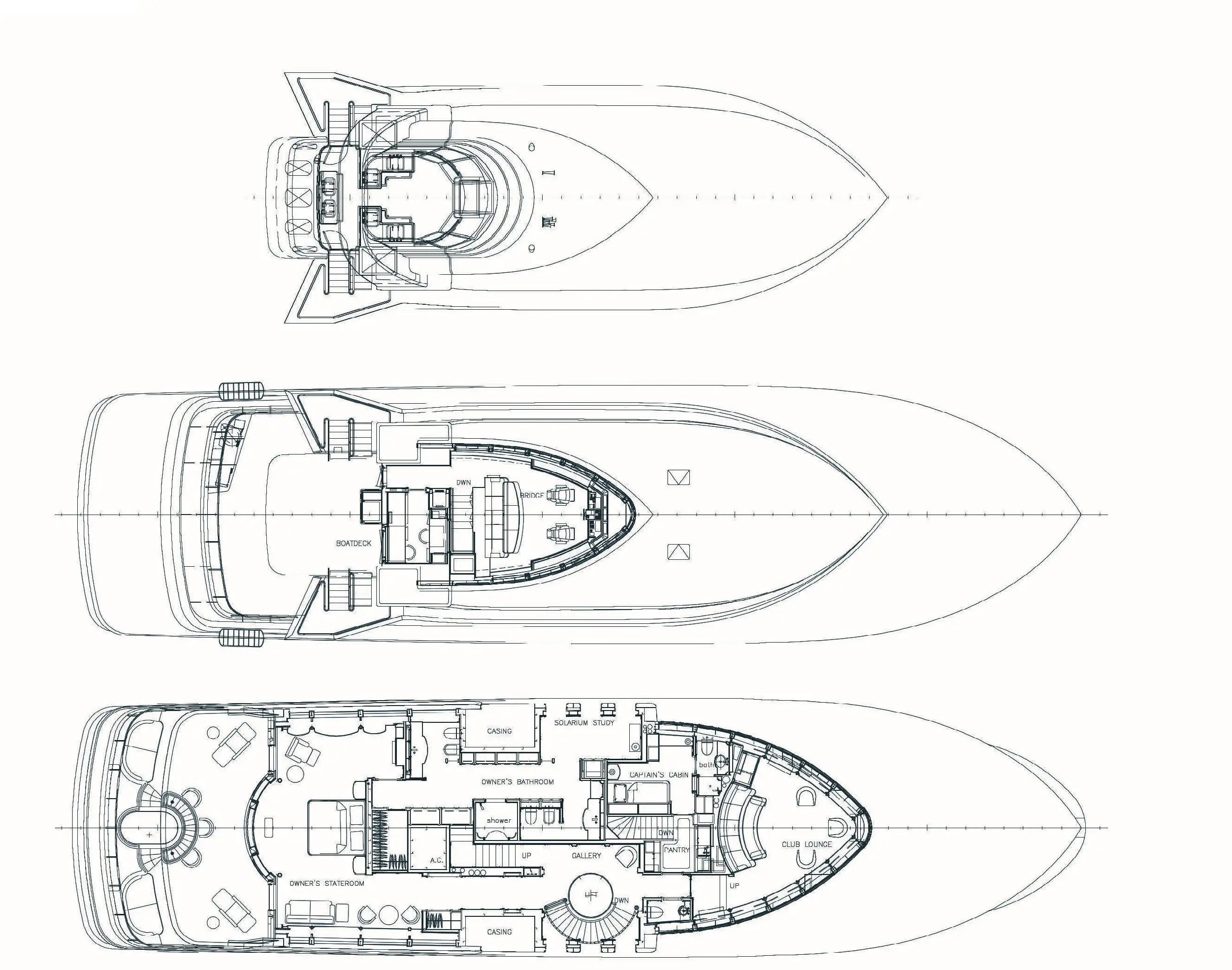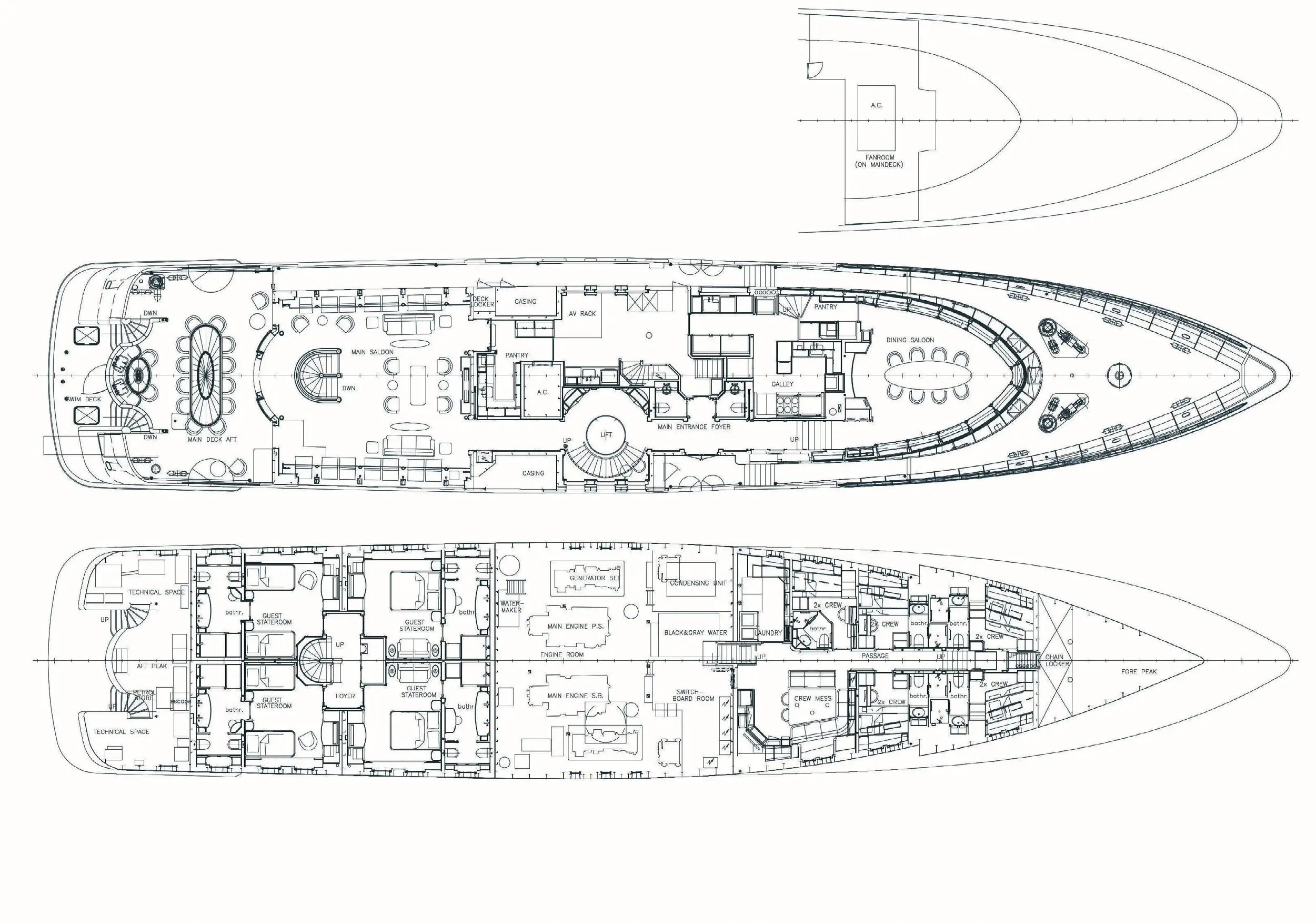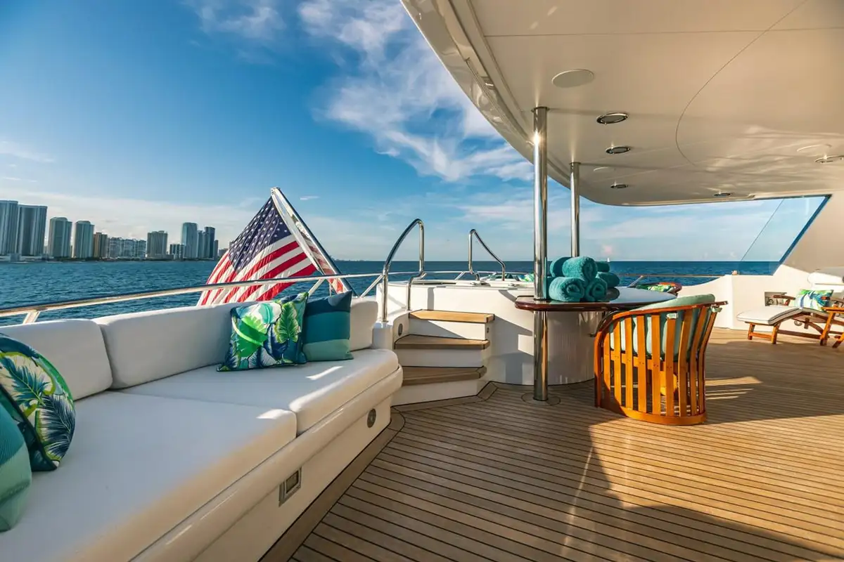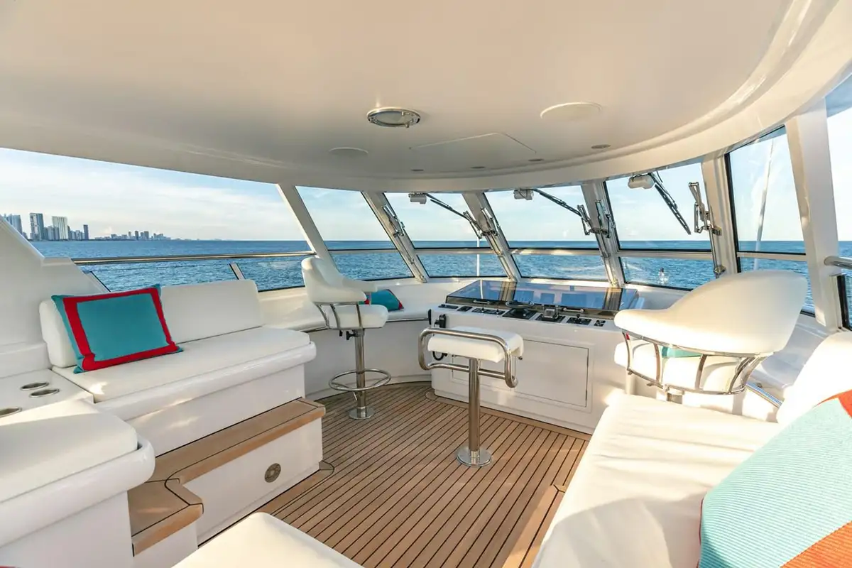 - A glass elevator serving the main deck, the owner's deck, the pantry, and the aft deck dining area