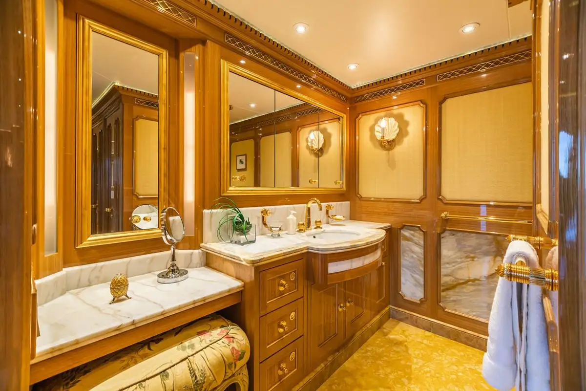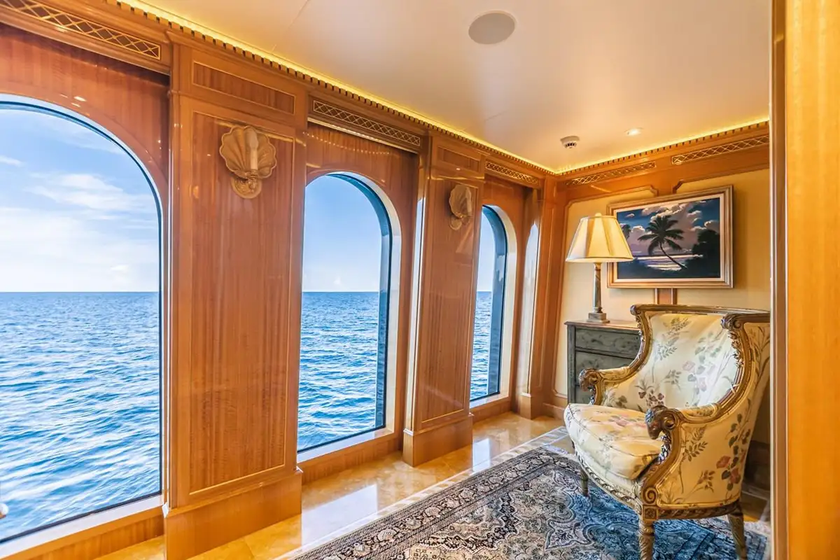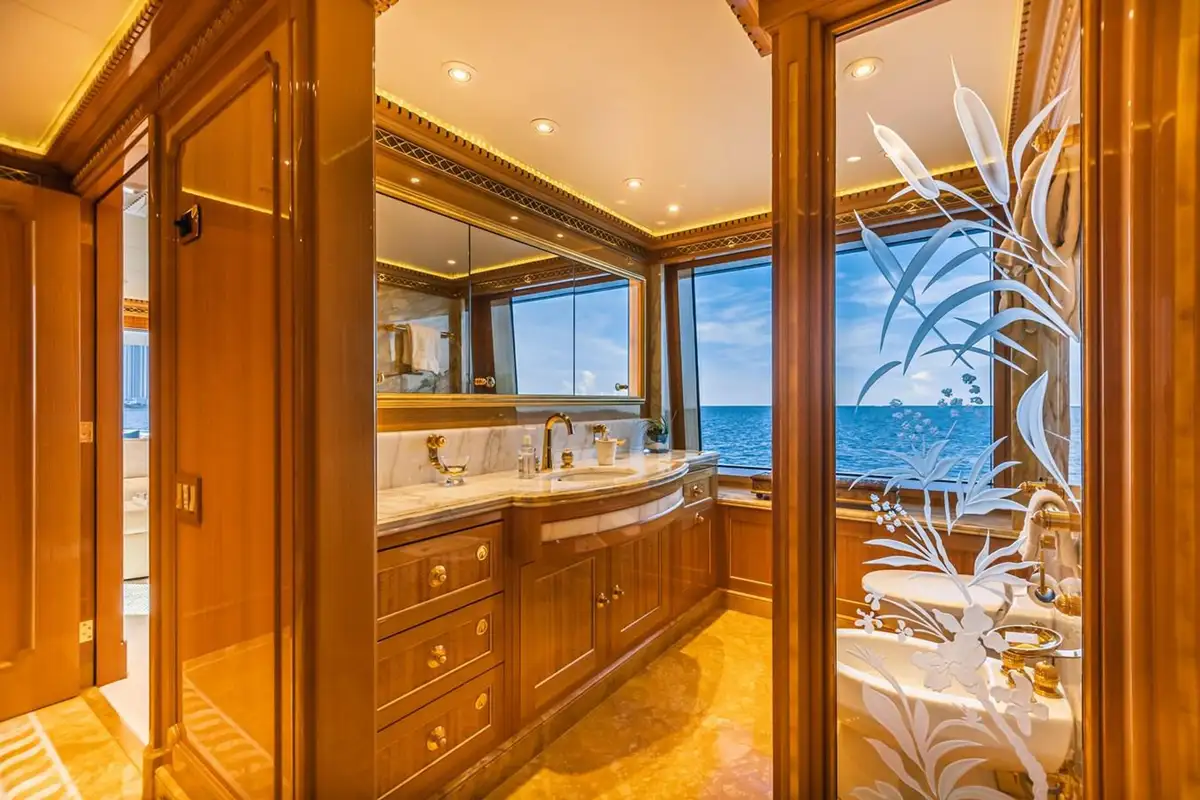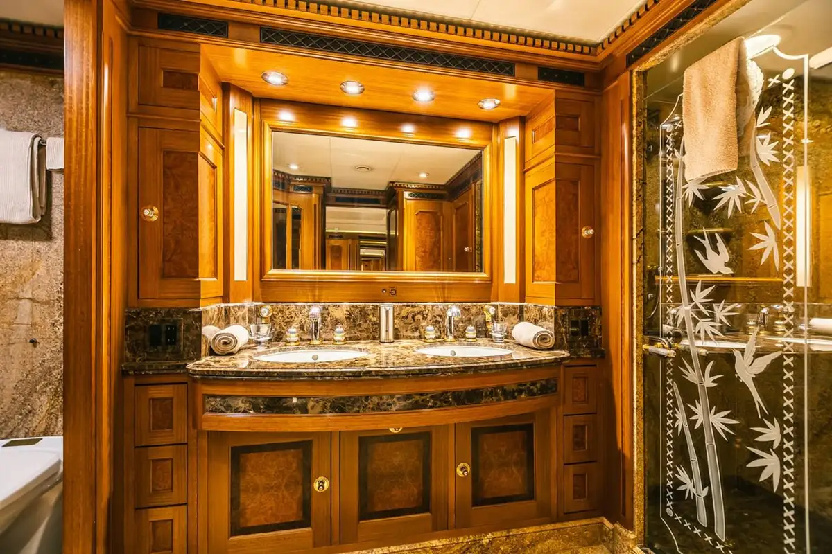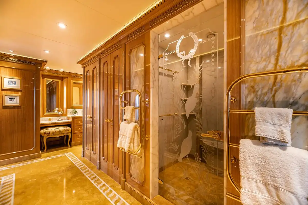 ACTA’s innovative layout offers unique areas beyond those found on yachts this size. Gorgeous cabins and guest spaces are tastefully adorned with fine materials like marble and granite, myrtle burr, eucalyptus, black walnut and sycamore all complimented by engraved glass panels. ACTA exudes classic lavishness throughout, and her compliment of highly-attentive crew is at your beck and call throughout your charter.