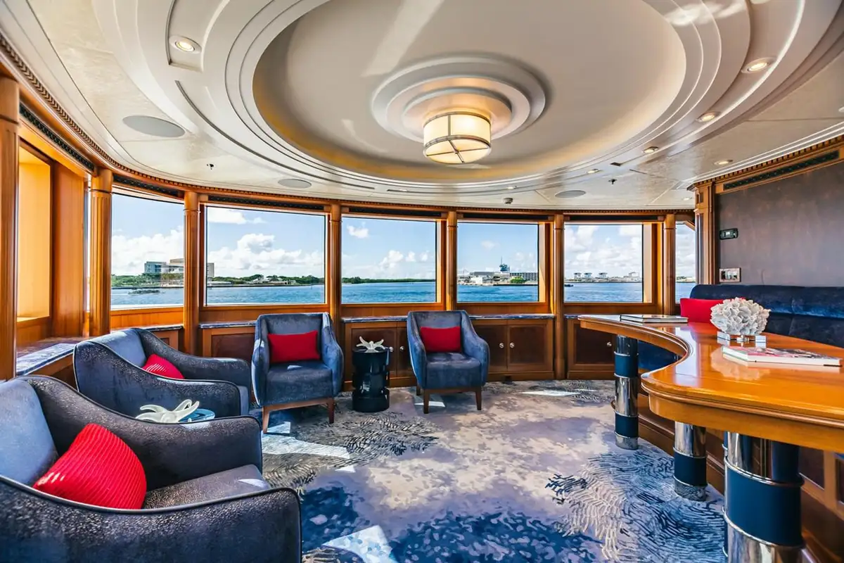 The wonderful upper deck is accessed via an elevator or the grand spiral staircase next to the yacht’s iconic vertical windows. Stretching across the full beam of the yacht, to maximise space, is the master suite. Aft, is the palatial master suite with the king-sized berth facing the private rear terrace and jacuzzi. The master suite continues forward with a vast dressing room and separate his and hers facilities – at opposite ends of this grand bathroom. Ahead, ACTA is full of surprises again. Her club lounge mirrors the panoramic windows of the dining area below and has elevated forward-facing seating to the rear so you can enjoy a captain’s view without the clutter and intrusion of the bridge and professional crew.