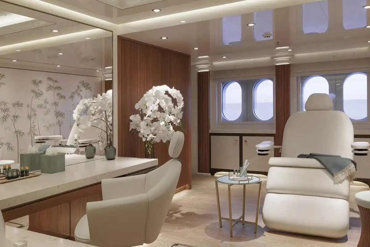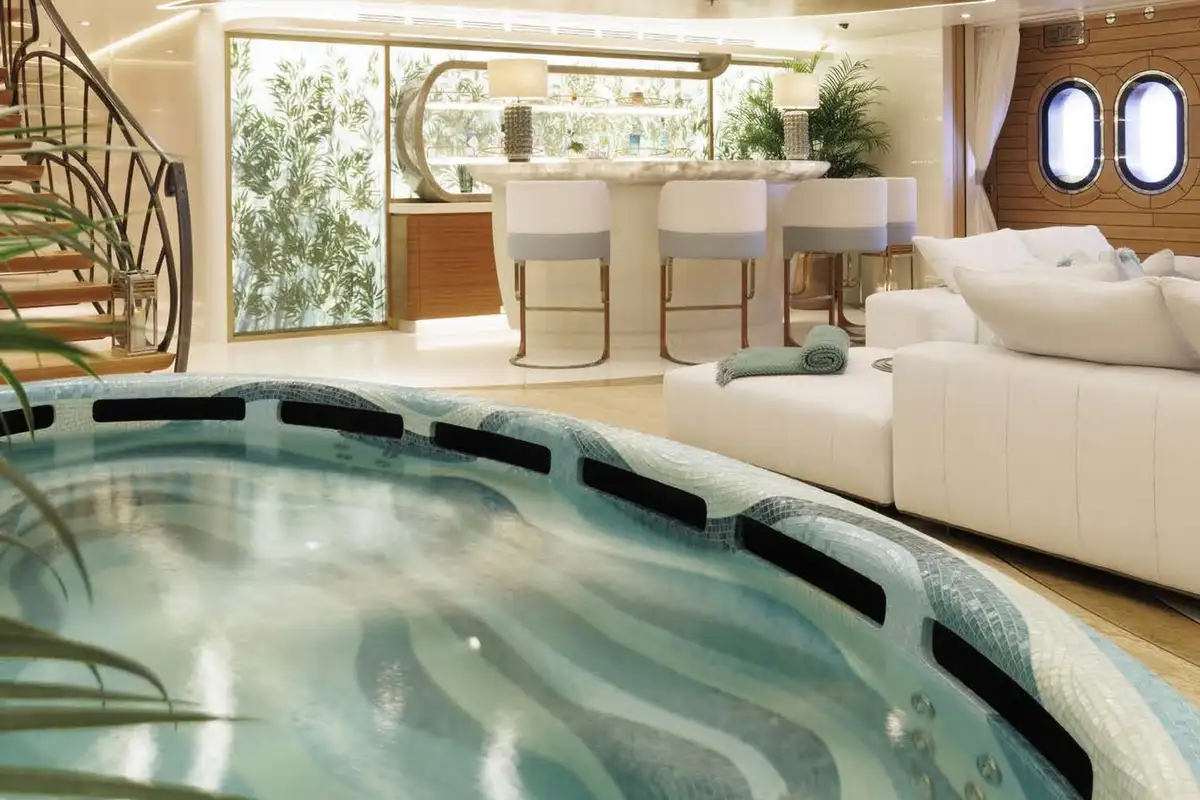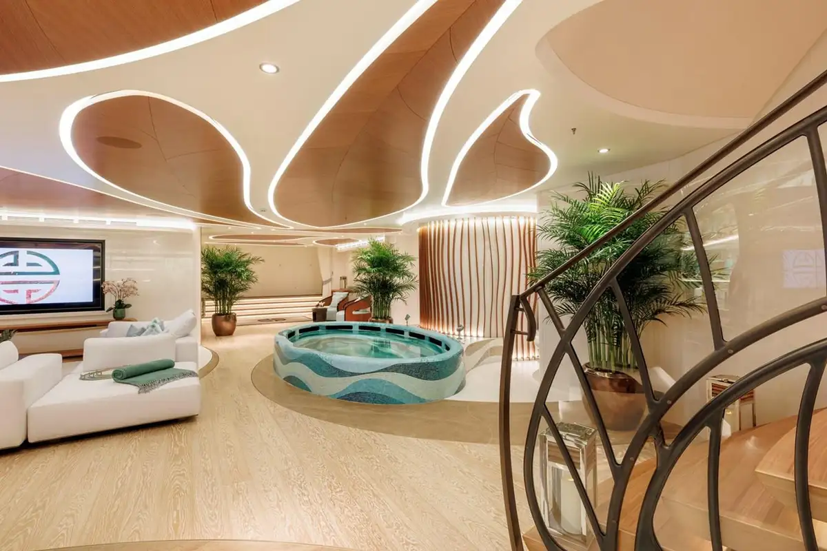 With a staff of 36 and guest areas on five of her six decks, you and your guests will want for nothing. Whether you enjoy spending your time in the gym, steam room, pool, cinema or spa, AHPO has all these and more. There are many stand-out areas on board, too many to mention in detail, but the beach club, spa, beauty salon and wellness suite is such a space. Located on the aft lower deck, it has a large fold-down sea terrace and direct access to the enormous swim platform – and from the lower lobby via a windowed corridor between the engine rooms. The spa has a sauna and steam rooms, a jacuzzi and plunge pool, private massage and treatment rooms, and a wet bar and lounge area; all in the tranquil and beautiful zen-like zone, like so many areas on board AHPO.