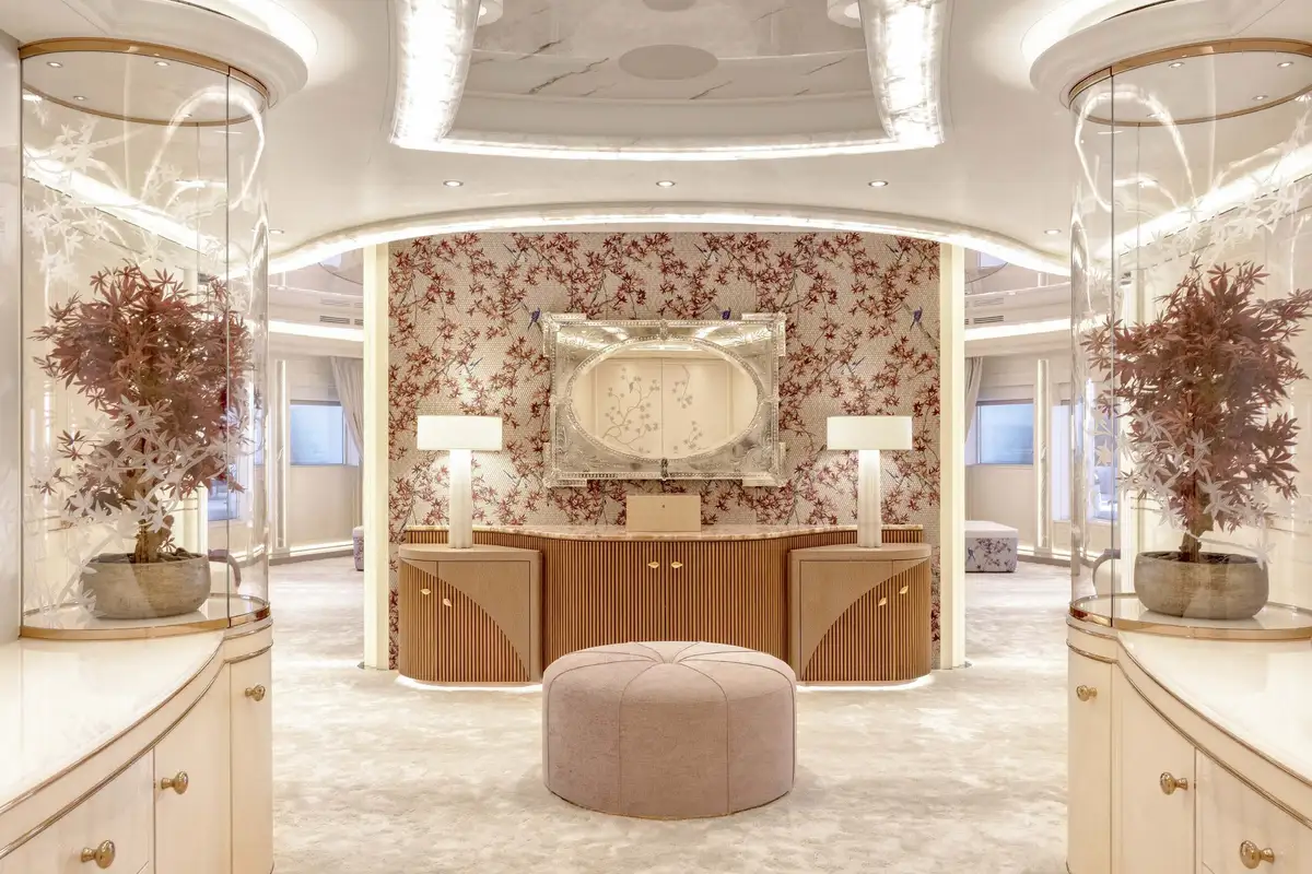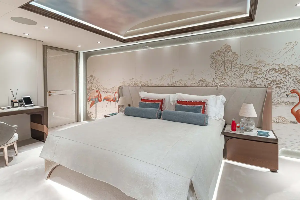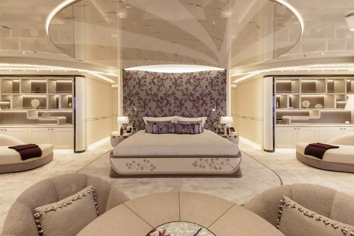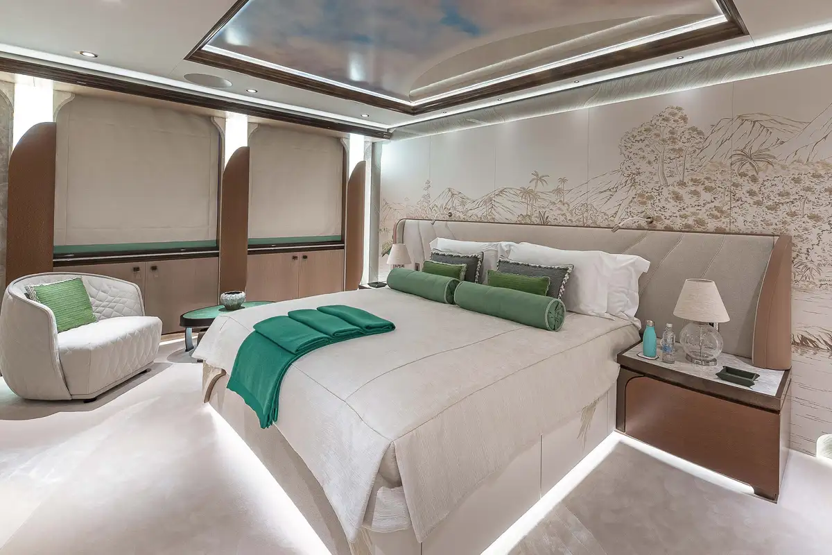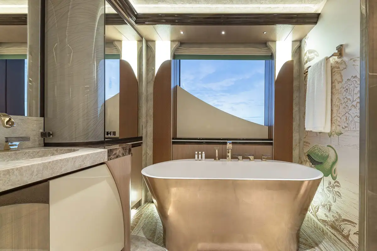 The attention to detail on board is of the highest level, from the wallpaper that was hand-crafted by artists or the choice of the finest natural materials, few yachts can compare to the onboard opulence of AHPO. Each suite has a unique theme and colour pallet to suit all your guests' needs. It is, however, the owner’s deck that will leave you awestruck. Few owner’s suites are of the size or exhibit the excellence of craftsmanship, fabrics or materials as AHPO’s. From the suite’s lobby area there are entrances to the his and hers bathrooms and dressing rooms. The central bed is partitioned for privacy and there are two private balconies one on each side depending on which view you’d prefer that day.