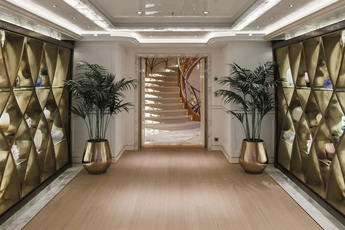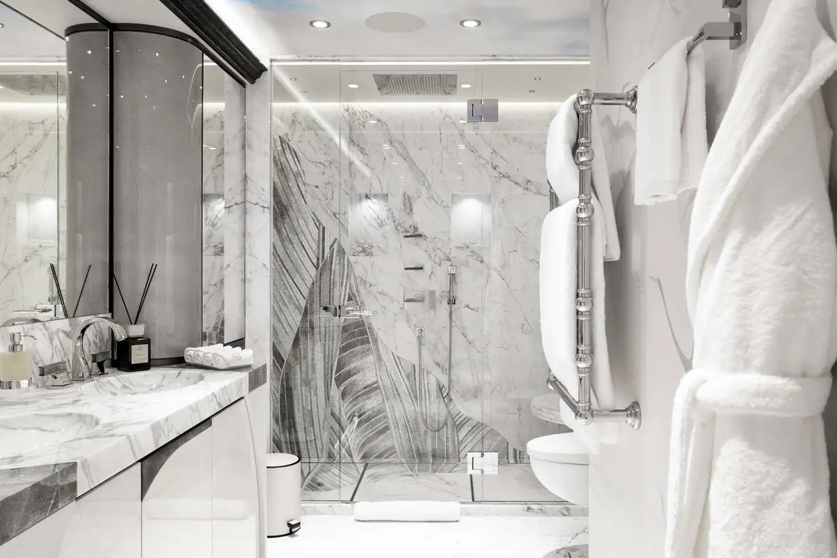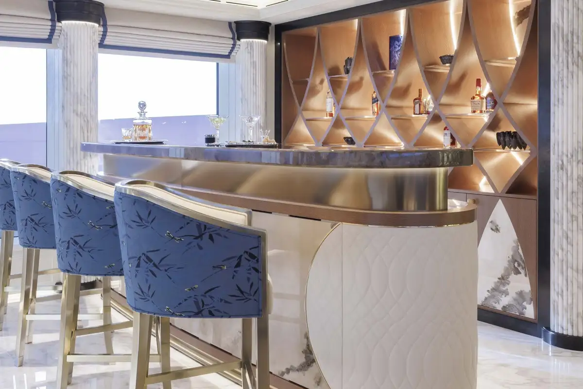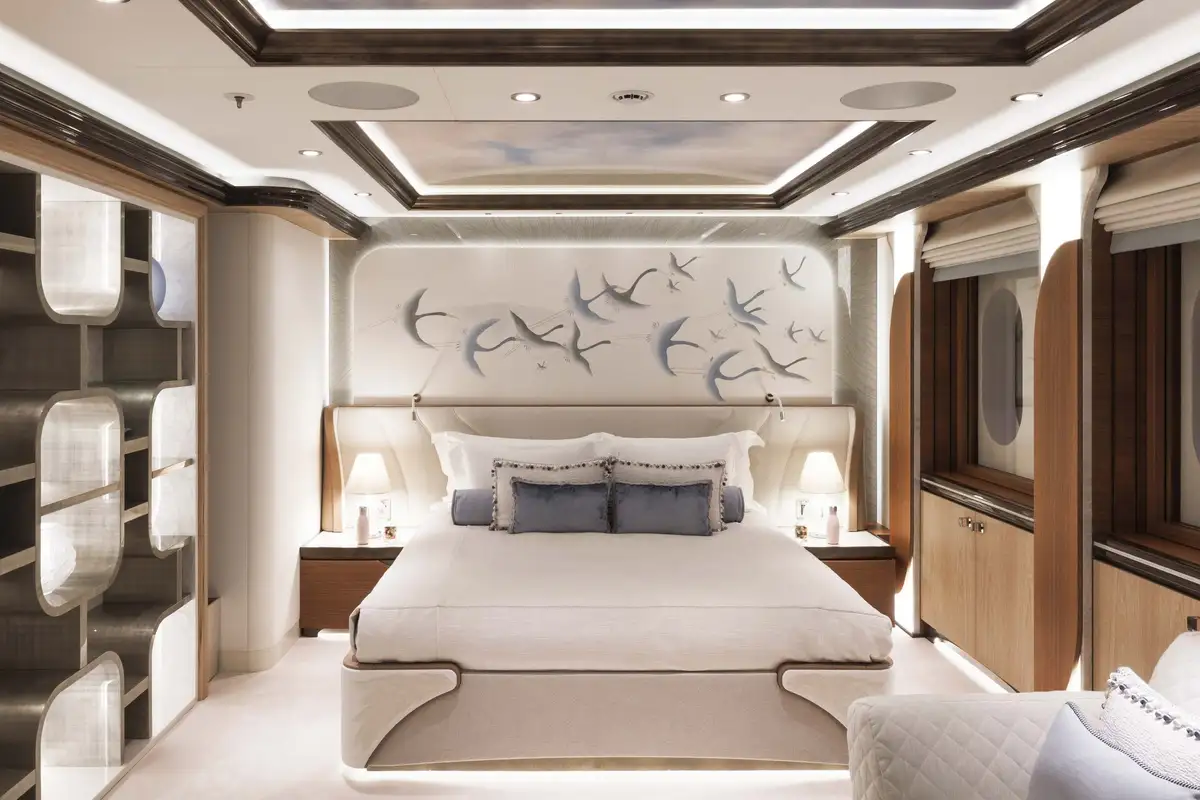 The attention to detail on board is of the highest level, from the wallpaper that was hand-crafted by artists or the choice of the finest natural materials, few yachts can compare to the onboard opulence of AHPO. Each suite has a unique theme and colour pallet to suit all your guests' needs. It is, however, the owner’s deck that will leave you awestruck. Few owner’s suites are of the size or exhibit the excellence of craftsmanship, fabrics or materials as AHPO’s. From the suite’s lobby area there are entrances to the his and hers bathrooms and dressing rooms. The central bed is partitioned for privacy and there are two private balconies one on each side depending on which view you’d prefer that day.