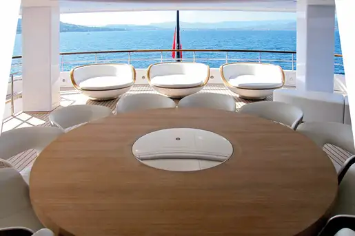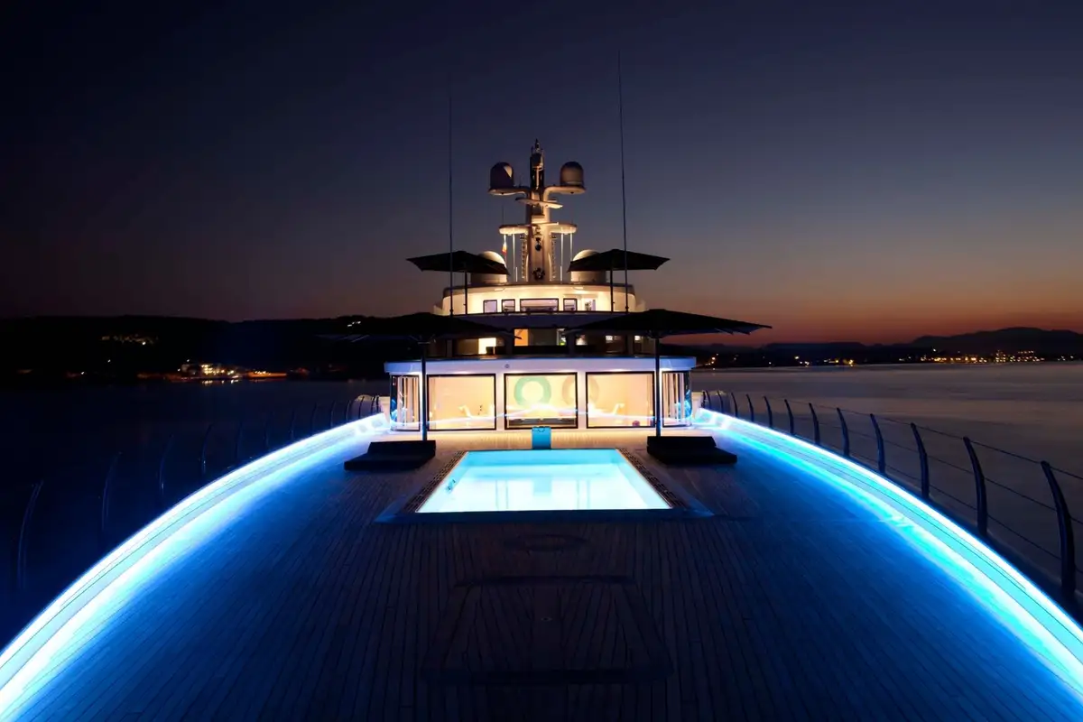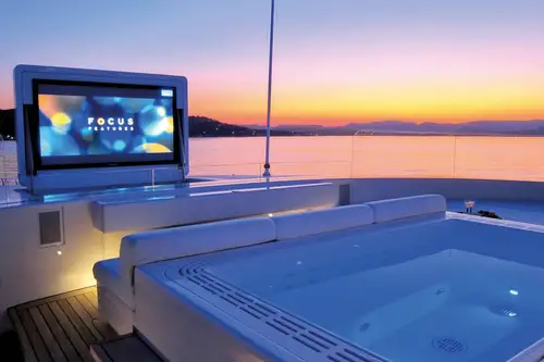 The beach club houses a fully equipped gym at water level. With Technogym cardio machines, free weights, boxing gear, yoga mats, and functional training equipment, it’s a dedicated workout space. Follow it up with a session in the steam room, a massage, or a swim in the pool forward on the main deck. The space here is private, open, and ideal for winding down or starting the day.