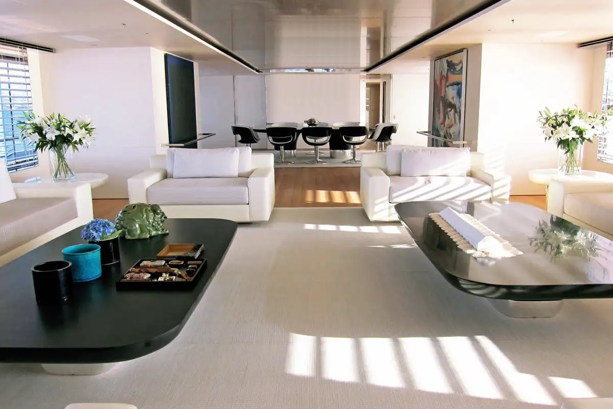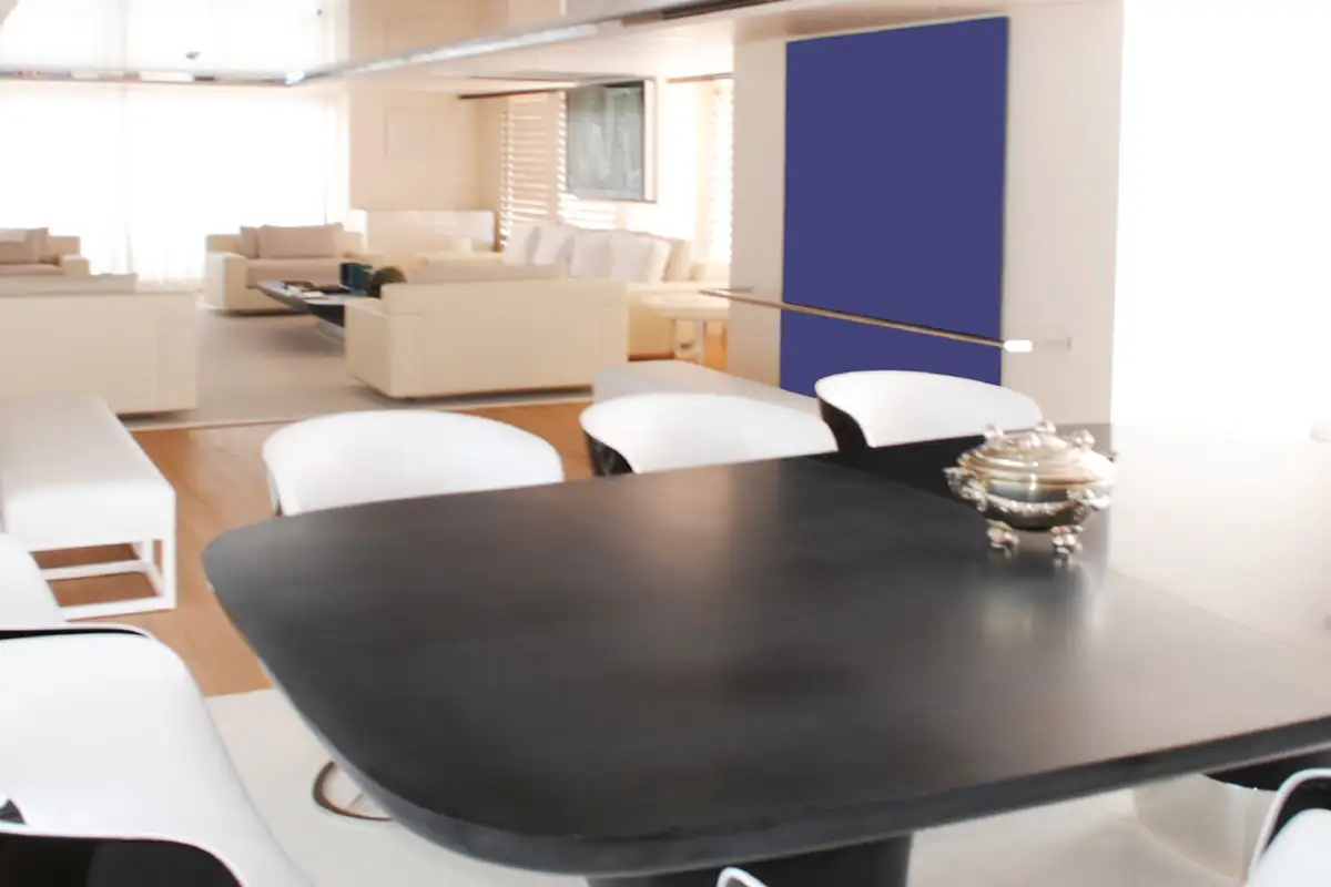 Guest accommodation is smartly arranged: a full-beam owner’s suite on the main deck with two bathrooms and a private dressing area, a VIP cabin also on the main deck, and five further guest cabins below, specifically four doubles and one twin, each with en suite bathrooms. Every cabin feels deliberate, calm, and understated.