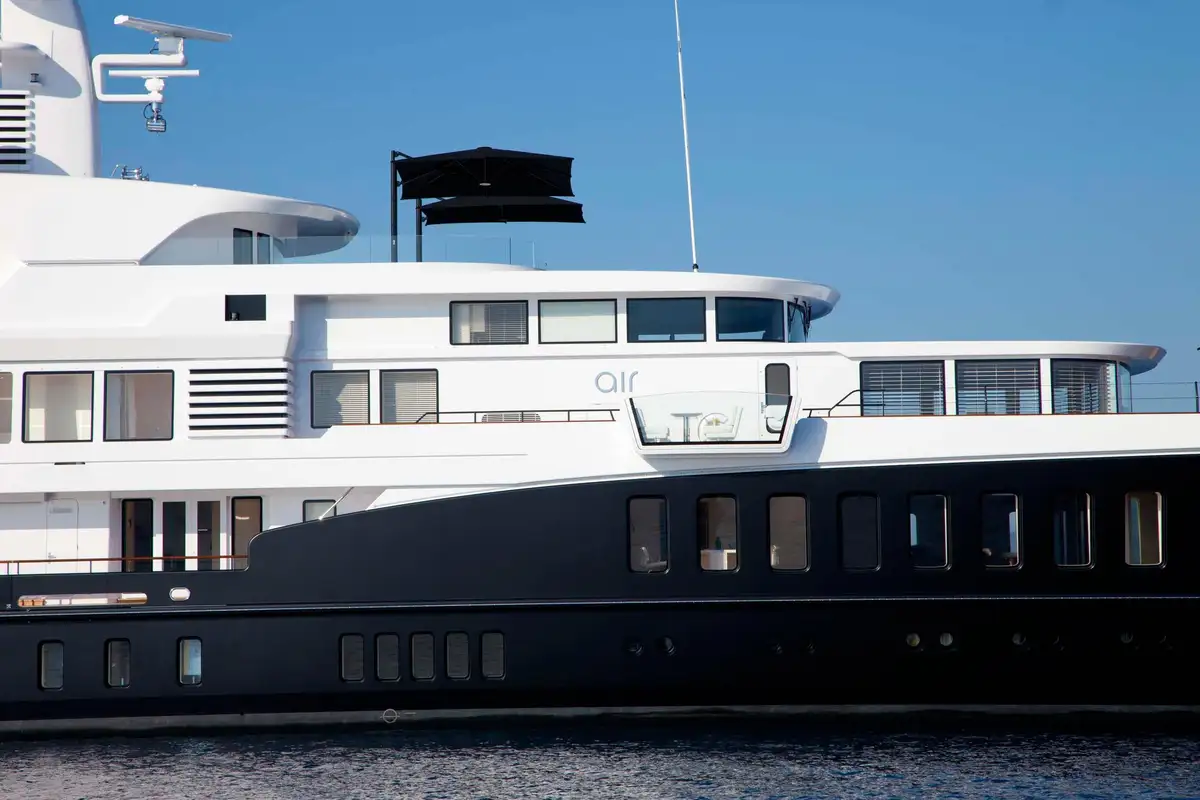 At 81 metres in length, AIR is a serious world-cruising yacht built for adventure, comfort, and connection. Delivered by Feadship and recently repainted in 2024, she is striking in profile and calm in presence, with a dark hull and minimal styling that lets her purpose speak for itself.