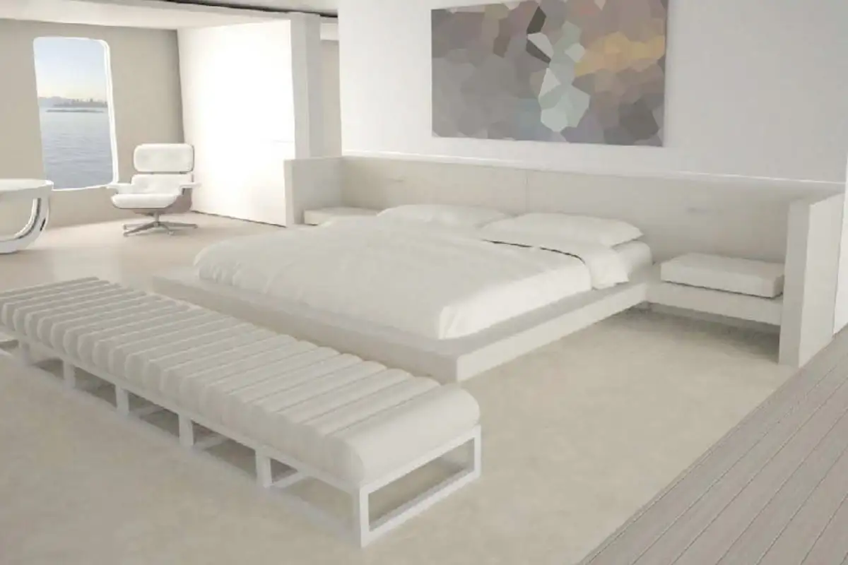 Inside, the yacht is simple and open. Rémi Tessier’s interior is built around clean lines, wide sightlines, and rich, tactile materials like sycamore, limestone, leather, carved glass, and palladium leaf. Skylights and large windows let natural light fill the space, and there’s an elevator serving all guest decks for easy movement throughout.
