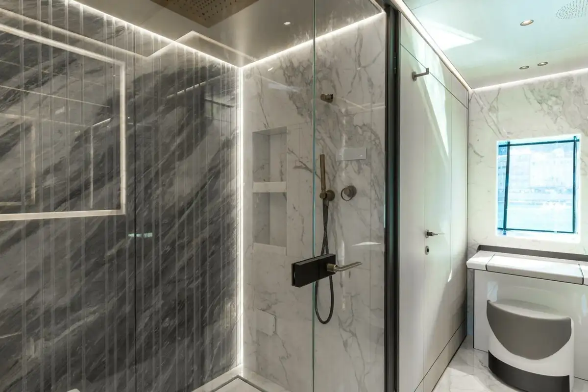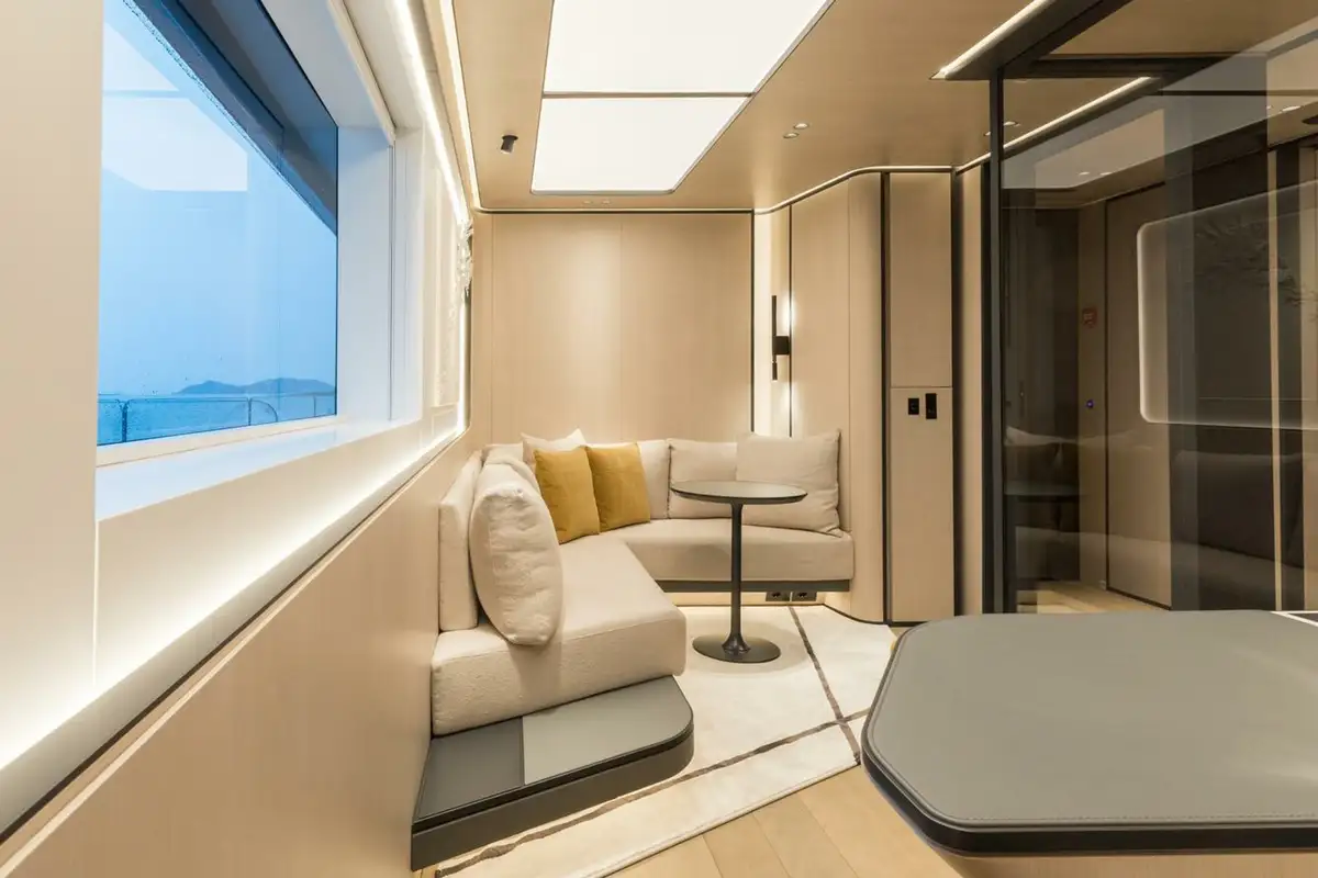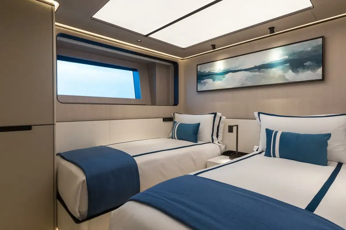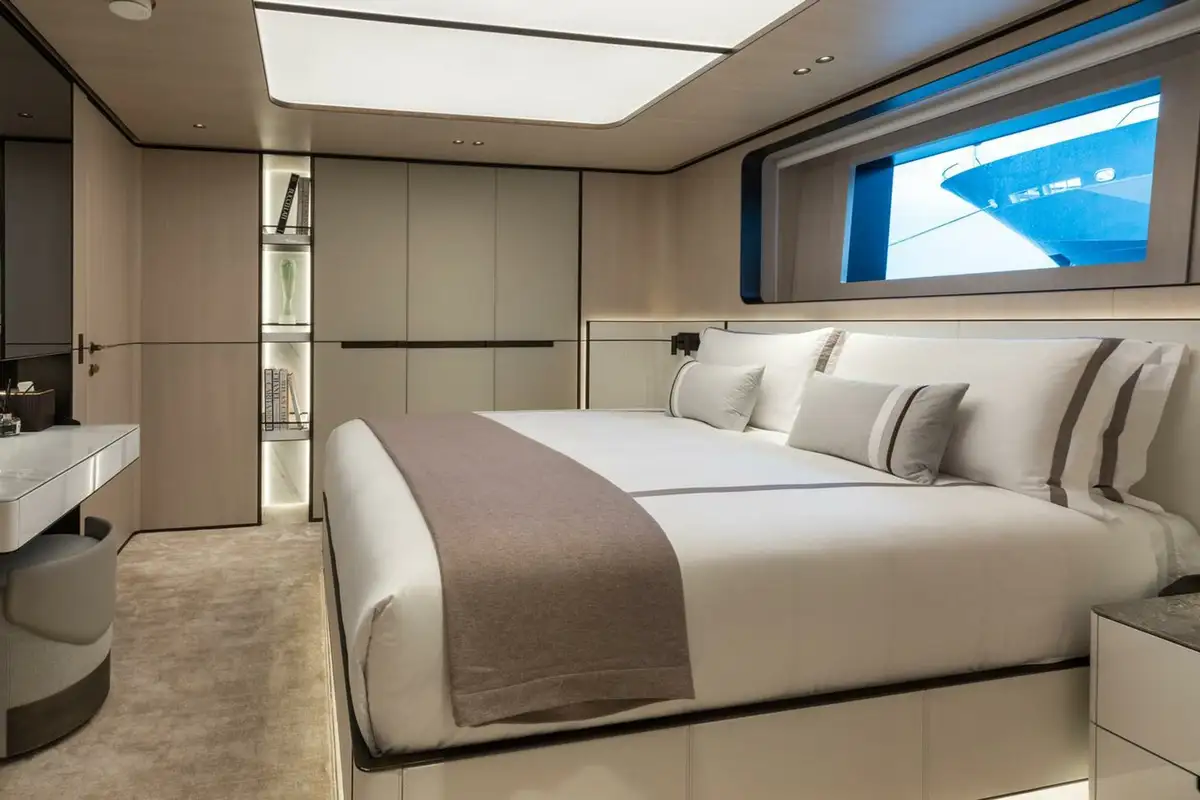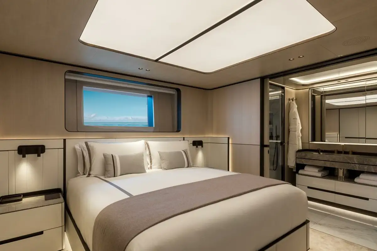 While she is part of Baglietto’s T52 series, AKULA is completely unique thanks to a close collaboration between the shipyard and the owner. Giving her a distinctive personality, a neutral colour palette of cream and grey is accented with pops of colour. 12 guests are accommodated across six cabins, the standout of which is undeniably the master cabin with a separate lounge, en suite, and floor-to-ceiling screen.