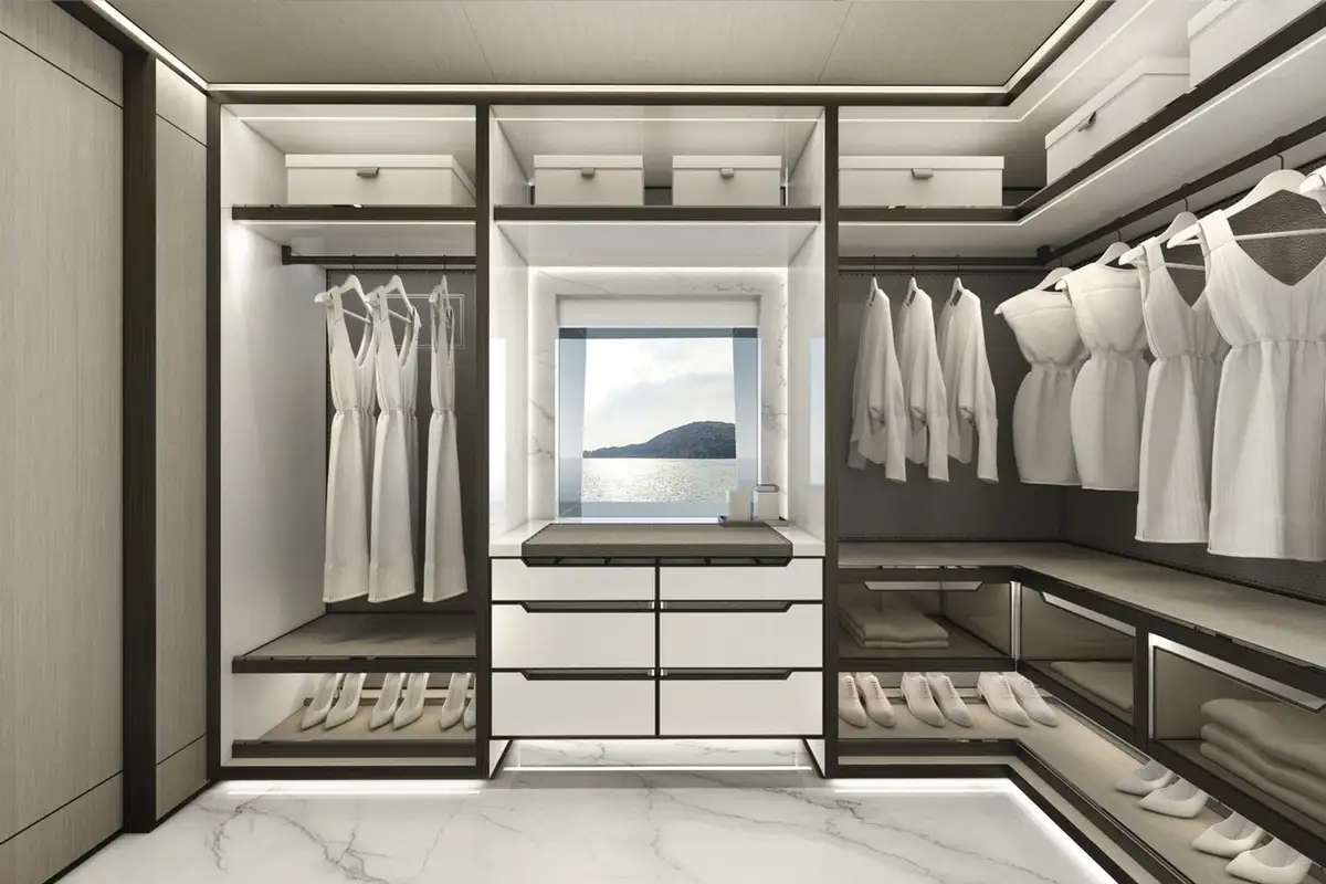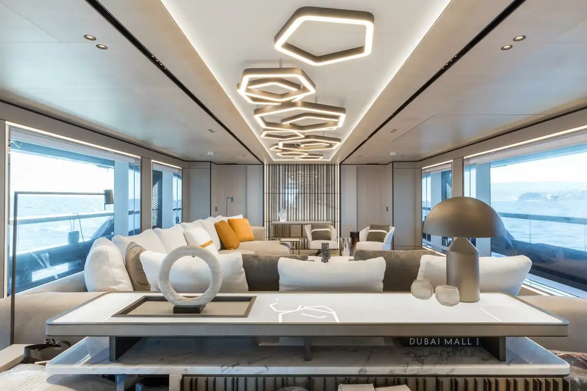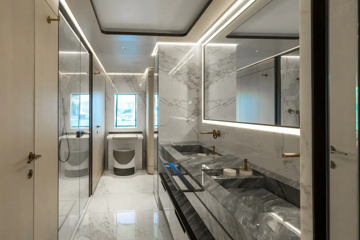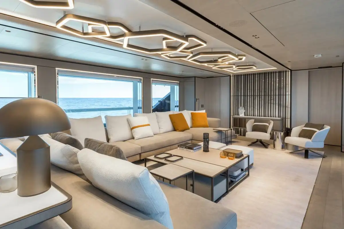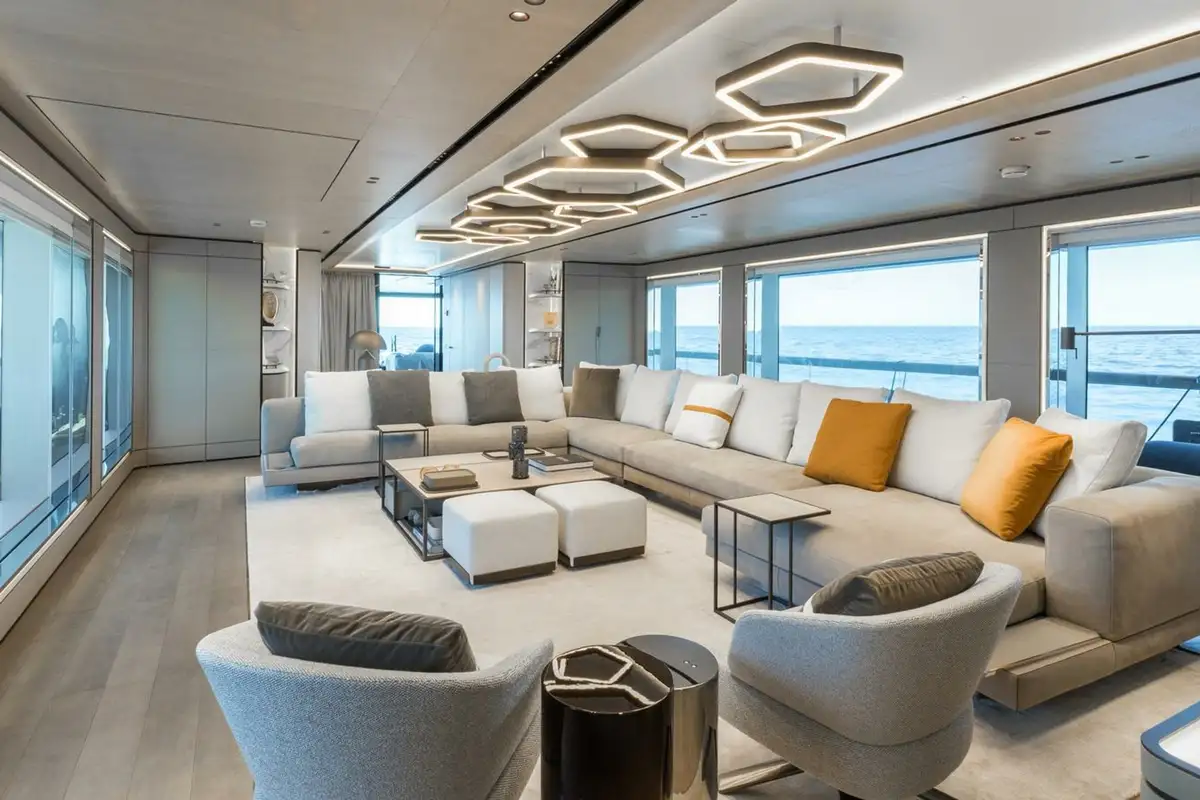 While she is part of Baglietto’s T52 series, AKULA is completely unique thanks to a close collaboration between the shipyard and the owner. Giving her a distinctive personality, a neutral colour palette of cream and grey is accented with pops of colour. 12 guests are accommodated across six cabins, the standout of which is undeniably the master cabin with a separate lounge, en suite, and floor-to-ceiling screen.