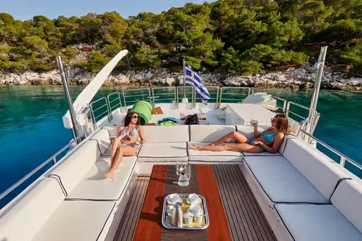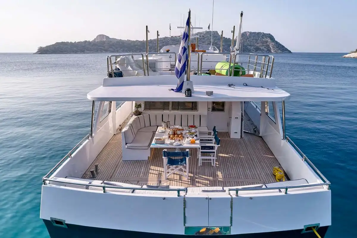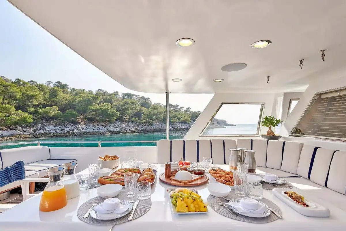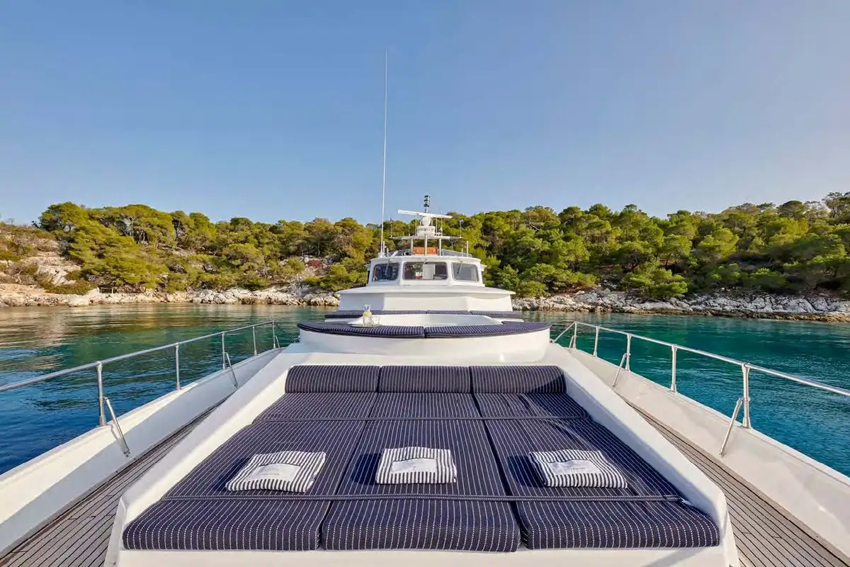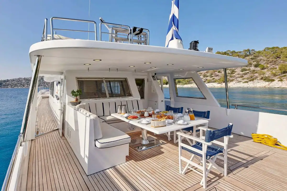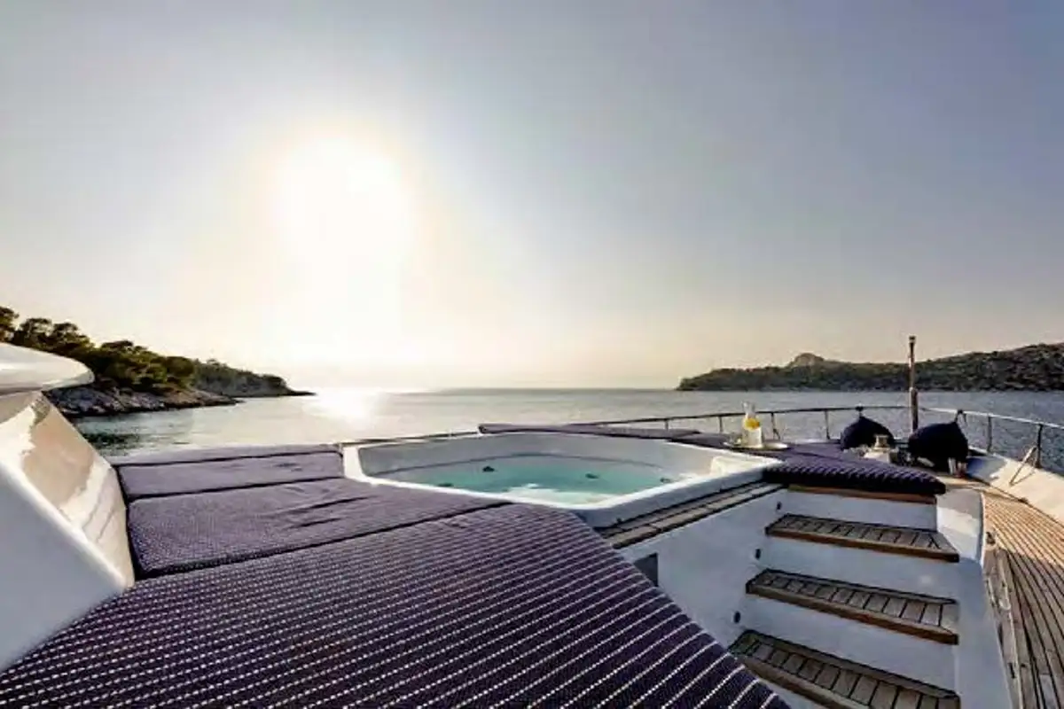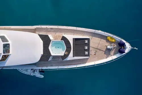 One of her special features is the hexagonal jacuzzi pool on her foredeck – rare to find one here on a genuine classic yacht. It’s perfect for a long, leisurely soak while spending the afternoon at anchor, or for a quick plunge to cool down after basking on the triple-width sunbed that’s just a few steps away. A short stroll aft along her wide teak decks there’s a snug lounge/dining area with plenty of shade. It’s an excellent place for guests to gather for breakfast and plan the day’s adventures.