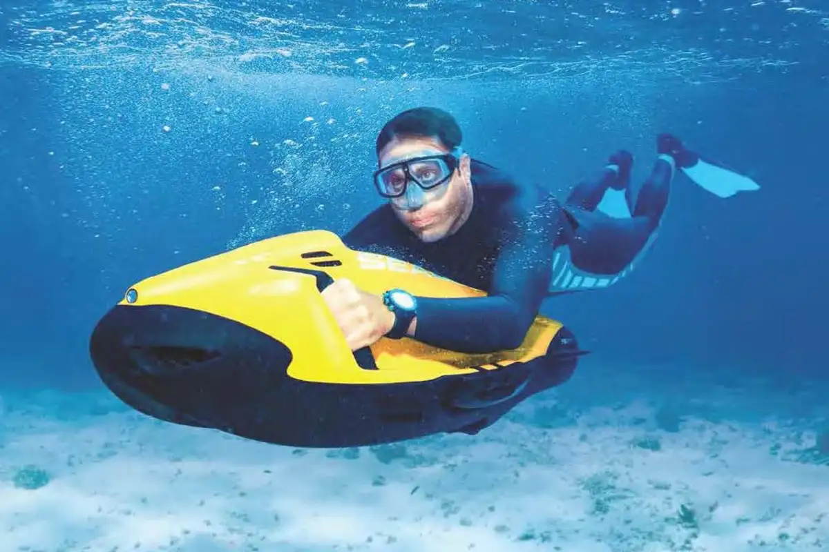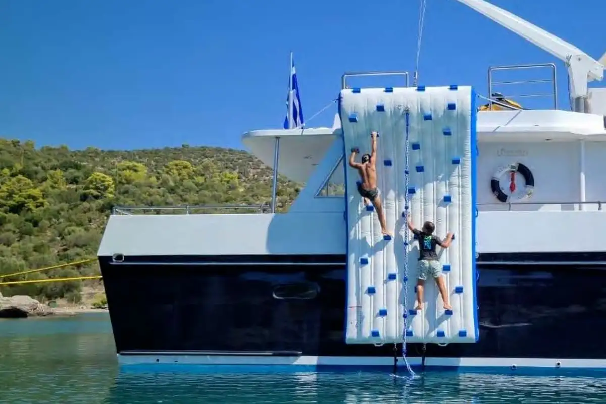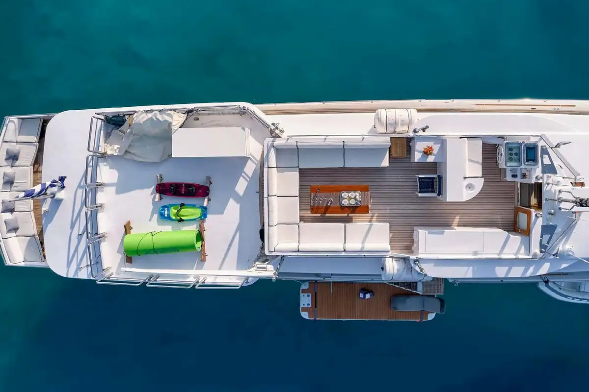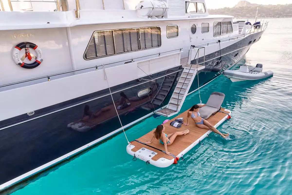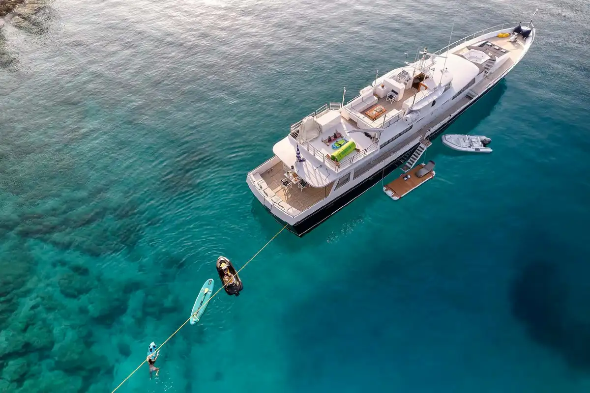 She carries a superb inventory of watersports toys. There’s a Jetboard, an Fliteboard and a Liftfoil, a SeaBob and a jet ski, a climbing wall – and a whole lot more.