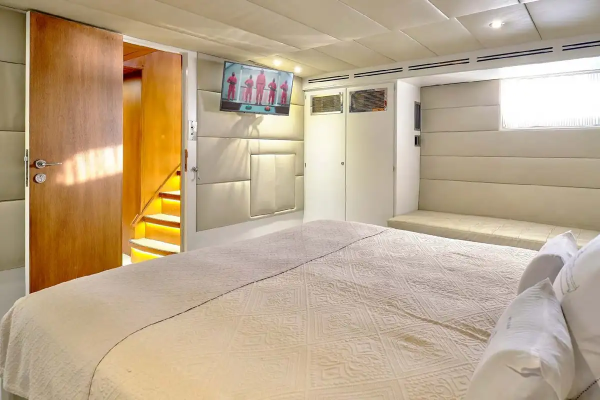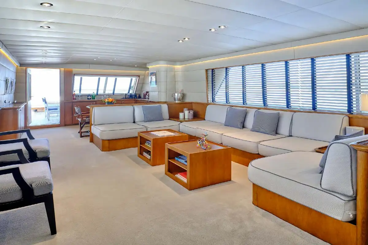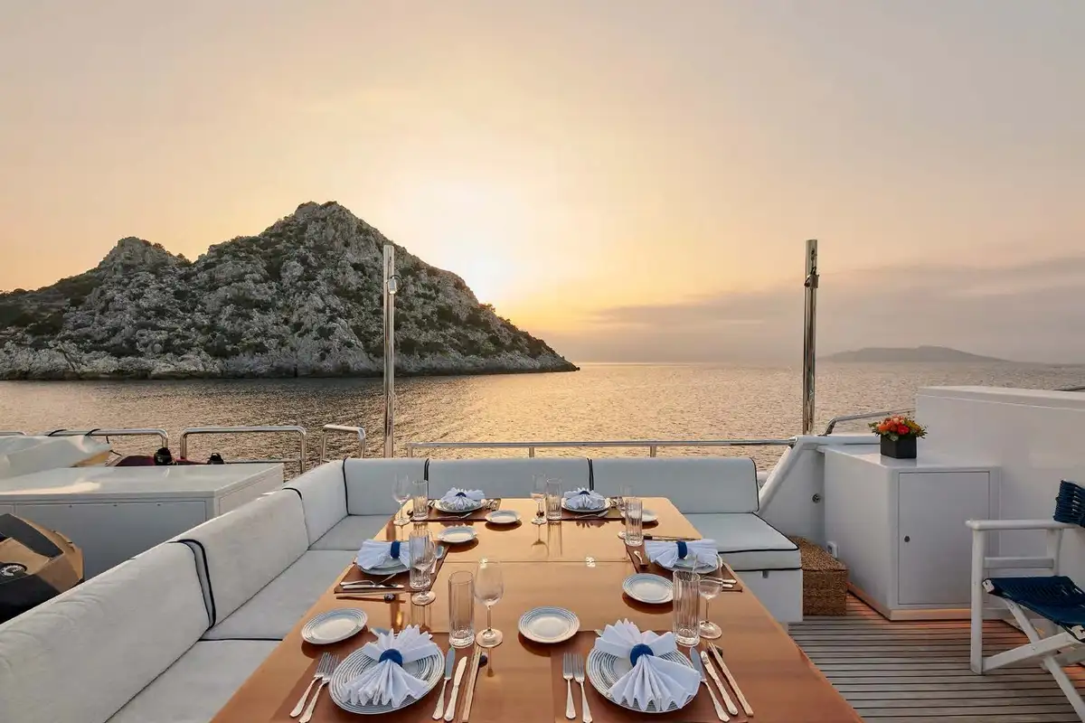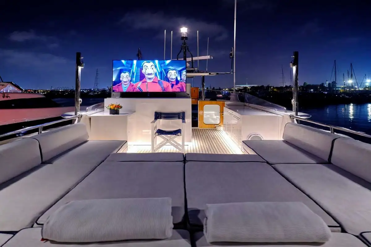 There’s a nice, sociable open-air lounge on the sundeck where nothing interrupts your view and the warm sea breeze flows through your hair. The teak table raised and unfolds for a midday barbecue, with two large grills for the chef to work his magic – and it’s the perfect venue for an intimate sunset dinner. The seating area converts into a huge day bed when it’s time to recline and the new open-air cinema system deploys after dark for perfect movie nights under the stars.