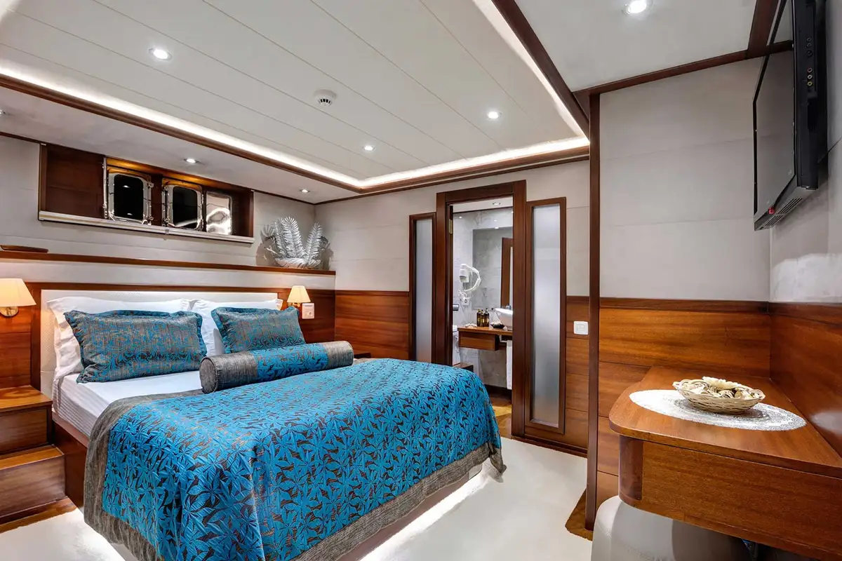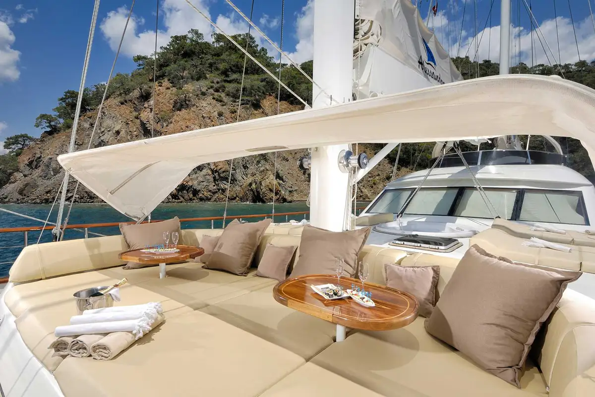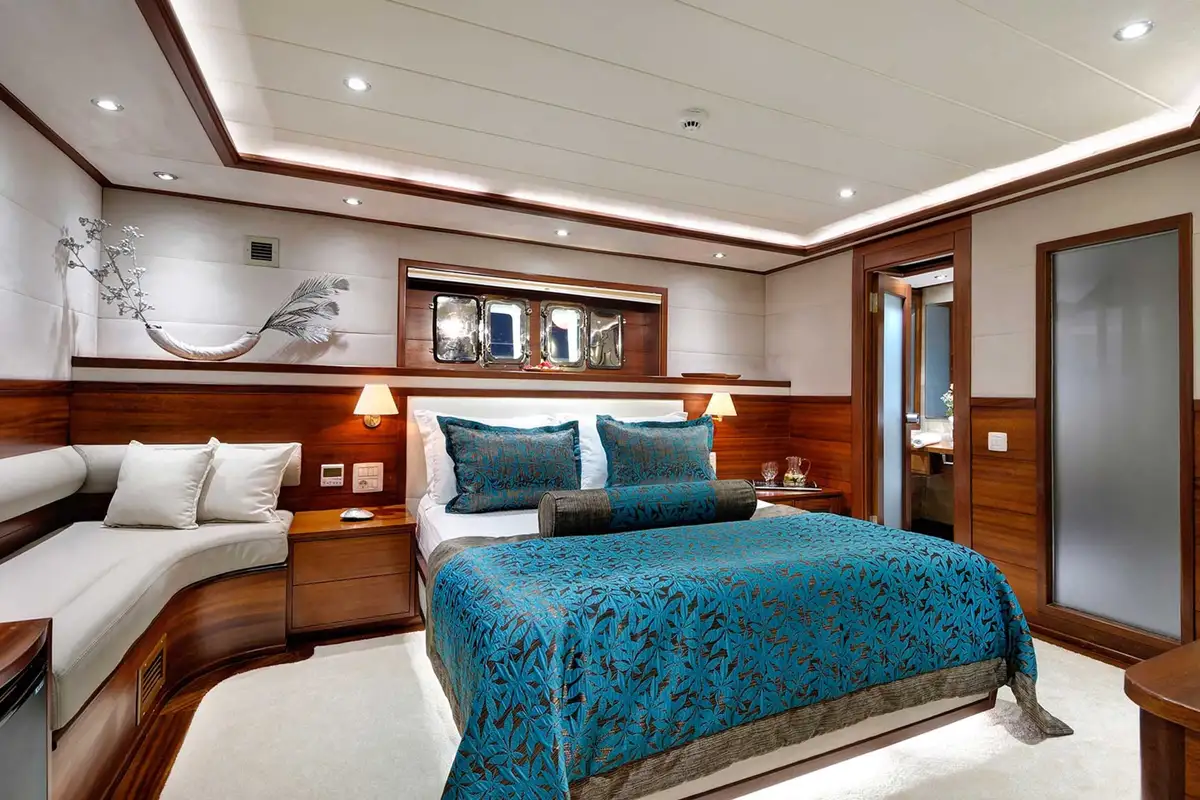 Her foredeck is an excellent feature with a large, comfortable day bed beneath a canvas awning plus four sun beds and a jacuzzi. Up on the bow you can venture out onto the bowsprit for a spectacular view as she sails through the waves – with luck you might encounter dolphins and it’s the perfect place to watch them. With high safety railings all round her decks, she’s an ideal choice for guests of all ages.