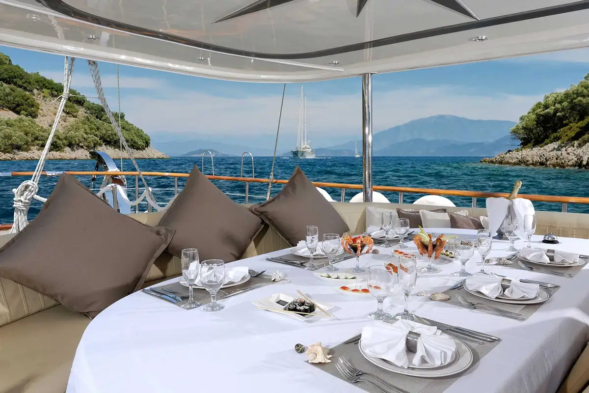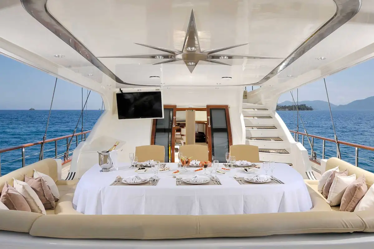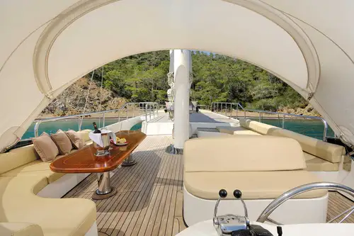 She also has a sociable lounge on the sundeck with seating in both full sun and shade and an elevated view. It’s the perfect spot for a cocktail before or after dinner. The main deck aft is a comfortable outdoor dining area with seats around a table and a drop-down TV for movie nights on board.