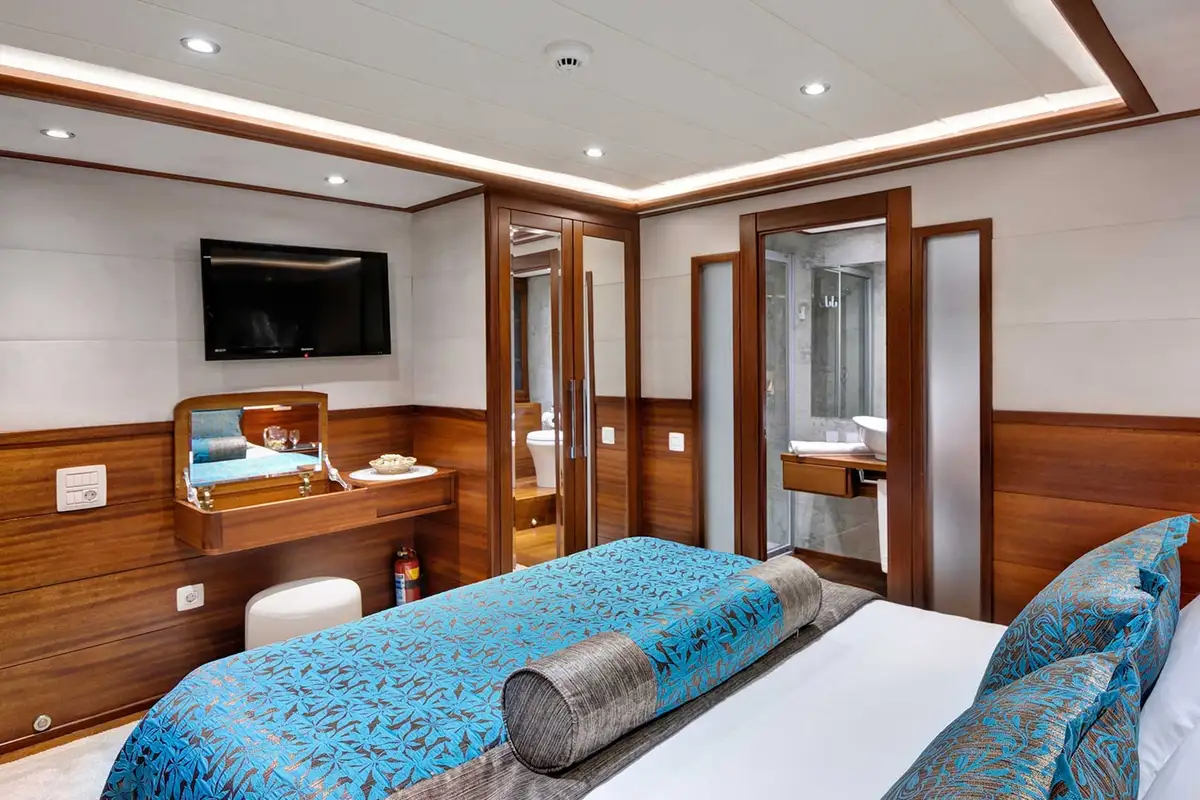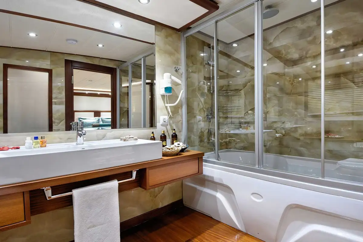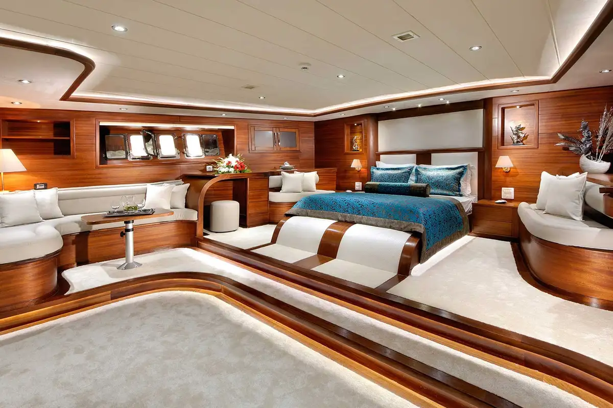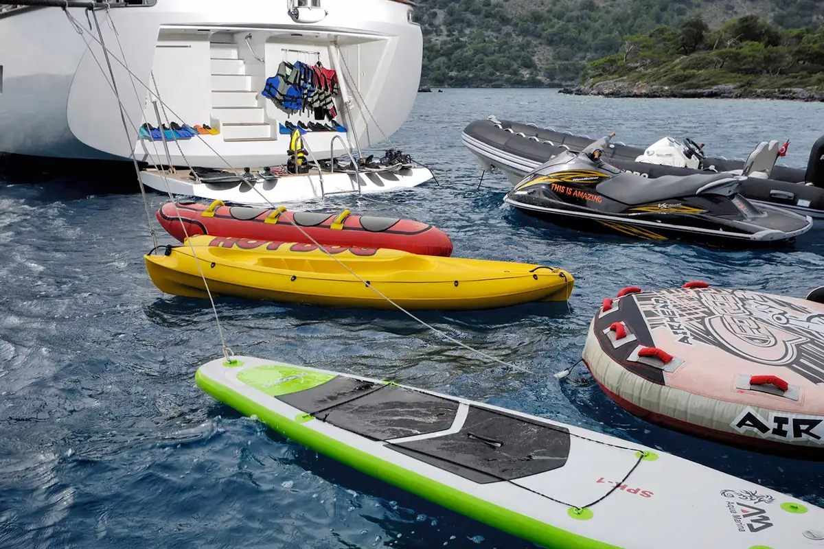 When she’s anchored in a bay, a bathing platform folds out of her stern and a few steps lead down to the water, where you can board her tender for a beach landing or a trip to harbour, jump onto a jet ski, set off on a paddleboard or canoe, explore underwater with a SeaBob, enjoy a high-speed ride on an inflatable tow, or simply go for a swim. Water skiing and wakeboarding are also included.The main inside social space is her bright and airy deckhouse where there’s a lounge, a cocktail bar and a dining table with an all-round view of the sea. The master suite is a full-beam cabin located forward on the lower deck with a private lounge area and a marble en suite bathroom. The other guest cabins are three doubles, including a VIP suite, plus a twin-bed cabin. She also has an onboard sauna, satellite TV, wi-fi and air conditioning throughout the accommodation.