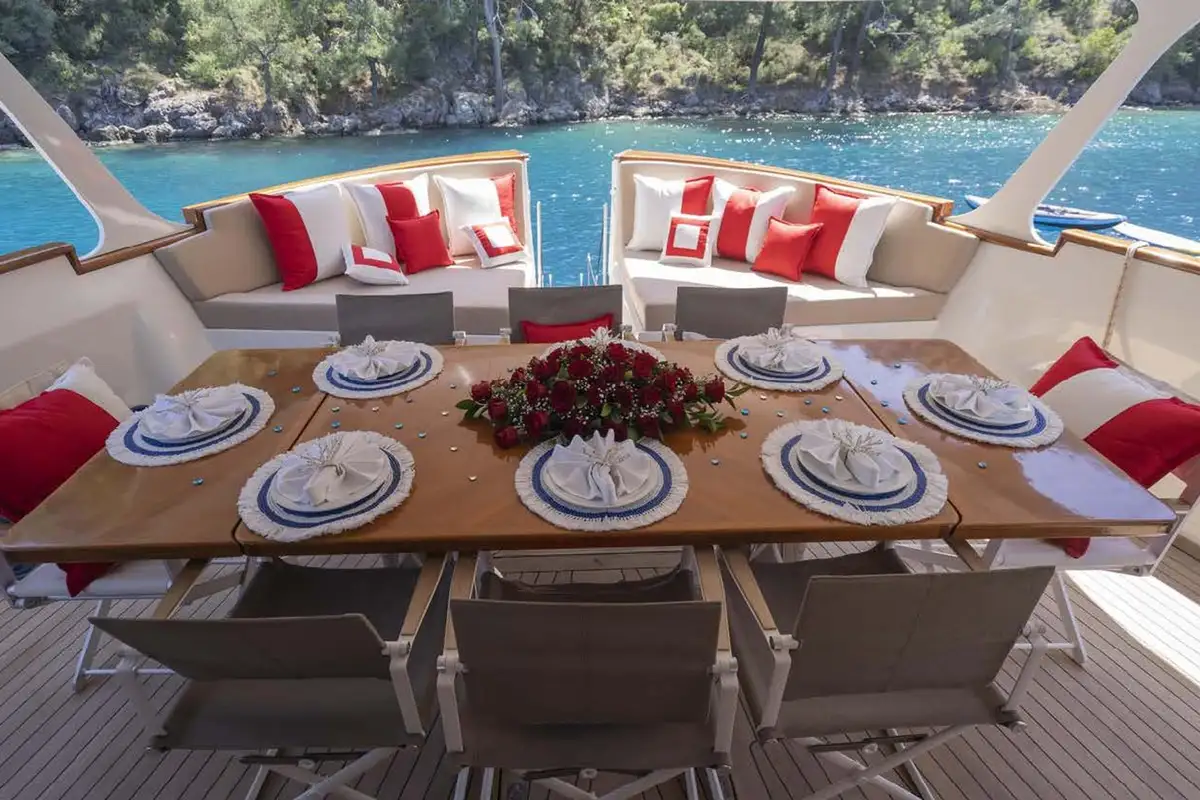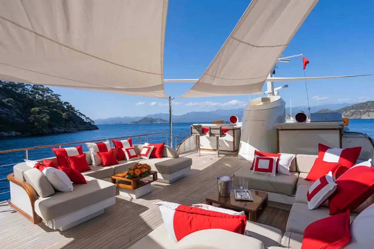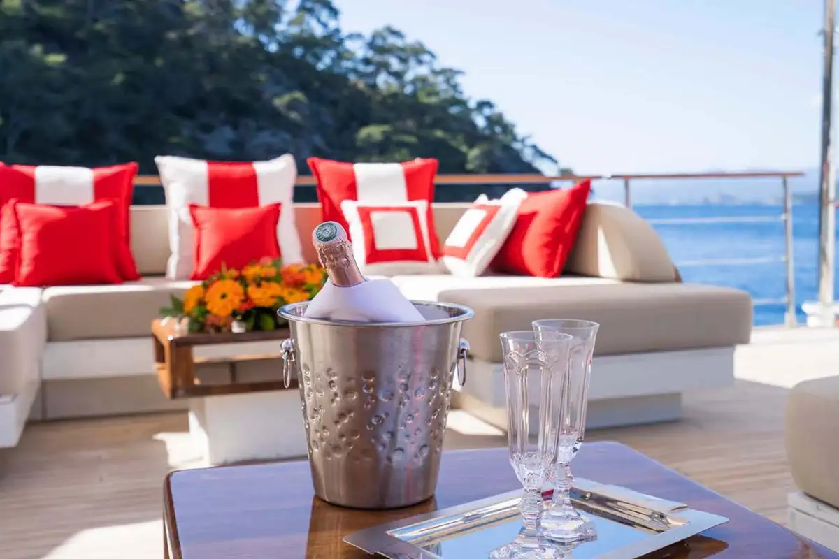 She has a lovely al fresco dining area on the main deck aft, where the views out over the sea are framed by solid teak capping rails and the sculpted mullions that support her upper deck – a nice touch of nautical tradition. Covered companionways lead forward on both sides of the main deck from aft deck to foredeck, where you can step up onto a broad expanse of sunpads for secluded relaxation.