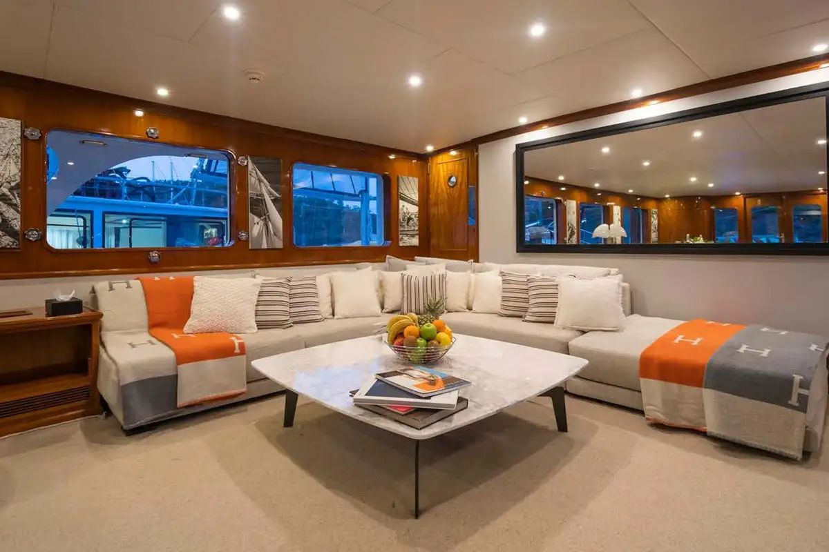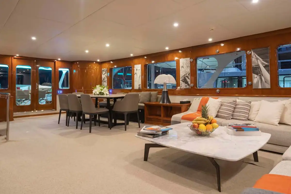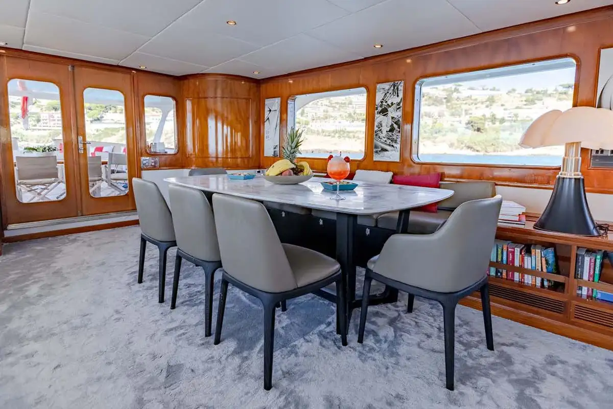 The main deck lounge is smart and elegant but relaxed, with an open plan layout and a feel of ample space. A palette of neutral tones offsets the fine, original walnut finish. Large, curved picture windows frame the sea views beautifully while letting in plenty of natural light. There’s good separation between lounge and dining areas, and an easy flow from the lounge out onto the main deck aft.