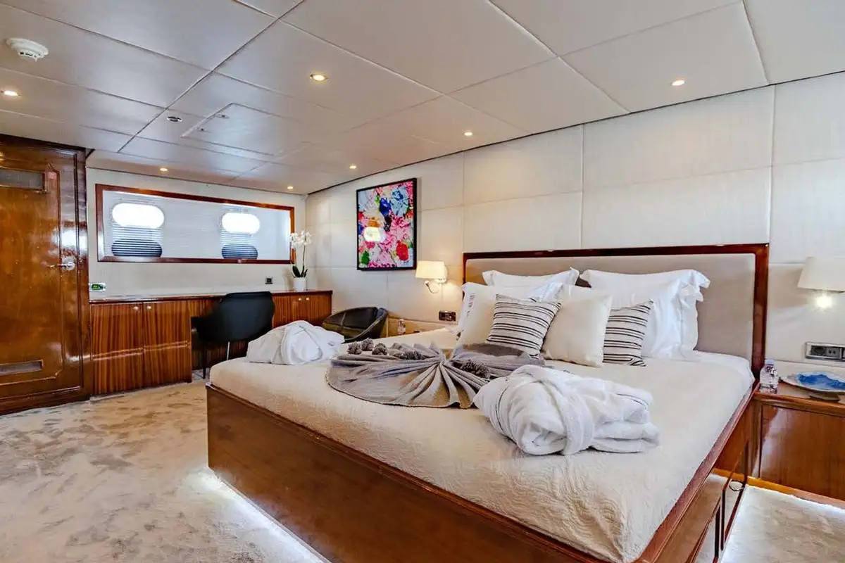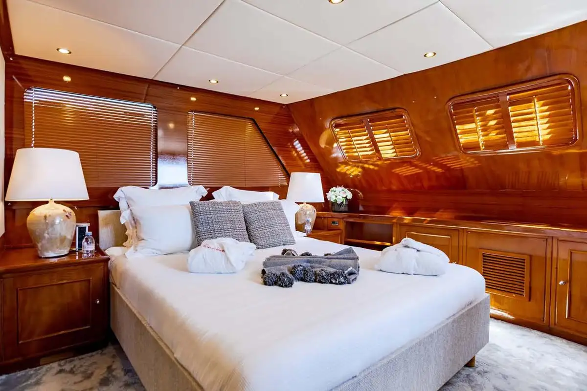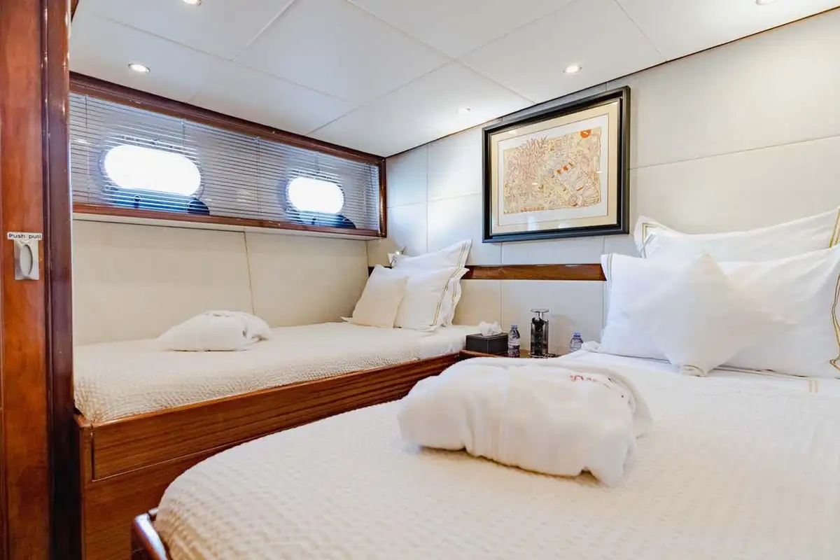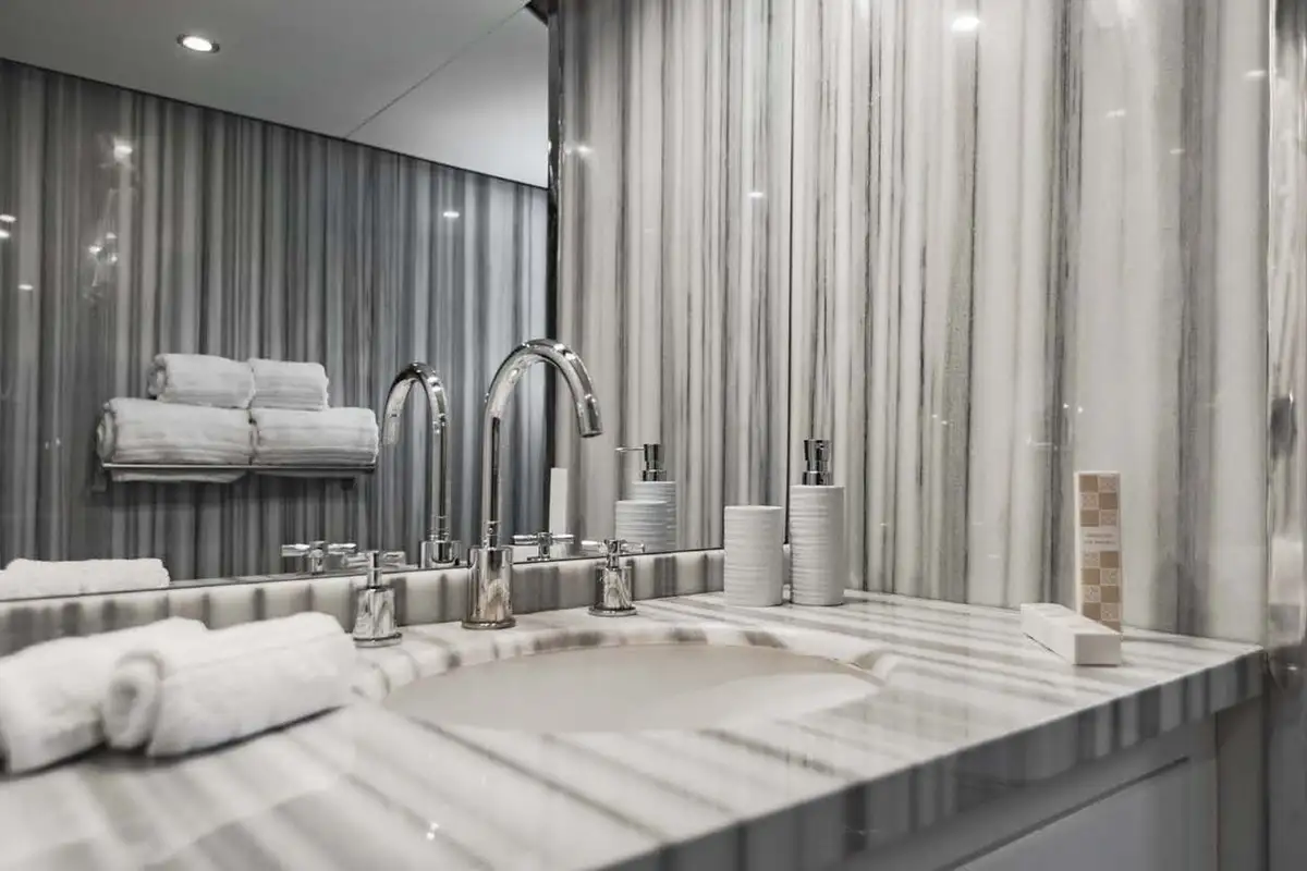 The master suite is a full-beam cabin located amidships on the lower deck, with a sofa and office desk flanking the king size double bed. There’s ample stowage space in three wardrobes and a bathtub plus a separate shower in the en suite master bathroom. The other four guest cabins are a VIP double up forward on the main deck level with windows on three sides, a double tucked behind the wheelhouse on the upper deck, a spacious double on the lower deck, and a twin-bed cabin in the stern. All of these have private en suite bathrooms.