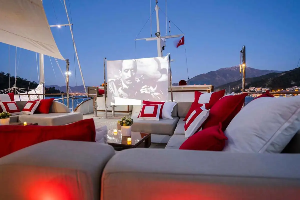 There’s ample open-air living space up on the sun deck where you’ll find a spacious seating and dining area around a big table, a sociable cluster of C-shaped sofas, a sit-up bar, and a catering area with a teppanyaki table as well as a barbecue grill. Awnings above provide plenty of shade when required. Another great feature is the cinema system, with a proper projector screen, for movie nights under the stars.