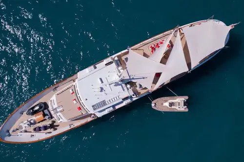 When she’s anchored, an elegant passerelle leads aft and down from double doors concealed in her stern to a bathing platform. This also provides a good launch pad for her fleet of small craft and a safe, easy place to step in and out of her 6m guest tender for transfers between ship and shore. Watersports toys on board includes a jetski, a Liftfoil, a paddleboard, a canoe, and a second RIB.