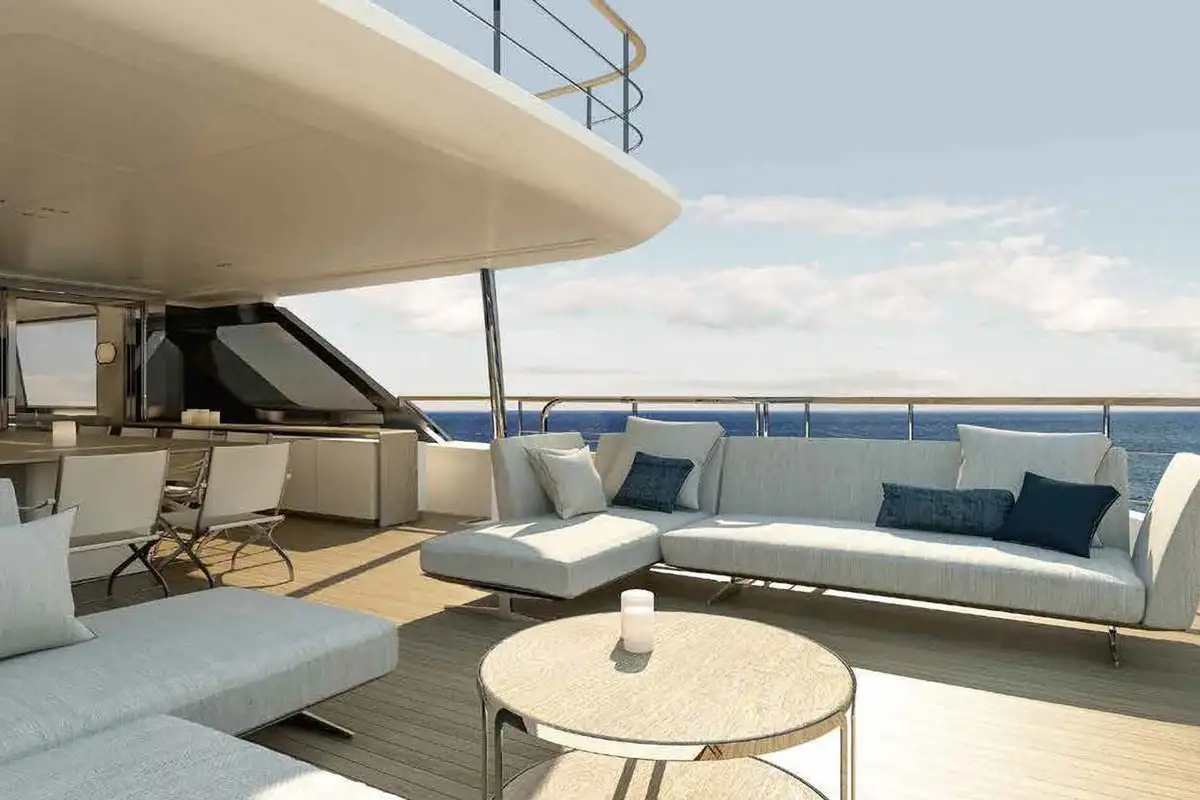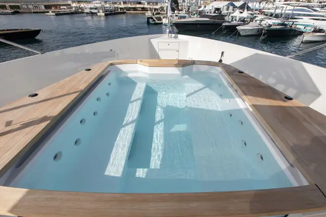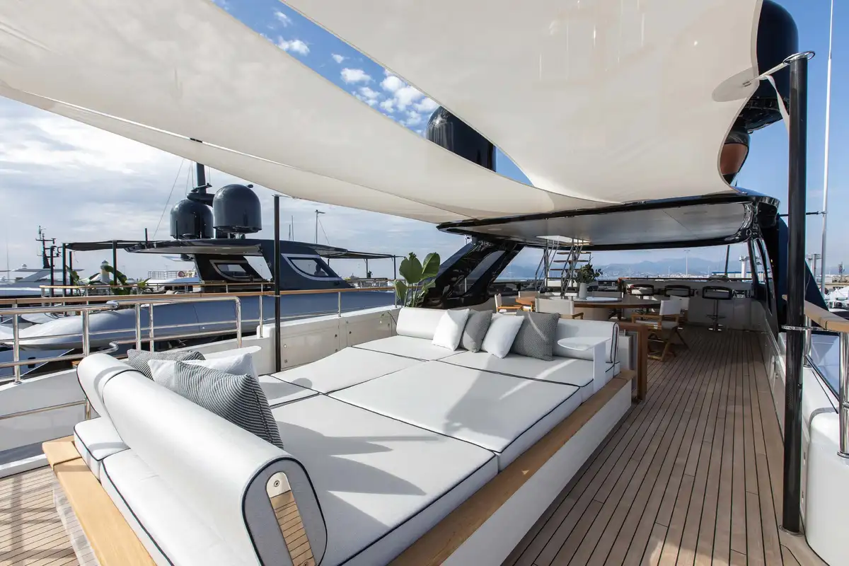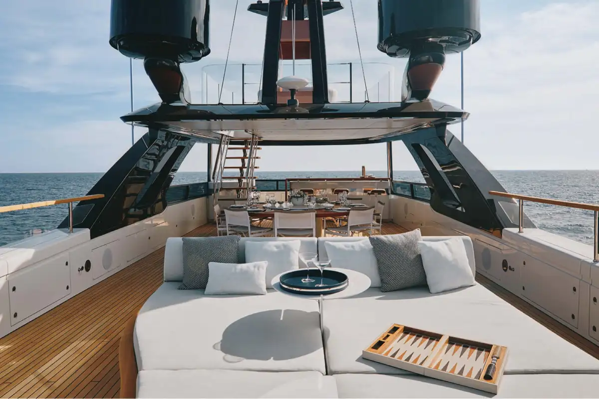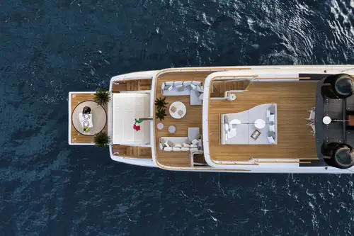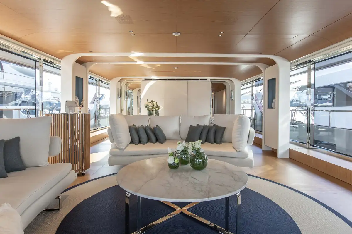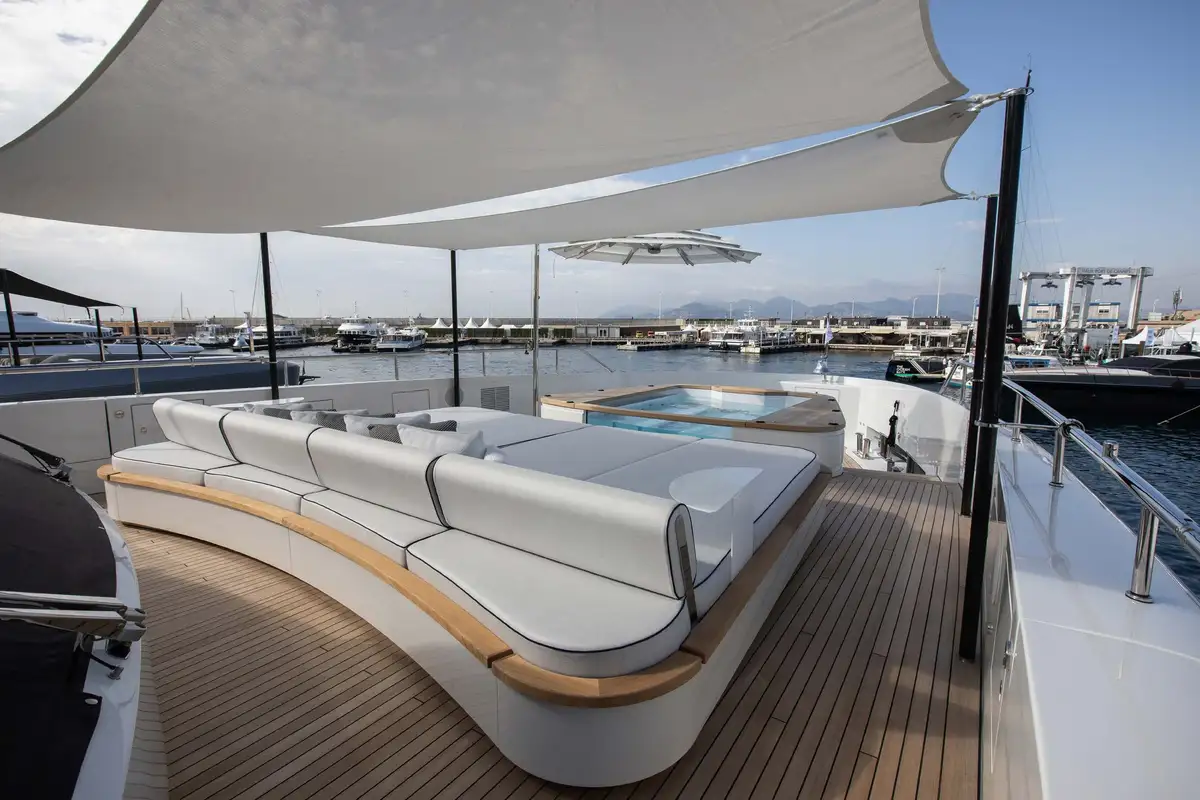 Welcome aboard the delightful ALLURIA. Launched in 2023, this modern Benetti Motopanfilo 37m (121.4ft) makes the perfect platform for a sophisticated getaway with loved ones, family and friends. Her contemporary feel, accompanied by her bright and stylish interior and immaculate presentation, will build everlasting memories. Her deck is spacious, social and stunning. The Portuguese bridge al fresco lounge area creates a wonderful space to unwind: a vast sun pad and a large jacuzzi make the foredeck ideal for leisurely afternoons at anchor. ALLURIA’s fold-down transom expands the swim platform to create an expansive beach club area and sea terrace, perfect for intimate dining beneath the retractable canopy or sun-drenched afternoons or sunset cocktails close to the water.