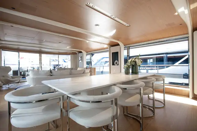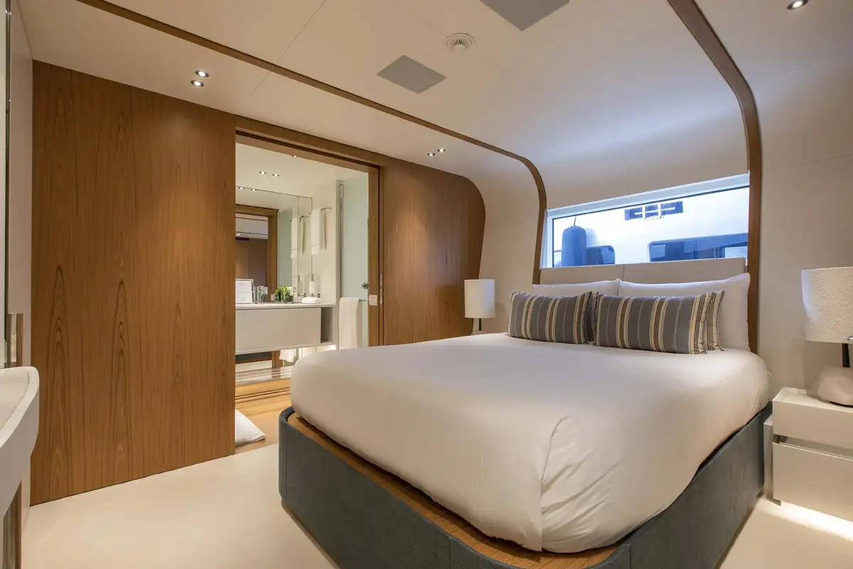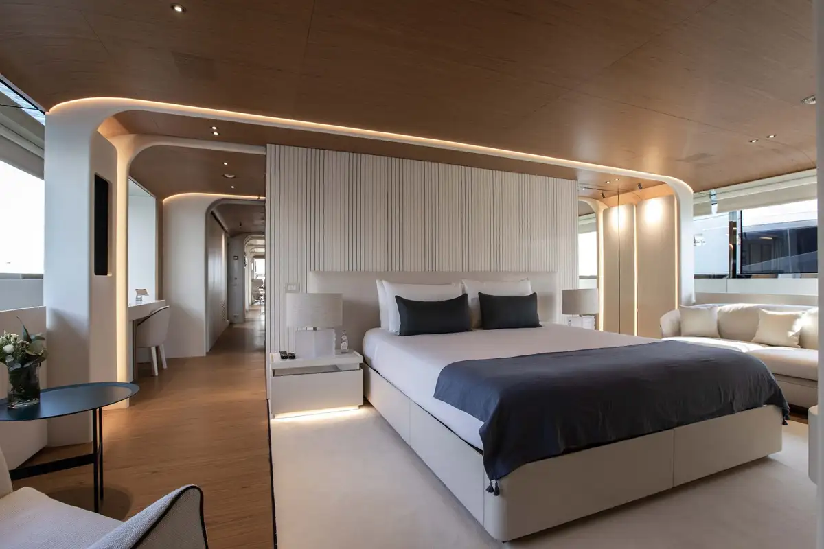There’s a second al fresco dining area on the upper deck, and to the rear of this elegant dining area is an al fresco lounge. Ahead is the sky lounge with sofa seating and a TV for all to watch. For more formal occasions, the formal dining area set in the main lounge is a chic location to enjoy the creations from ALLURIA’s talented professional chef. During the day, floor-to-ceiling windows flood the lounge with light. White detailing and natural wood overhead and beneath the foot create a relaxing feel to this calming space.