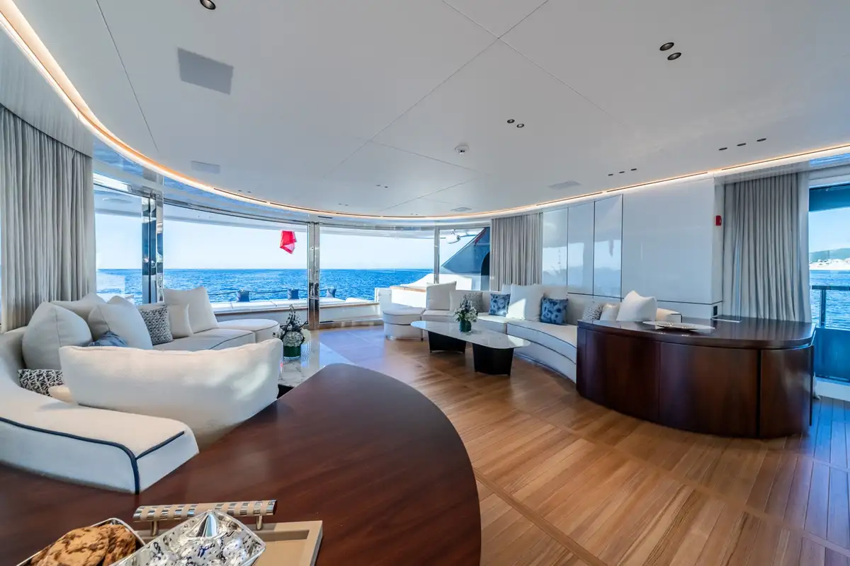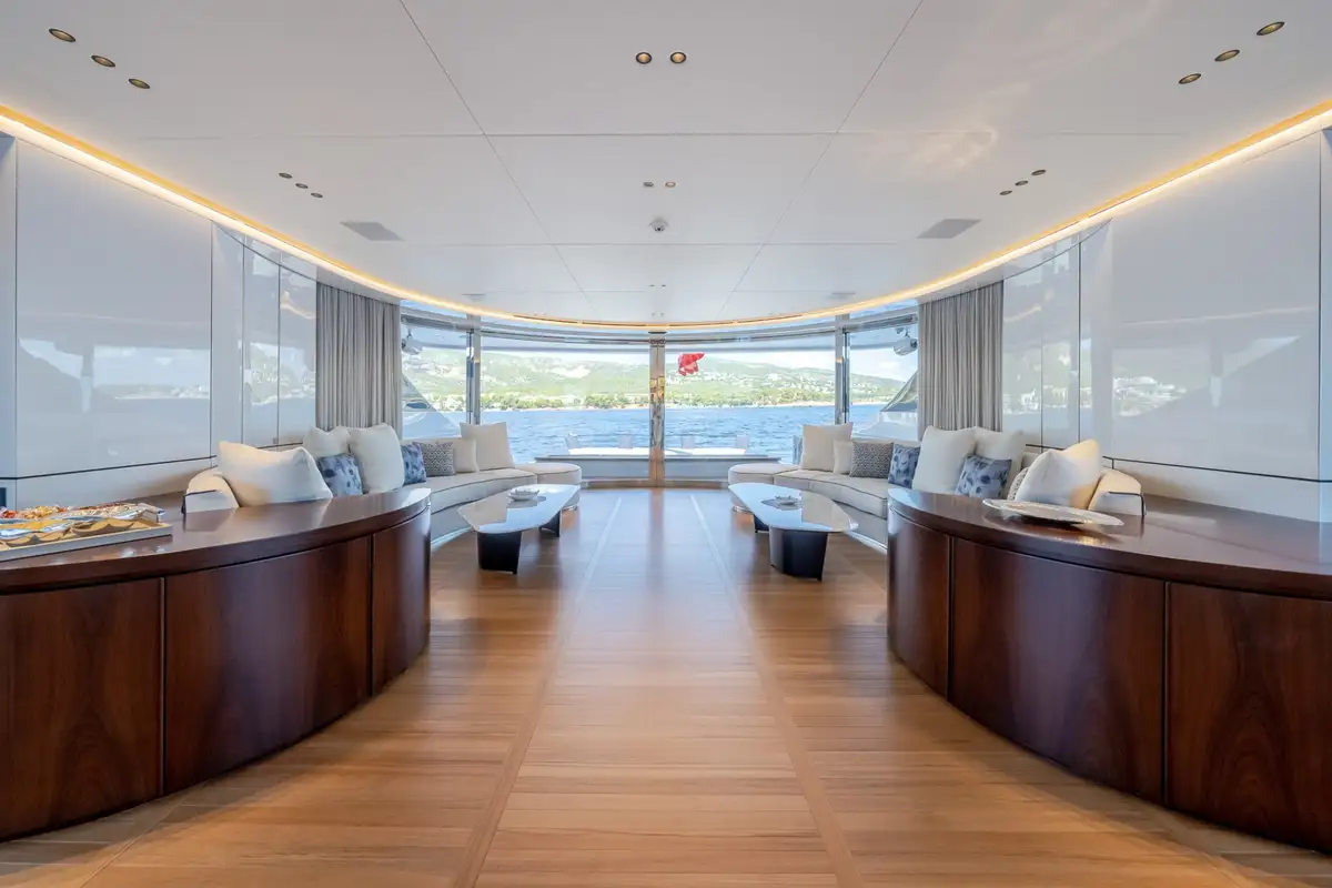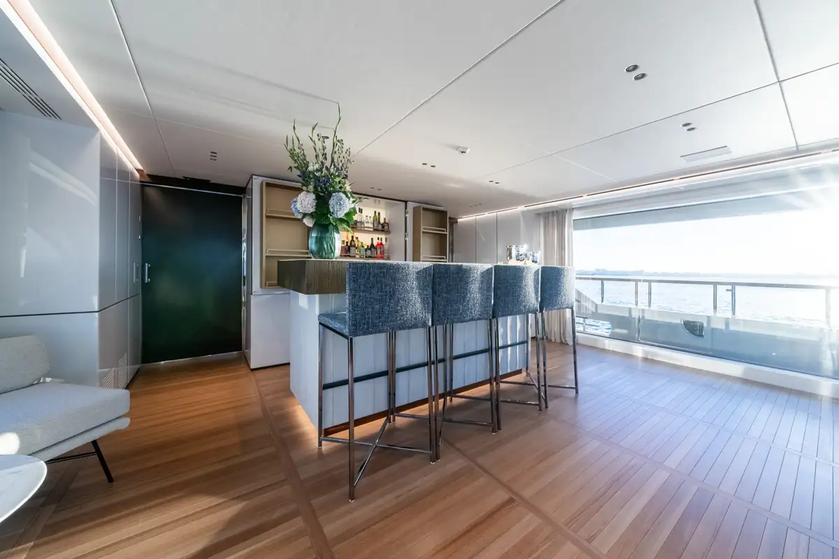 A graceful arc of floor-to-ceiling glass is all that separates the multi-level outdoor space astern from the impressively stylish lounge. Anchored in a bay with the glass slid wide open, more than half of the whole main deck becomes one vast, seamlessly flowing space from the bar through the lounge and out past the seats and sunbeds to the pool and the fleet of tenders and toys.