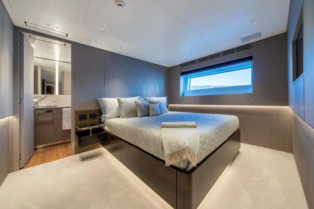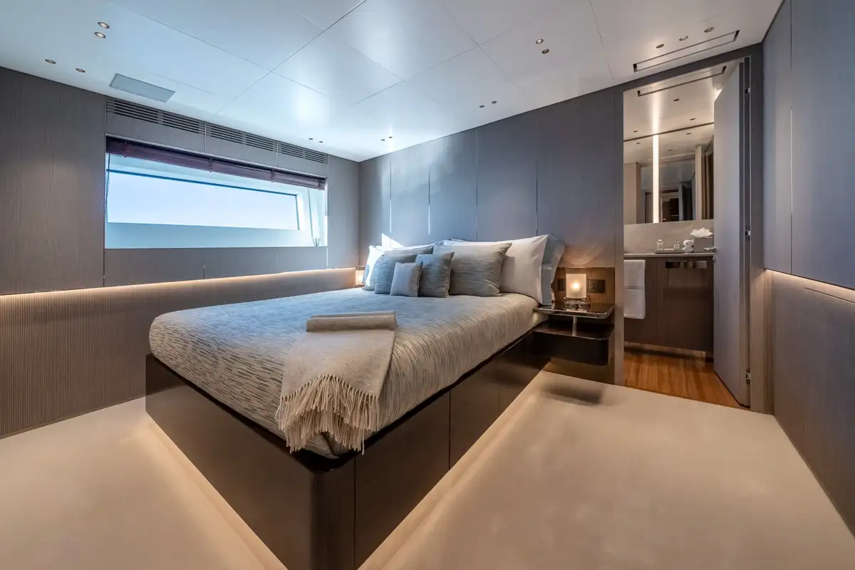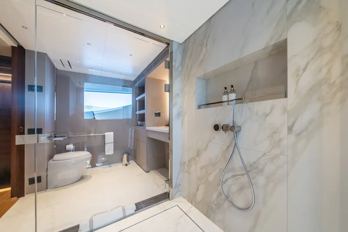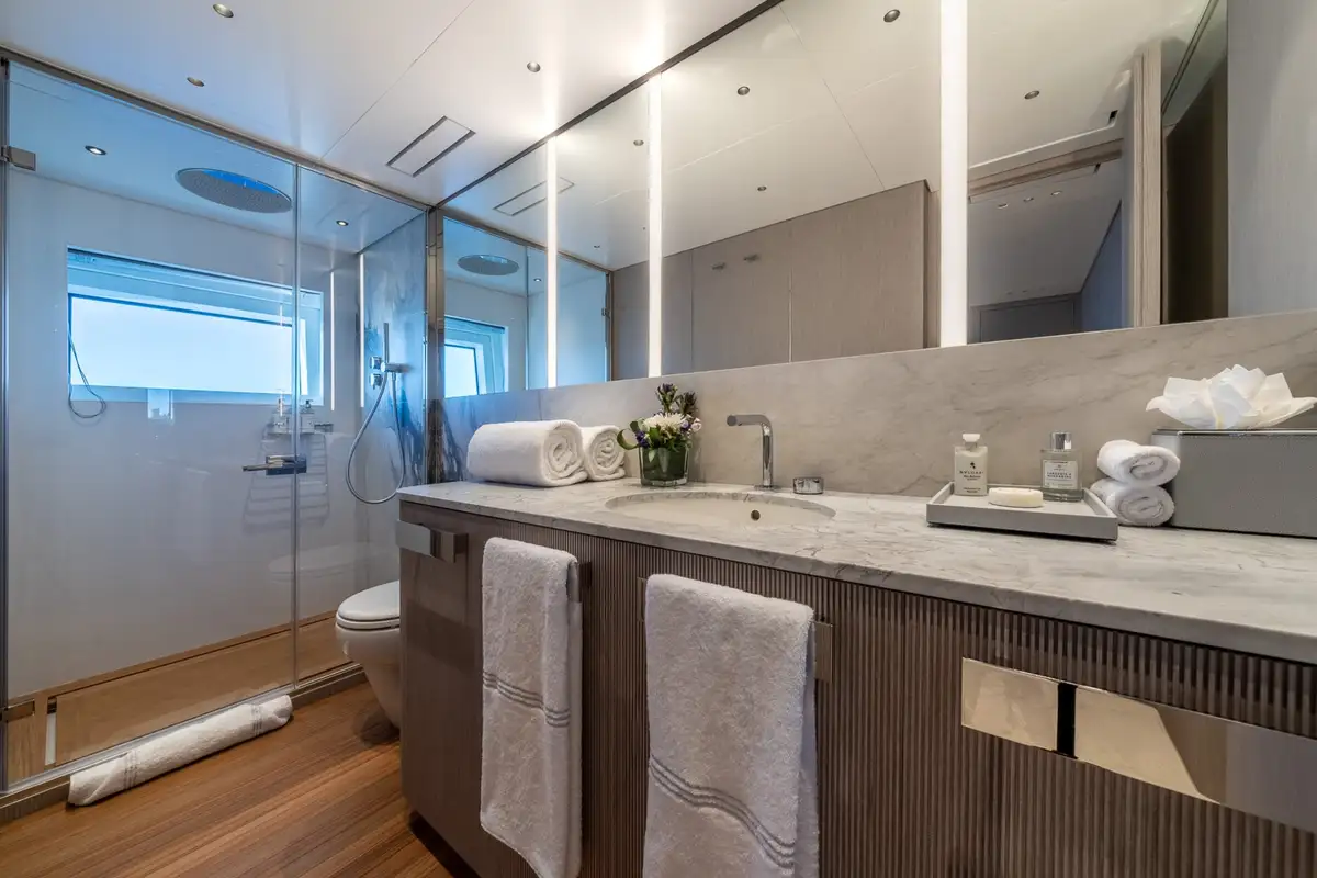 The master suite is a full-beam cabin at the forward end of the main deck with a seating area on one side of the main cabin, a big walk-in wardrobe and a marble en suite bathroom. The other four cabins on the lower deck include two VIP doubles and two twins.