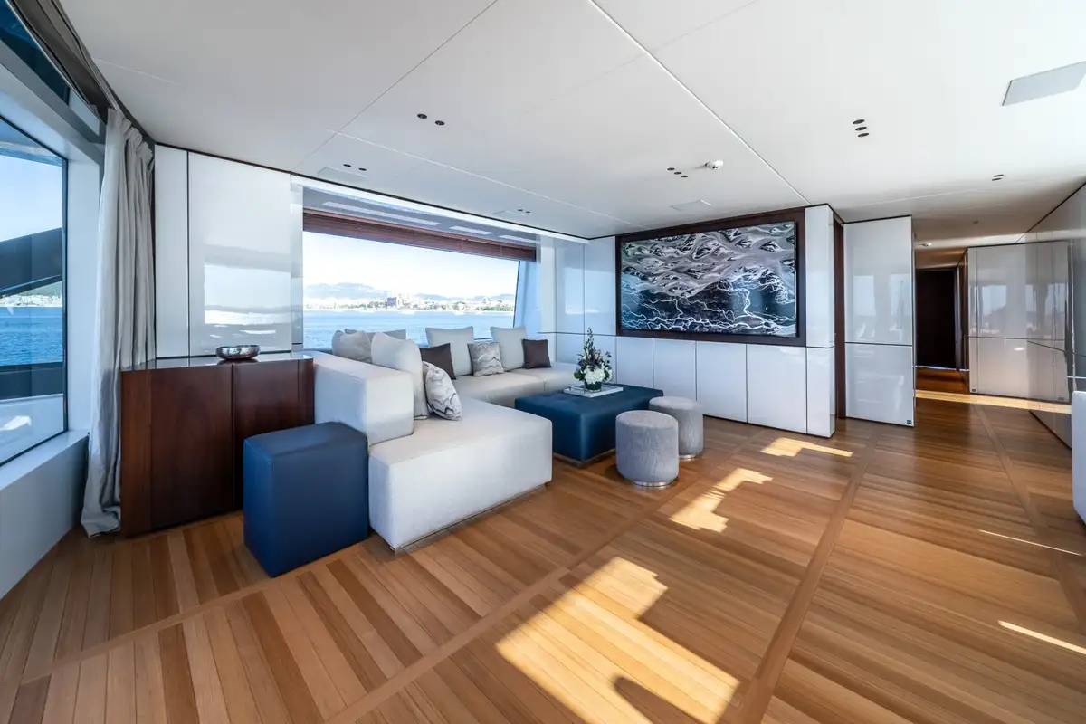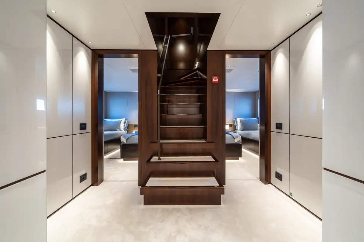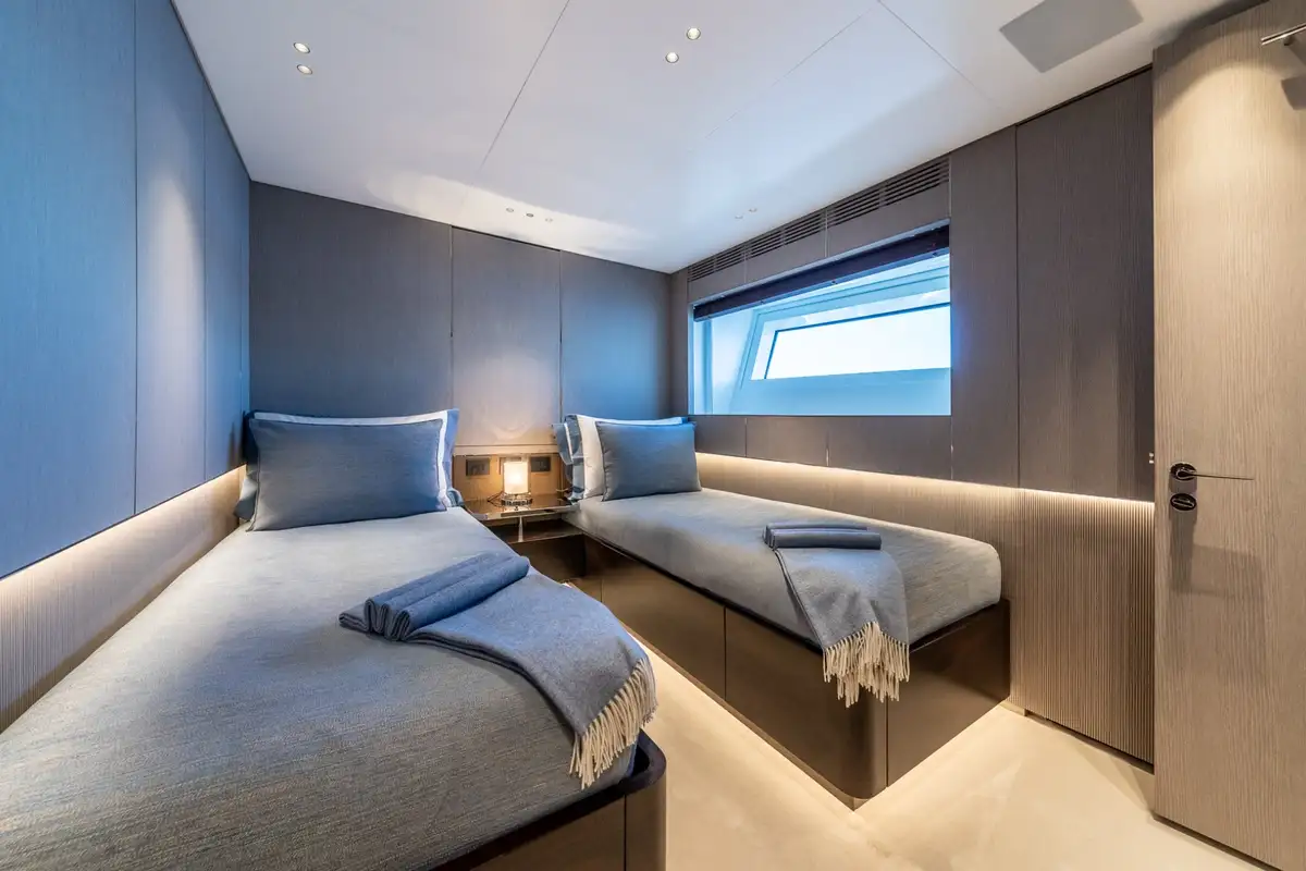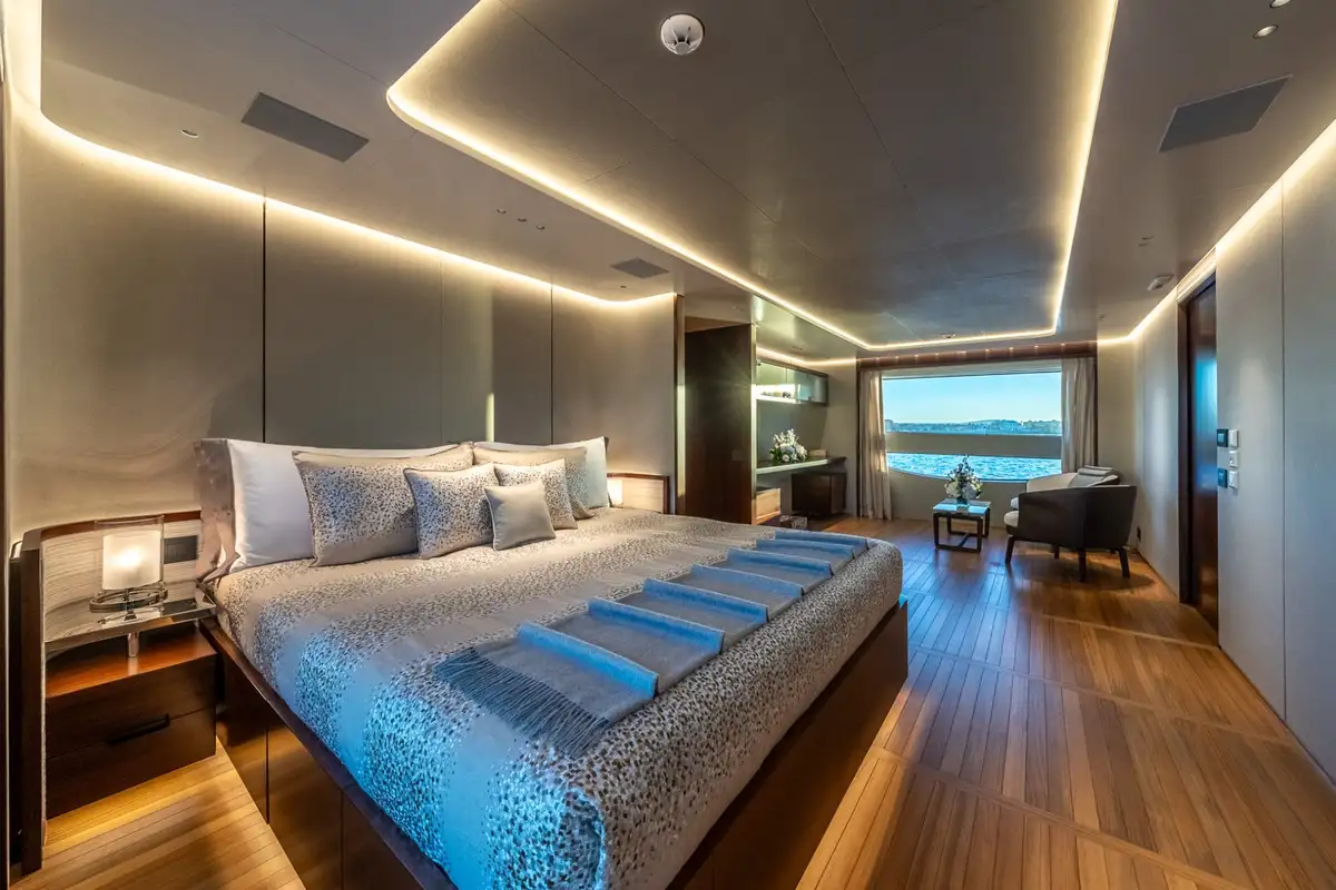 The master suite is a full-beam cabin at the forward end of the main deck with a seating area on one side of the main cabin, a big walk-in wardrobe and a marble en suite bathroom. The other four cabins on the lower deck include two VIP doubles and two twins.