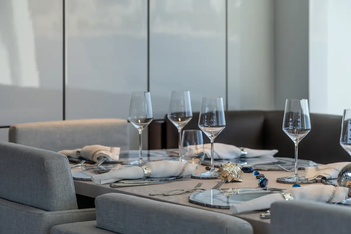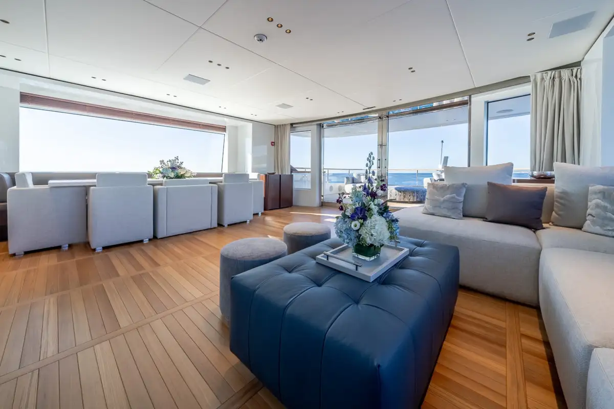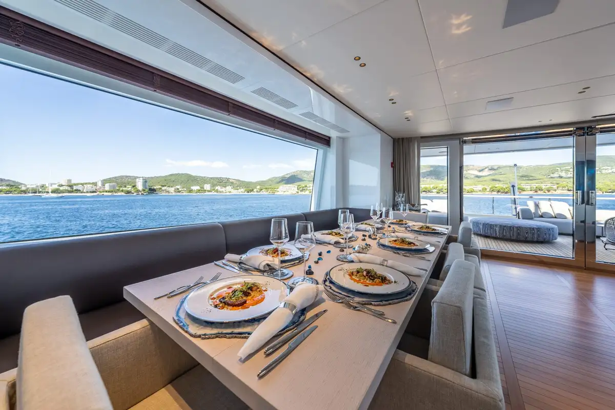 The sky lounge makes great use of the yacht’s full beam. There’s a cosy living room on the port-hand side with a huge TV, and an elegant formal dining area opposite, to starboard.