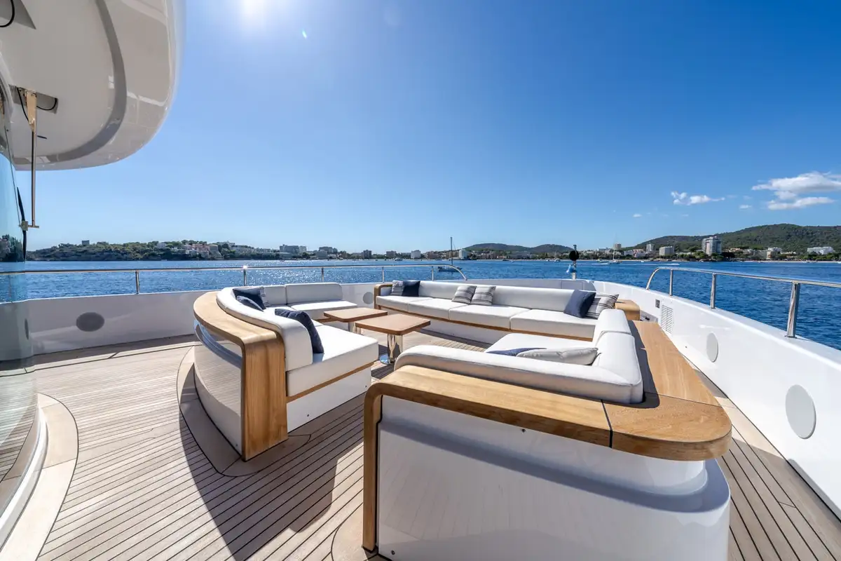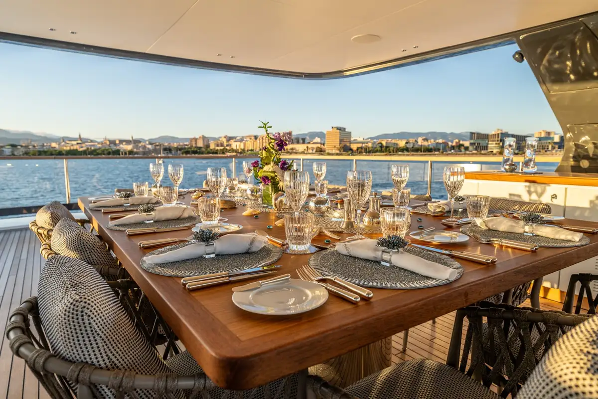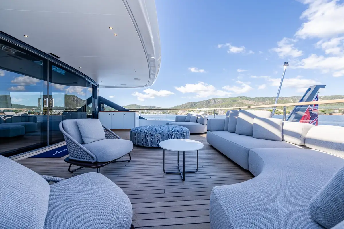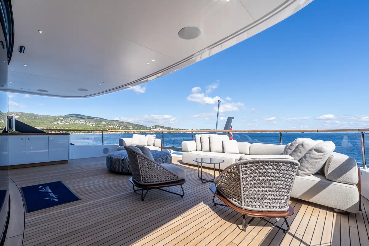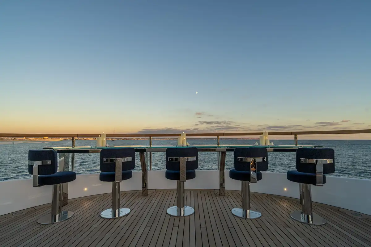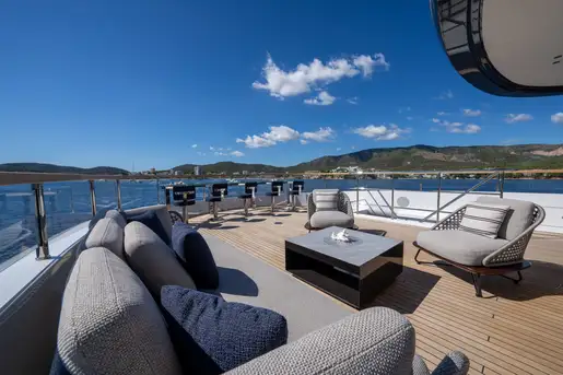 Benetti are renowned for clever use of space, and ALPHA WAVES is exceptional in this regard. The foredeck lounge is both snug and expansive, with seats for a large group to gather and four sunbeds too. The upper aft deck is a stylish lounge with armchairs in shade and sofas in full sun. And the sundeck is a magnificent, uncluttered space with a bar at the forward end, an open-air lounge facing aft and a splendid dining table amidships with ample shade. Glass bulwarks fore and aft make the excellent views even better.