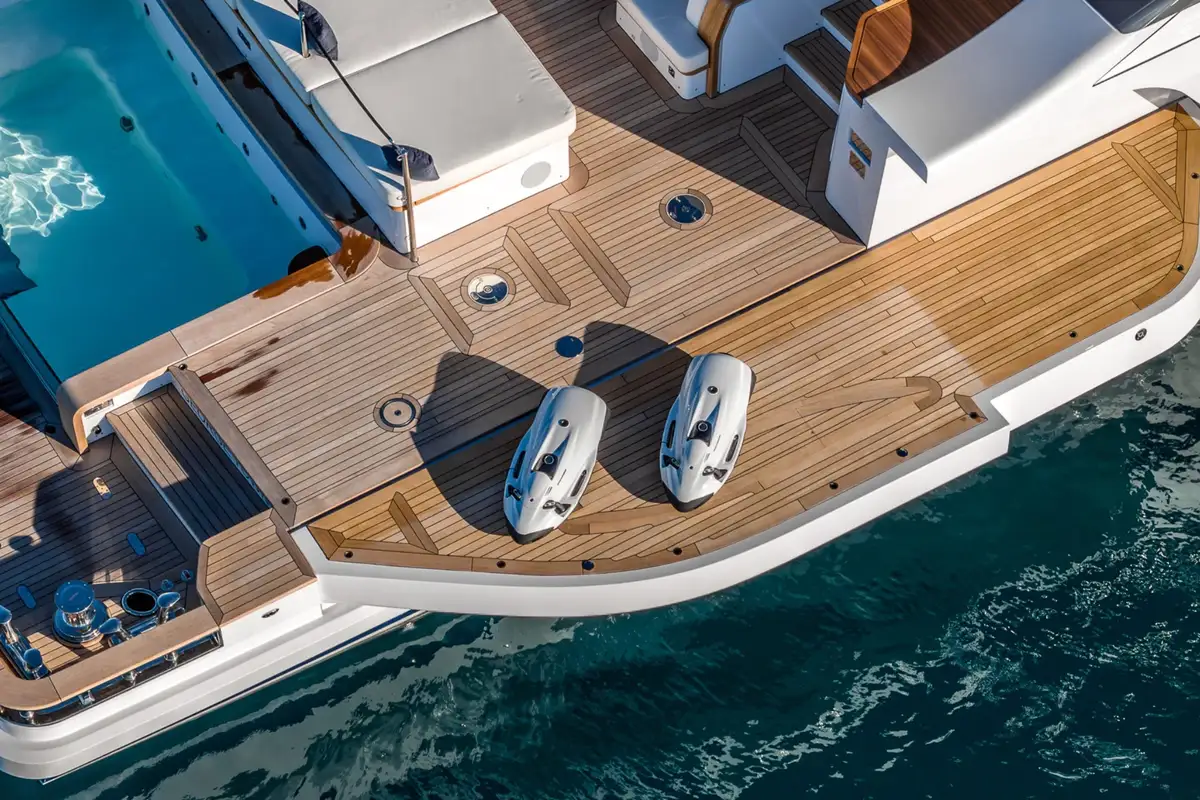 She carries three tenders and a wide range of toys. Highlights include a 12-metre (40ft) power cat with 1,200hp, a dedicated fishing boat, SeaBobs, kitesurfing kit – and a whole lot more.