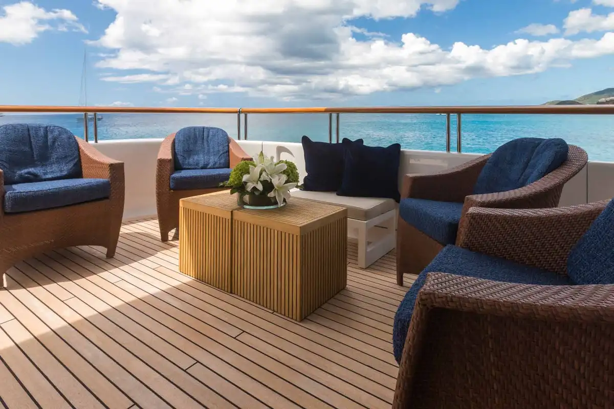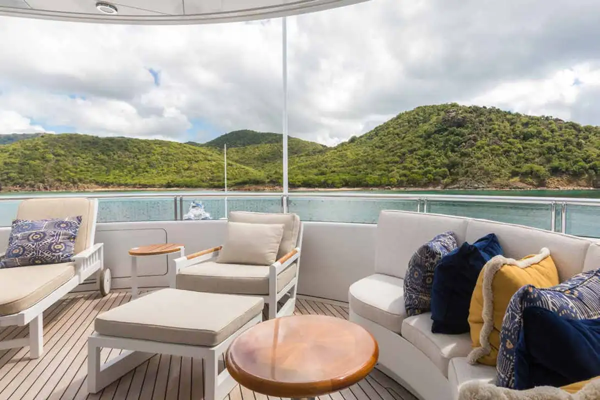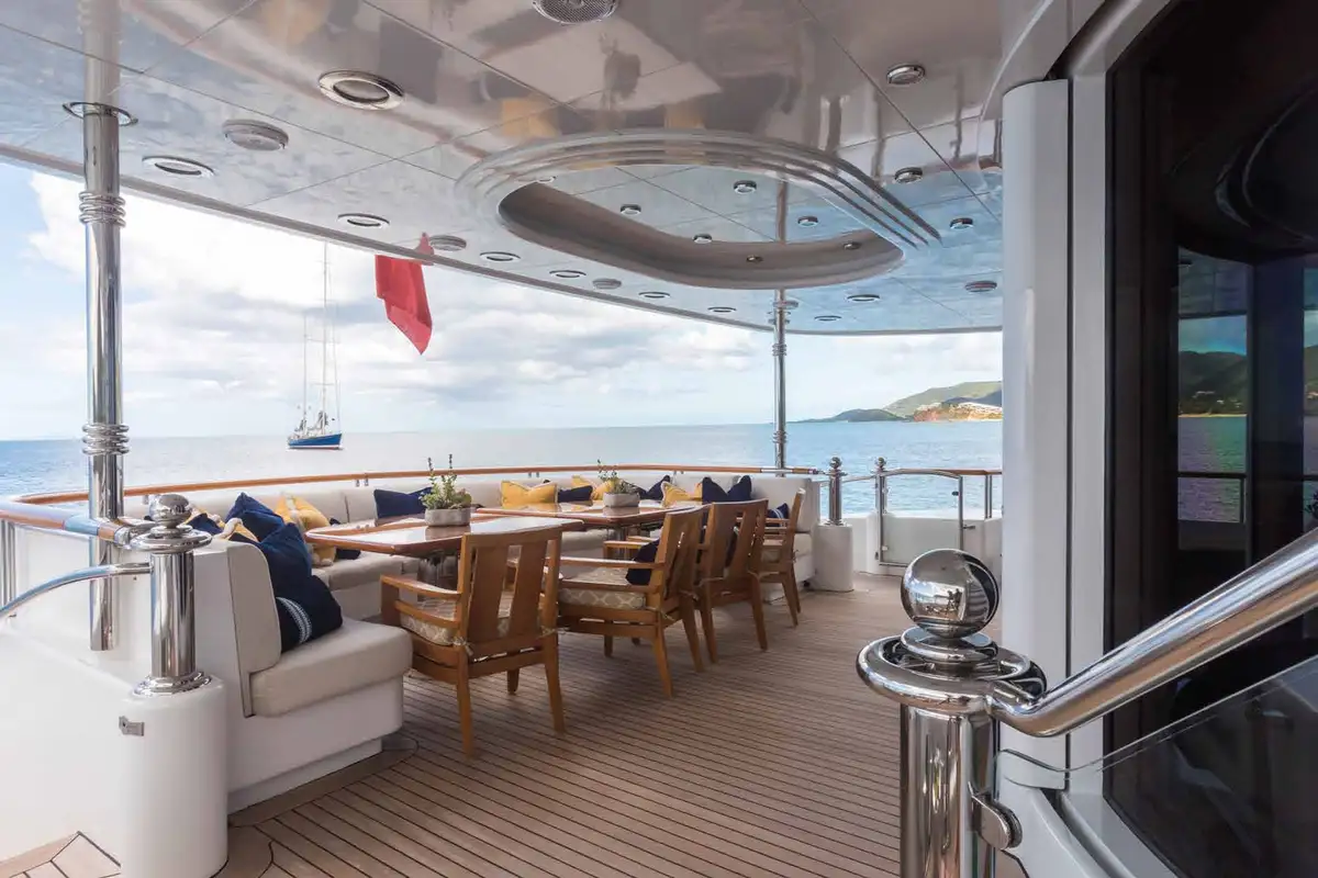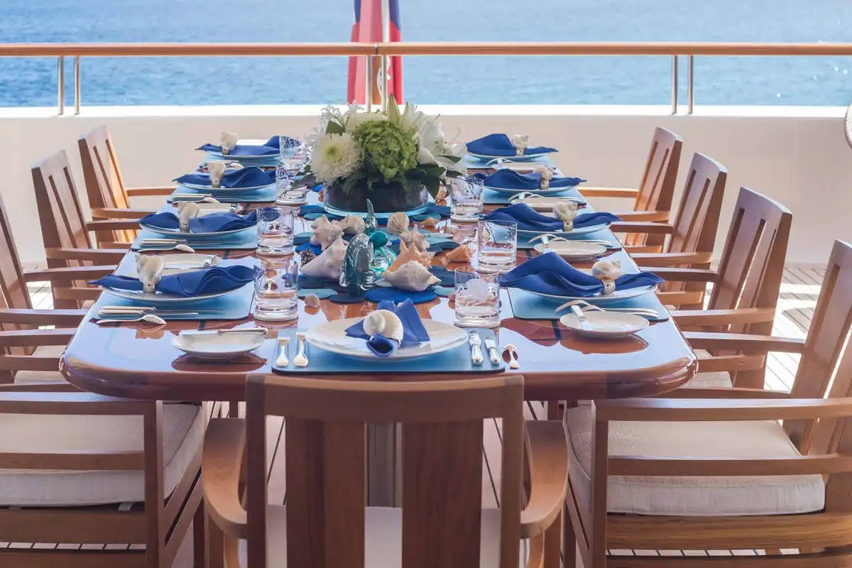 The upper aft deck is the main open-air dining zone on board. It’s elegant and uncluttered with panoramic views from the big teak table and ample space to invite a couple of extra guests on board for a sociable dinner party.