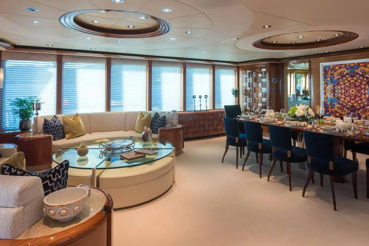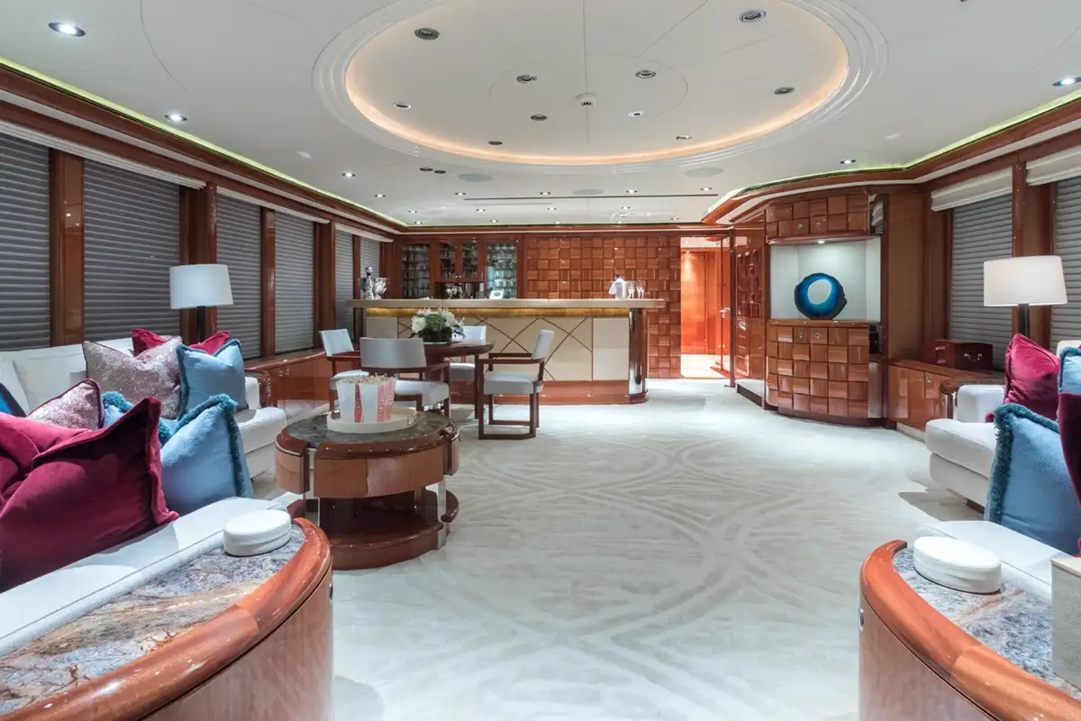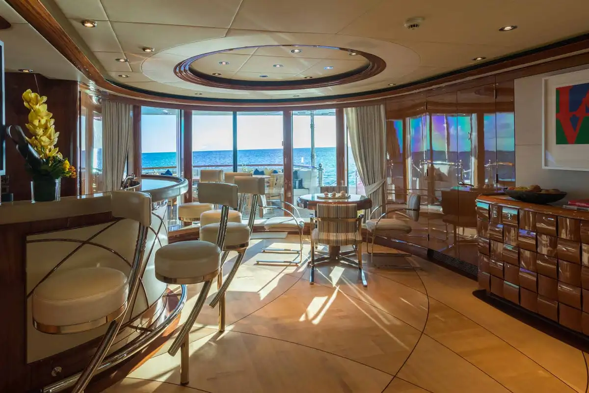 The main deck saloon has gorgeous flowing curves, a marble floor, iconic modern art, huge windows and a high-gloss hardwood finish. There’s a sleek bar, a chic and comfortable lounge, and an impressive dining area.