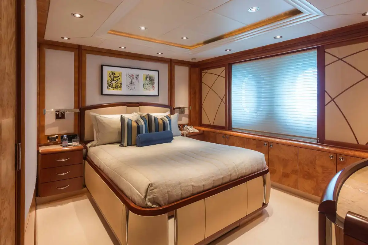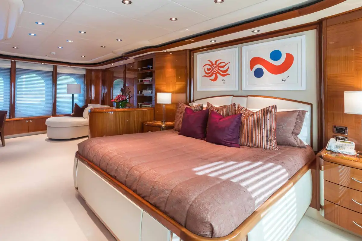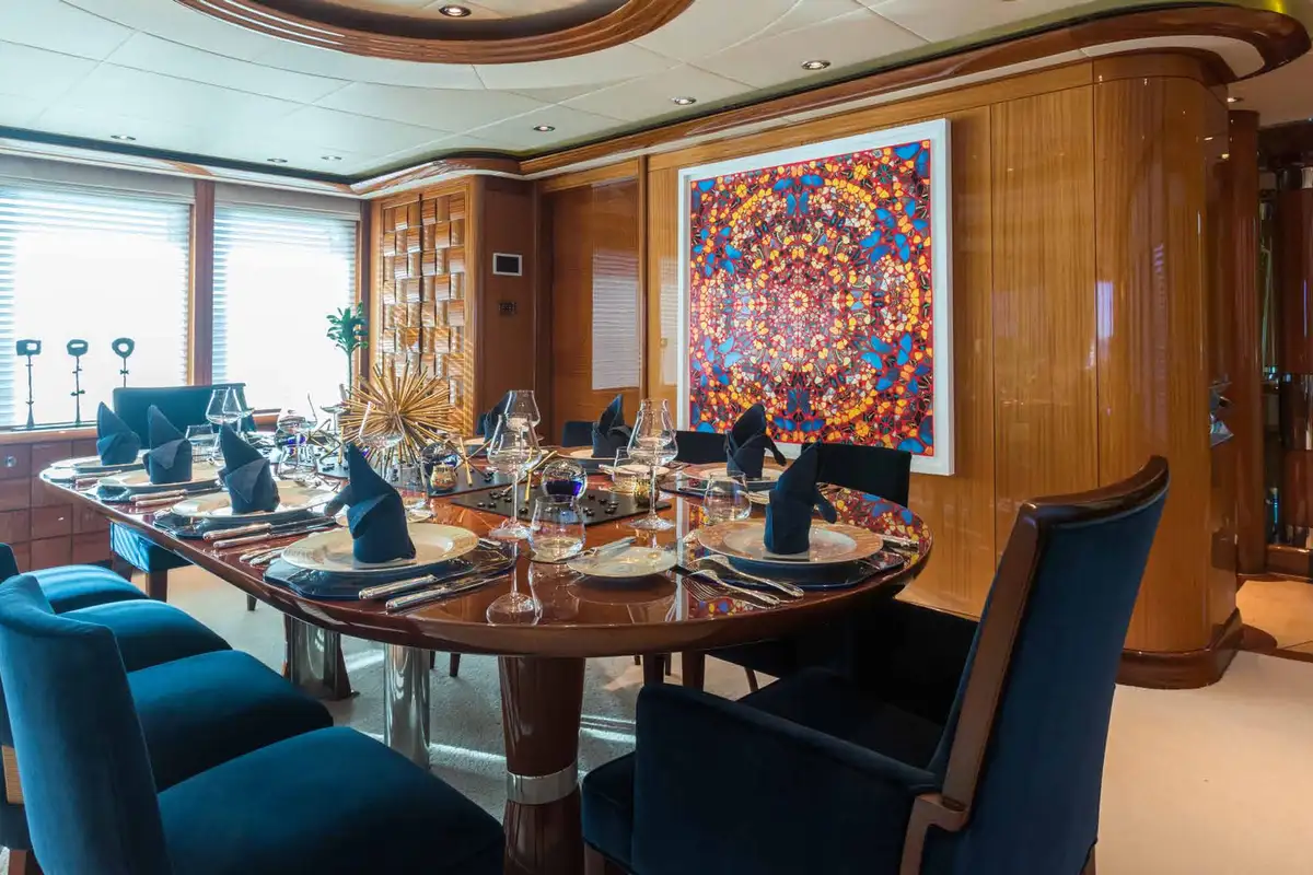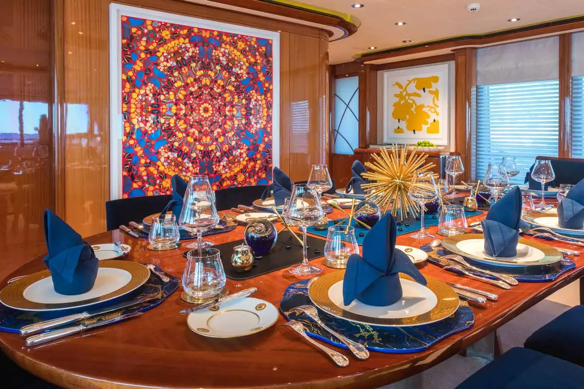 The main deck saloon has gorgeous flowing curves, a marble floor, iconic modern art, huge windows and a high-gloss hardwood finish. There’s a sleek bar, a chic and comfortable lounge, and an impressive dining area.