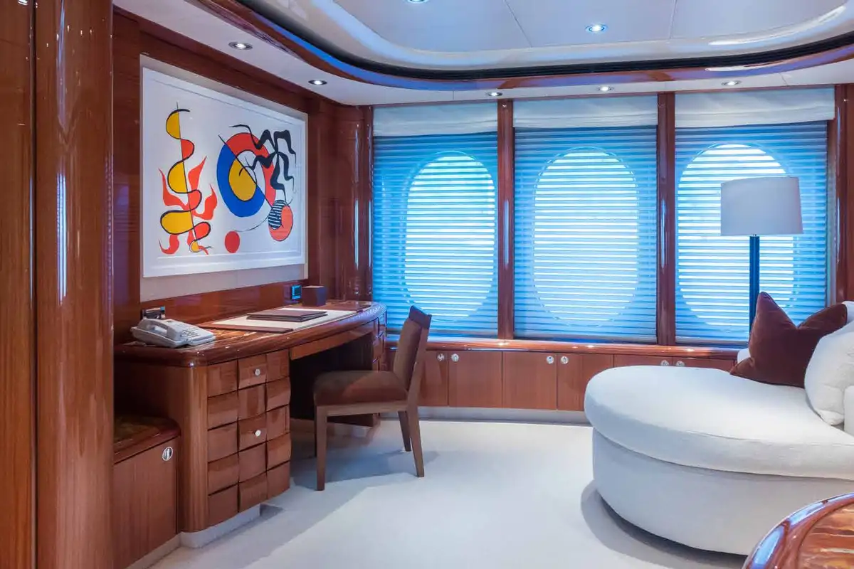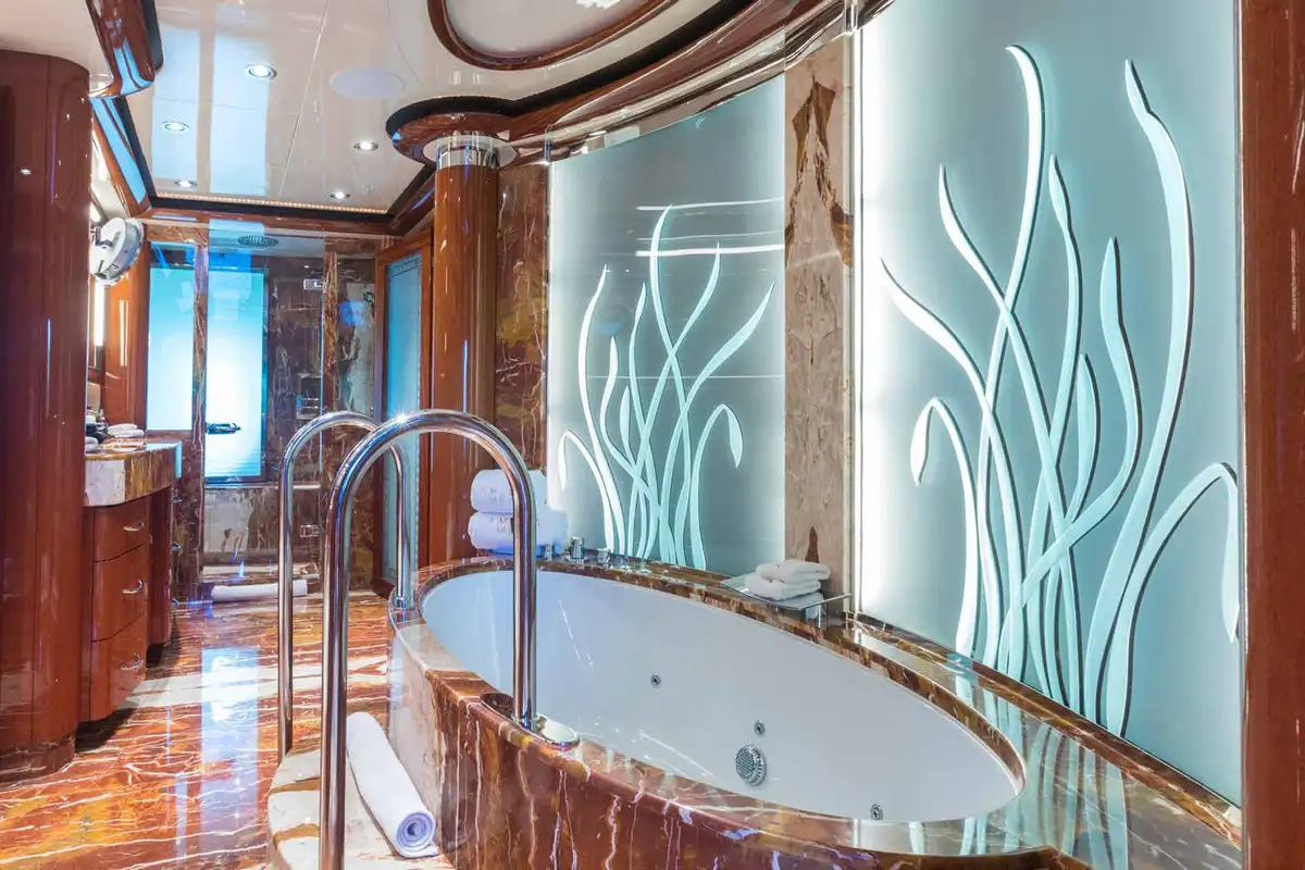 All the way forward on the main deck you’ll find an exceptional master suite. The main cabin is spacious and soothing with subtle mood lighting and an amazing quality of finish. There’s plenty of natural light and great sea views from three big oval windows on each side. You’ll have study and lounge areas for your private use. Double doors lead into the spectacular marble bathroom, which has a walk-in dressing room and an enormous bathtub as well as a large, separate shower.