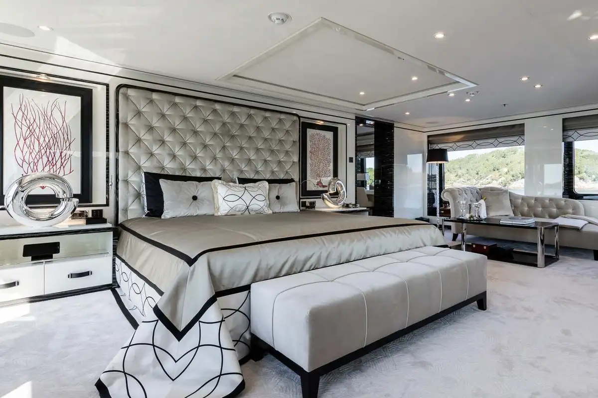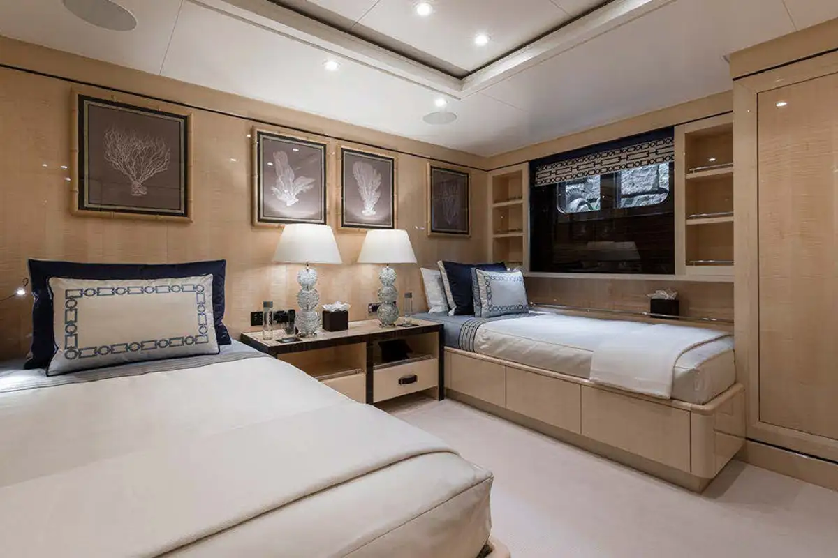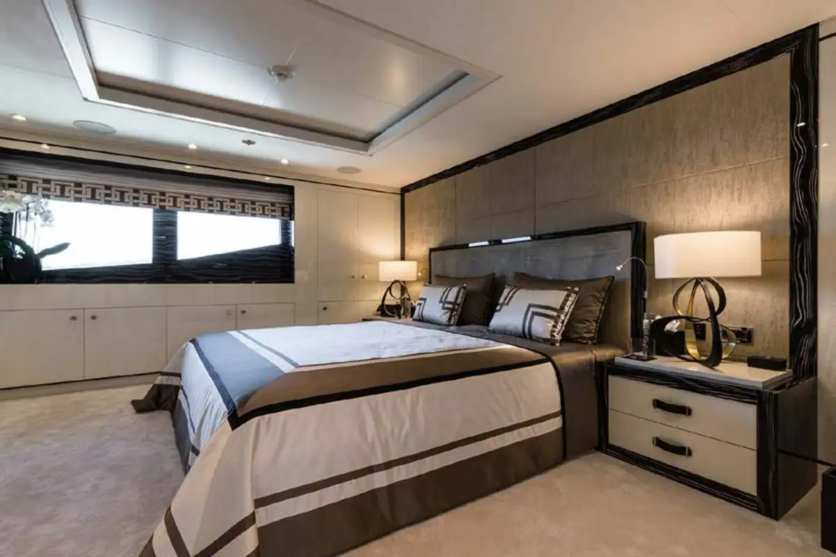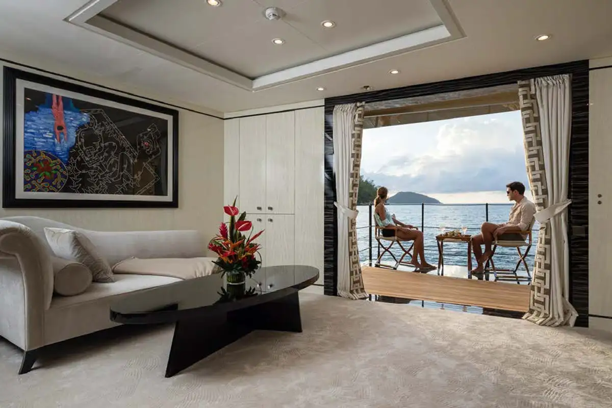 Guests boarding AMIGOS from her large beach club will find palatial steps leading up to the main deck. Here you can enjoy a welcome drink before settling into your accommodation in the bridge deck master suite where you will be afforded breathtaking views and benefit from a private deck. Your guests will be shown to their own comfortable rooms, which include a VIP cabin on the main deck (with fold down terrace) and four further cabins on the lower deck.