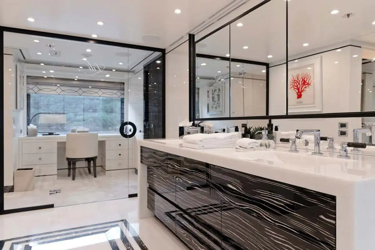 As with all the interior areas, a striking monochrome theme runs throughout. Guests will most likely be keen to head straight into the water, whether in the sun deck jacuzzi or directly into the ocean. Those on the sun deck can spend the morning lounging on the sun pads or the loungers aft. Lunch on board is usually a relaxed affair when all the guests generally come together on the sun deck where an al fresco dining set up is shaded by the hardtop.
