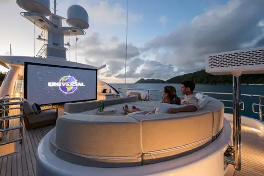 Ready for the evening ahead, head to the main deck and the stunning bar for a pre-dinner drink, before an al fresco dinner on the main deck aft. Step inside for music and entertainment, watch a movie on the sumptuous sofa or head up to the sun deck for a moonlit movie night. When the night comes to an end, perhaps enjoy one last nightcap on the private terrace of your master suite and reminisce about your amazing day aboard AMIGOS.