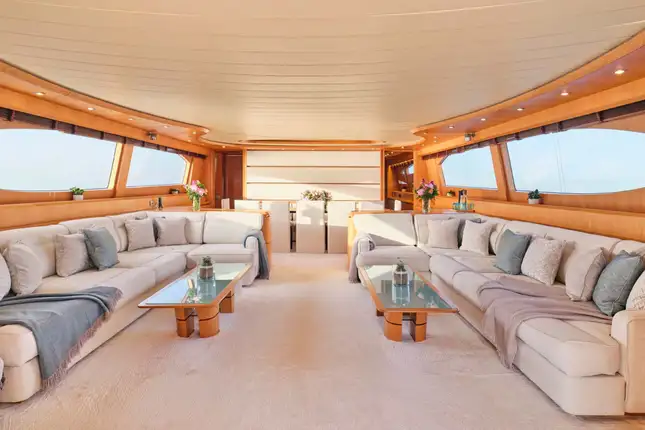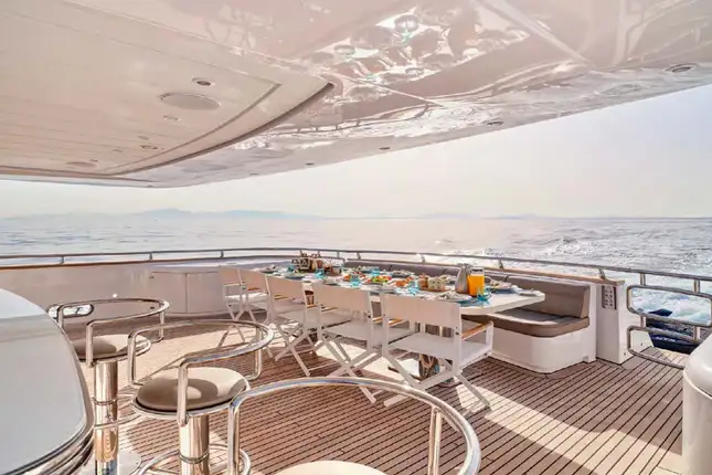 On deck, guests are spoiled for choice. The elegant aft deck is perfect for al fresco dining with panoramic sea views. The expansive sun deck offers a stylish lounge, wet bar, and dining area – ideal for sunbathing, sunset drinks, or moonlit celebrations.