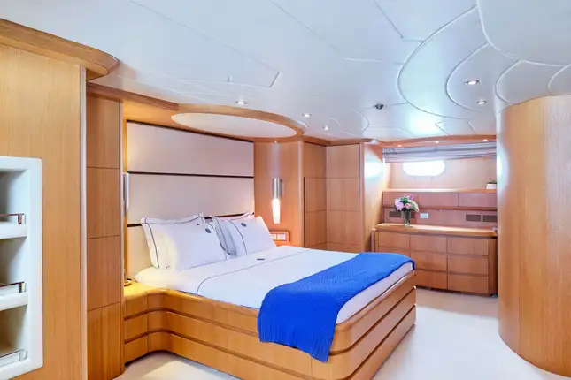 ANASA accommodates up to 12 guests in five luxurious cabins, each offering exceptional space and comfort. The layout includes a full-beam master suite on the lower deck, a full-beam VIP cabin on the main deck, a second VIP on the lower deck, and two twin cabins with pullman berths – all en suite. Each space is a private retreat, finished with chic décor and plush bedding for a true five-star feel.