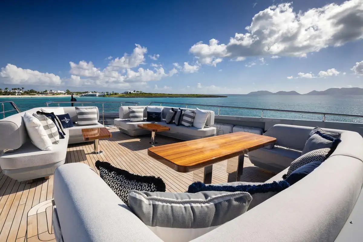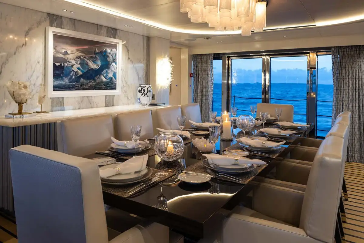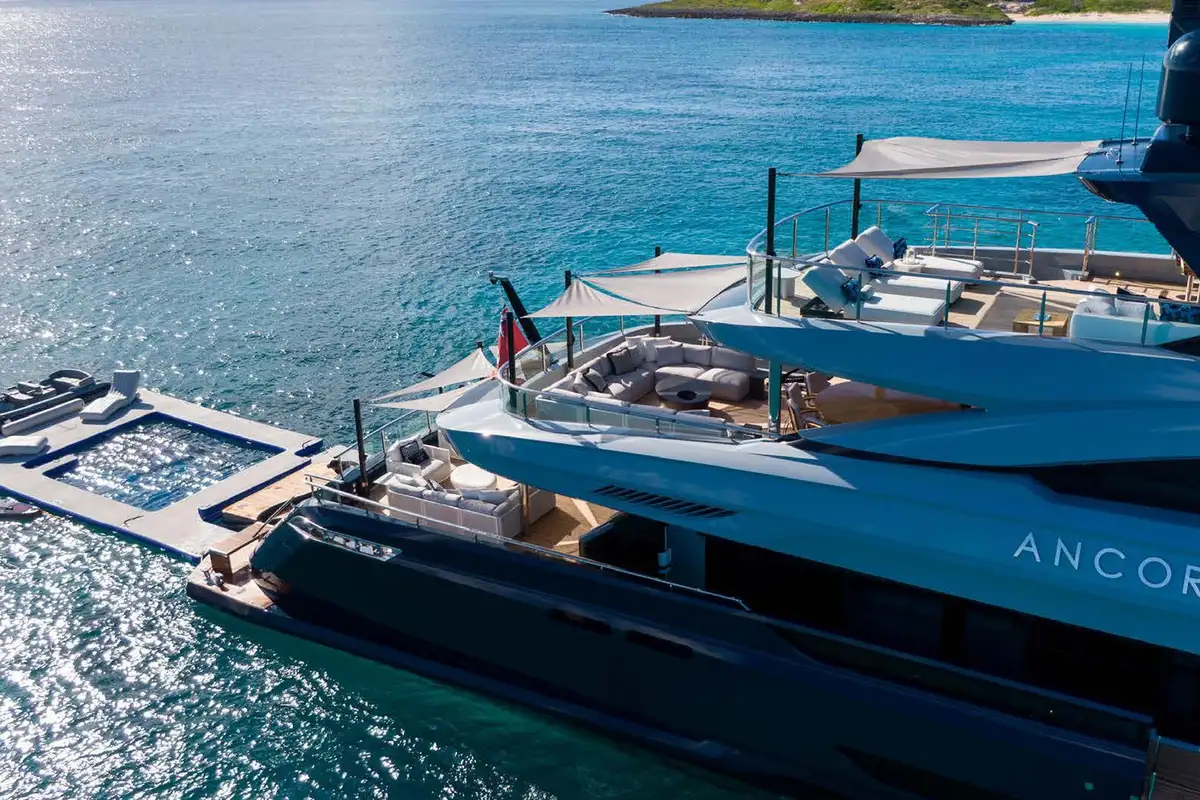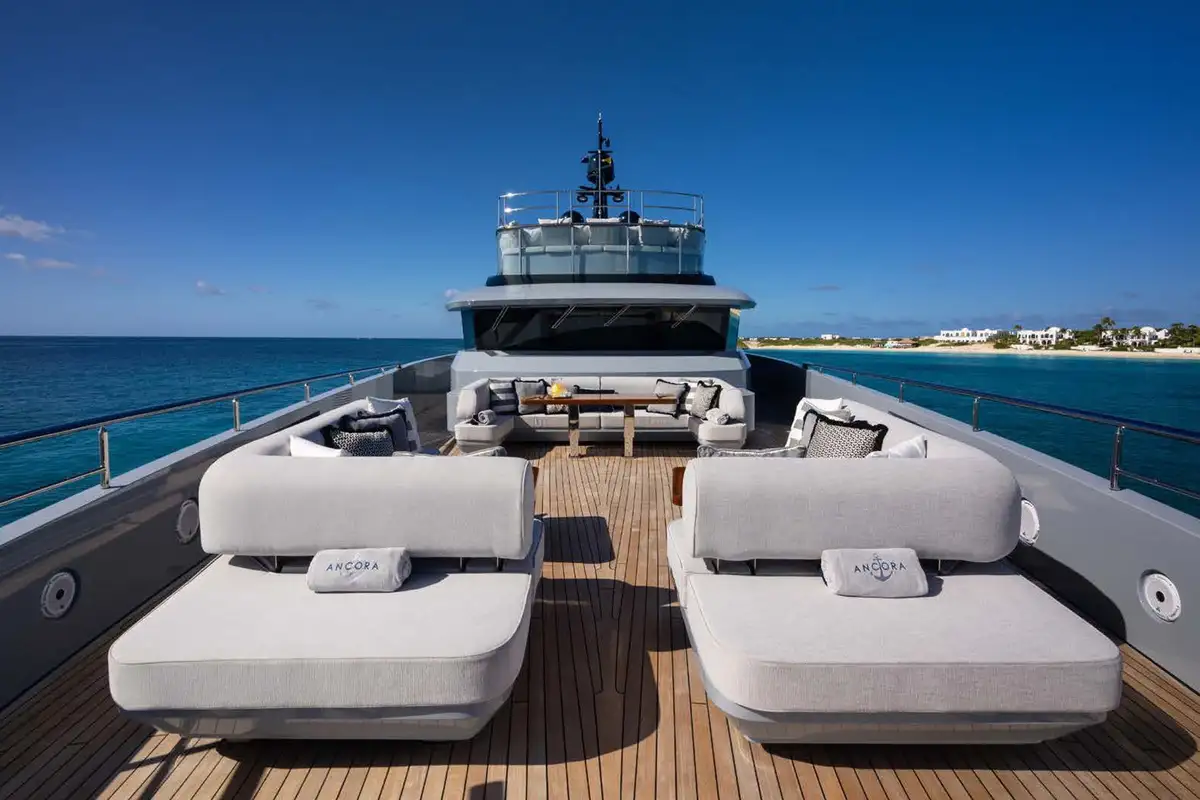 Life on board ANCORA is effortlessly refined. Her expansive decks offer a mix of open-air lounging, shaded dining, and standout features like a beach club at water level and a bubbling jacuzzi with panoramic views. A scenic on board experience continues after dark, with dramatic underwater lights adding a cinematic glow to evening swims and sunset cocktails. With a full crew of nine attending to every detail, guests can relax completely into the rhythm of life at sea.