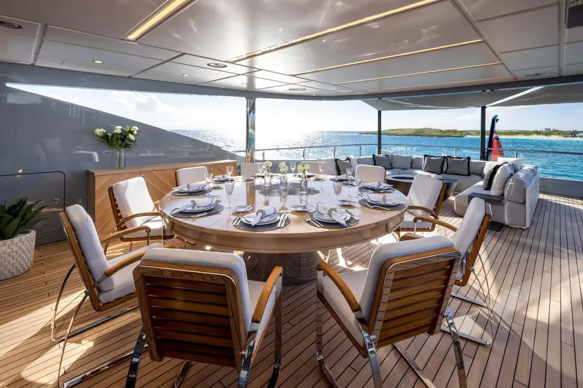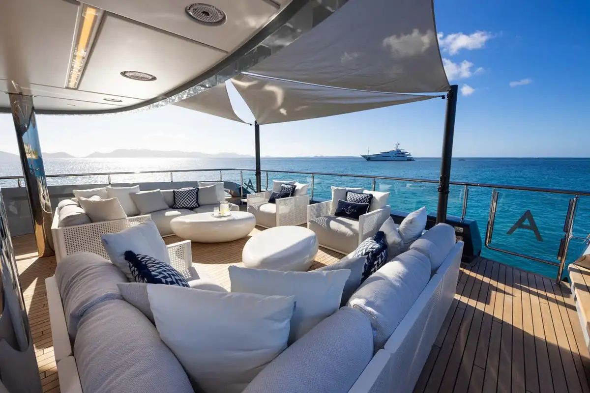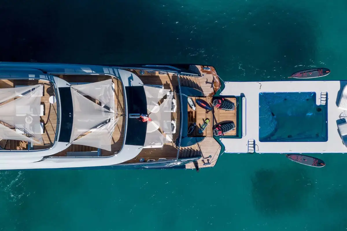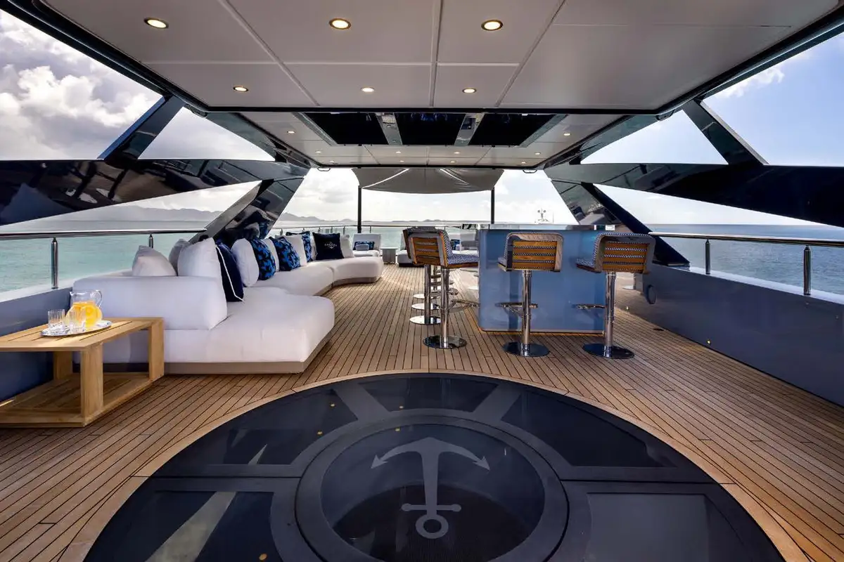 Life on board ANCORA is effortlessly refined. Her expansive decks offer a mix of open-air lounging, shaded dining, and standout features like a beach club at water level and a bubbling jacuzzi with panoramic views. A scenic on board experience continues after dark, with dramatic underwater lights adding a cinematic glow to evening swims and sunset cocktails. With a full crew of nine attending to every detail, guests can relax completely into the rhythm of life at sea.