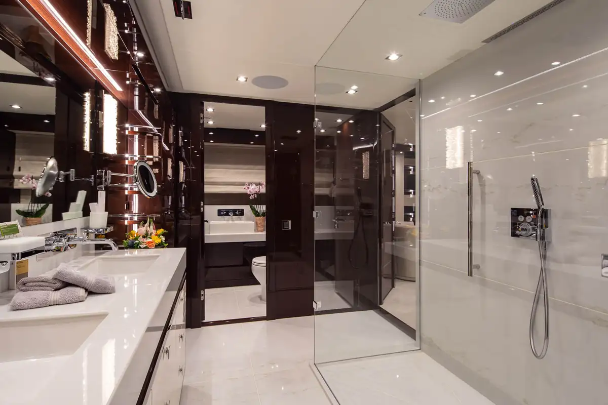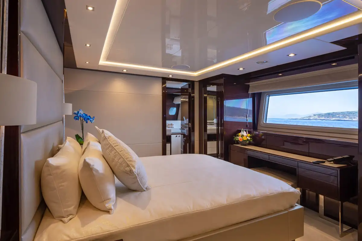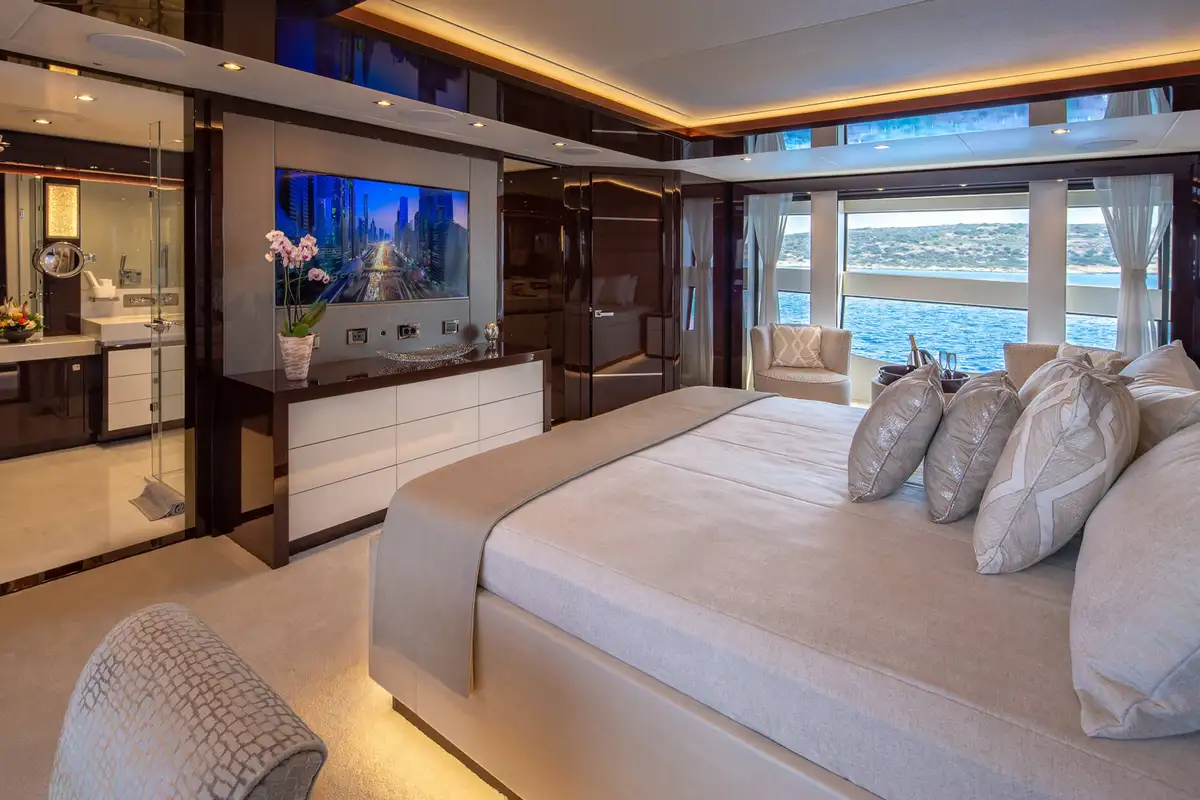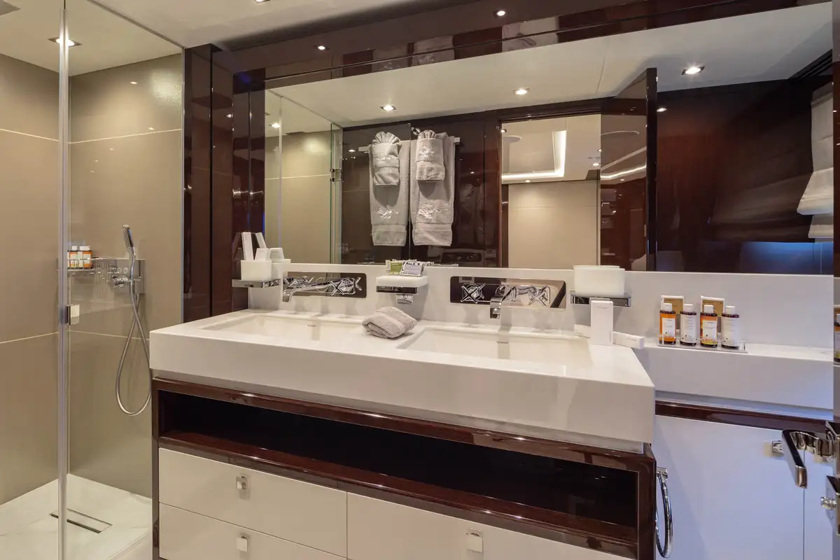 The master suite is an opulent full-beam cabin on the main deck with a lounge area on one side of the king size bed, a desk on the other and big windows on both sides. The en suite bathroom is a his-and-hers configuration with a rain room shower, twin sinks and two toilets. The other four guest cabins are two VIP doubles and two twins that convert to doubles, so she’ll easily adapt to your needs.