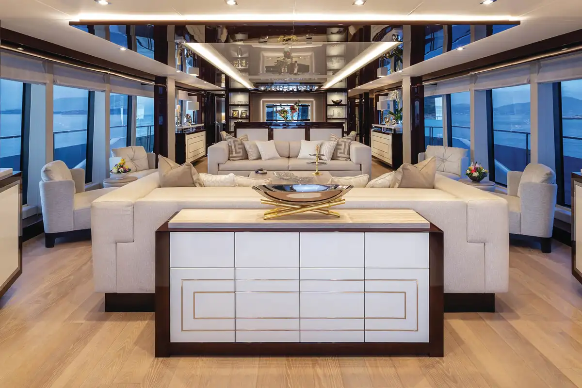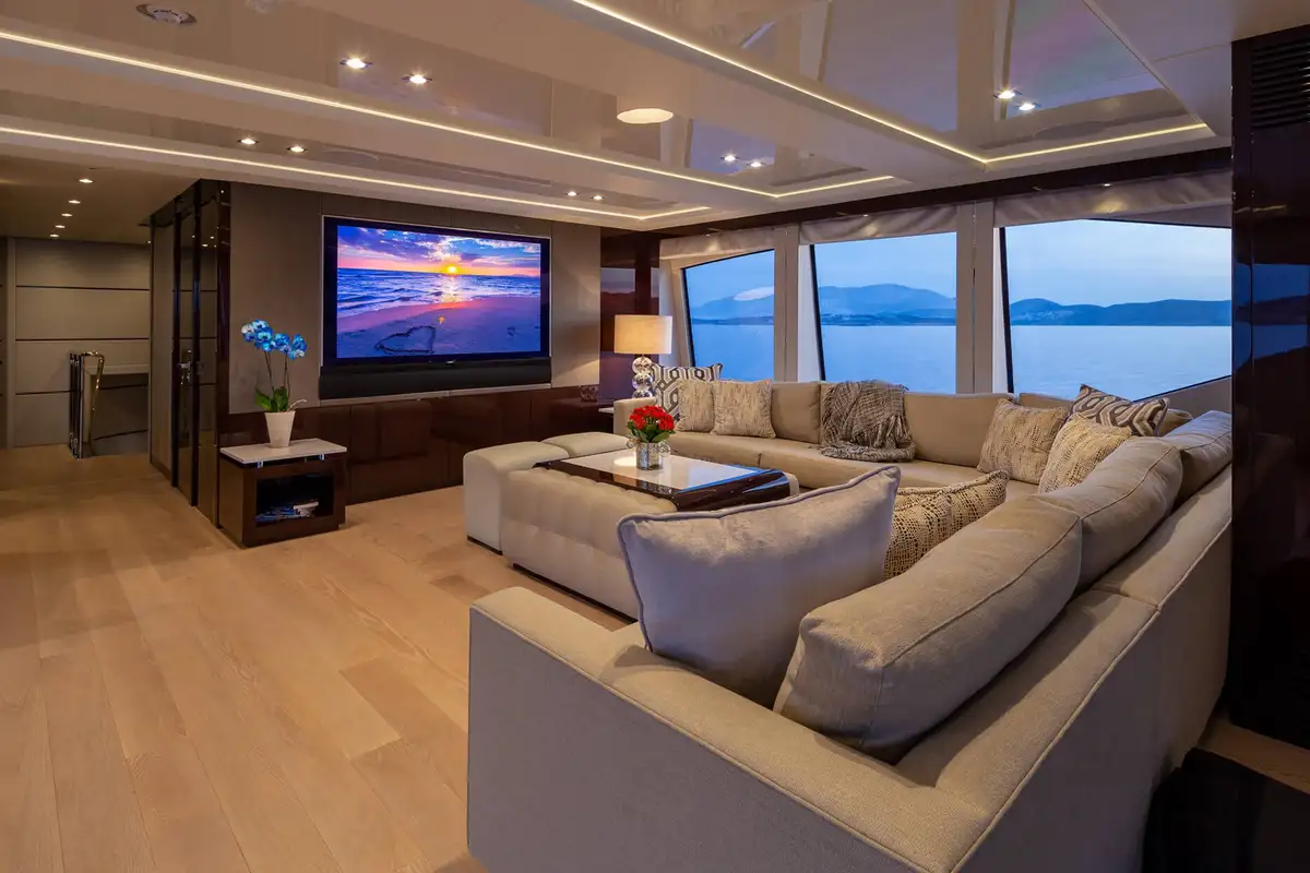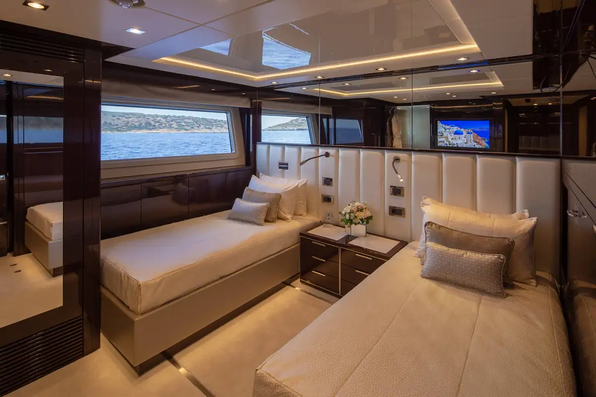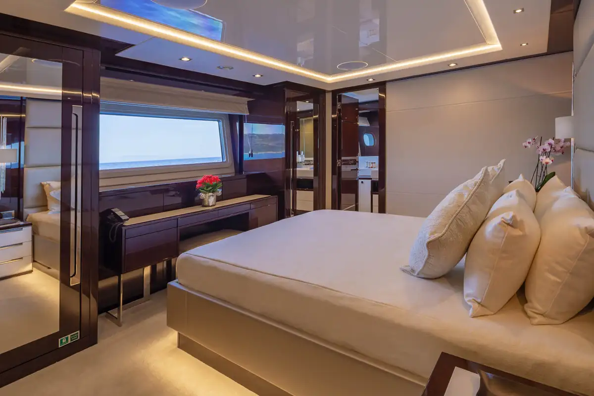 The master suite is an opulent full-beam cabin on the main deck with a lounge area on one side of the king size bed, a desk on the other and big windows on both sides. The en suite bathroom is a his-and-hers configuration with a rain room shower, twin sinks and two toilets. The other four guest cabins are two VIP doubles and two twins that convert to doubles, so she’ll easily adapt to your needs.